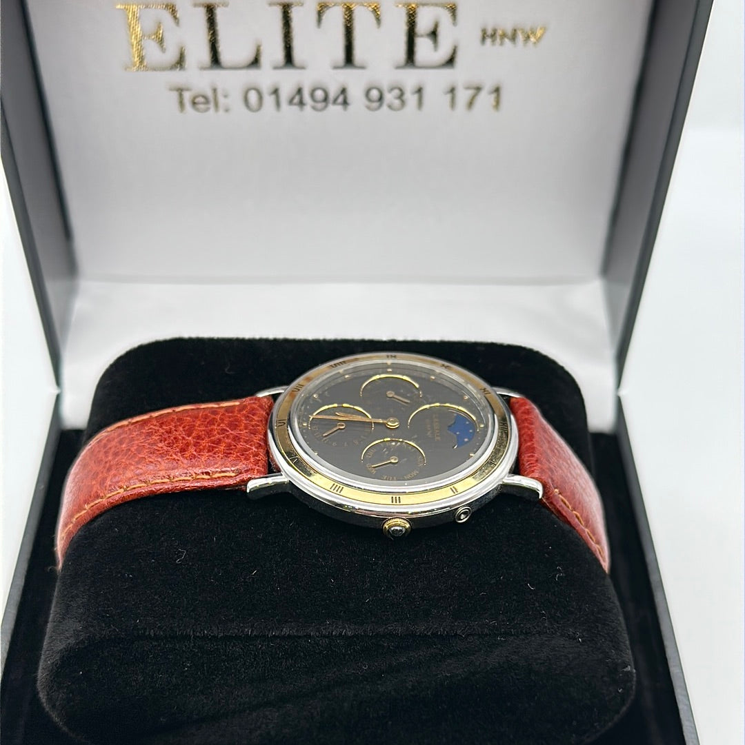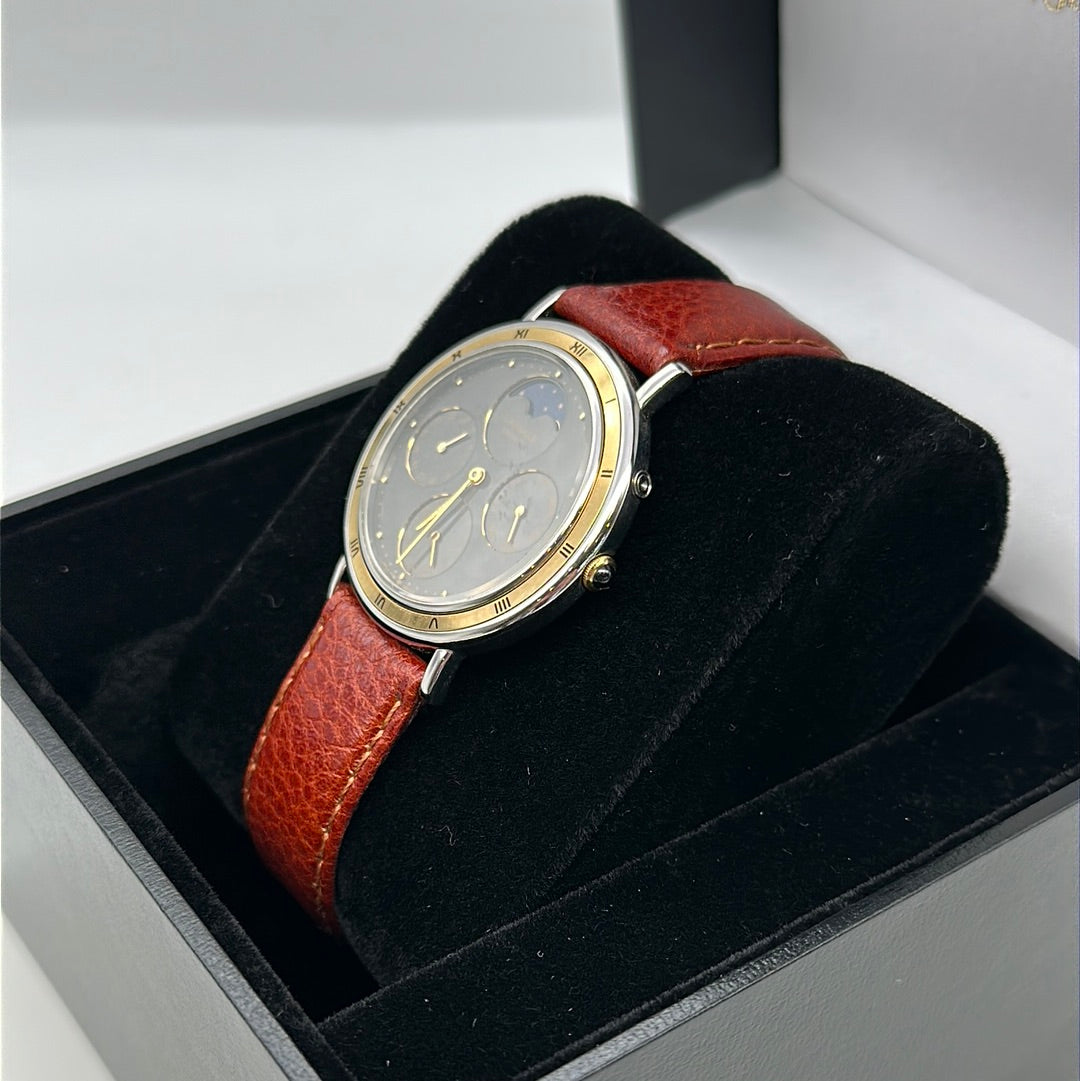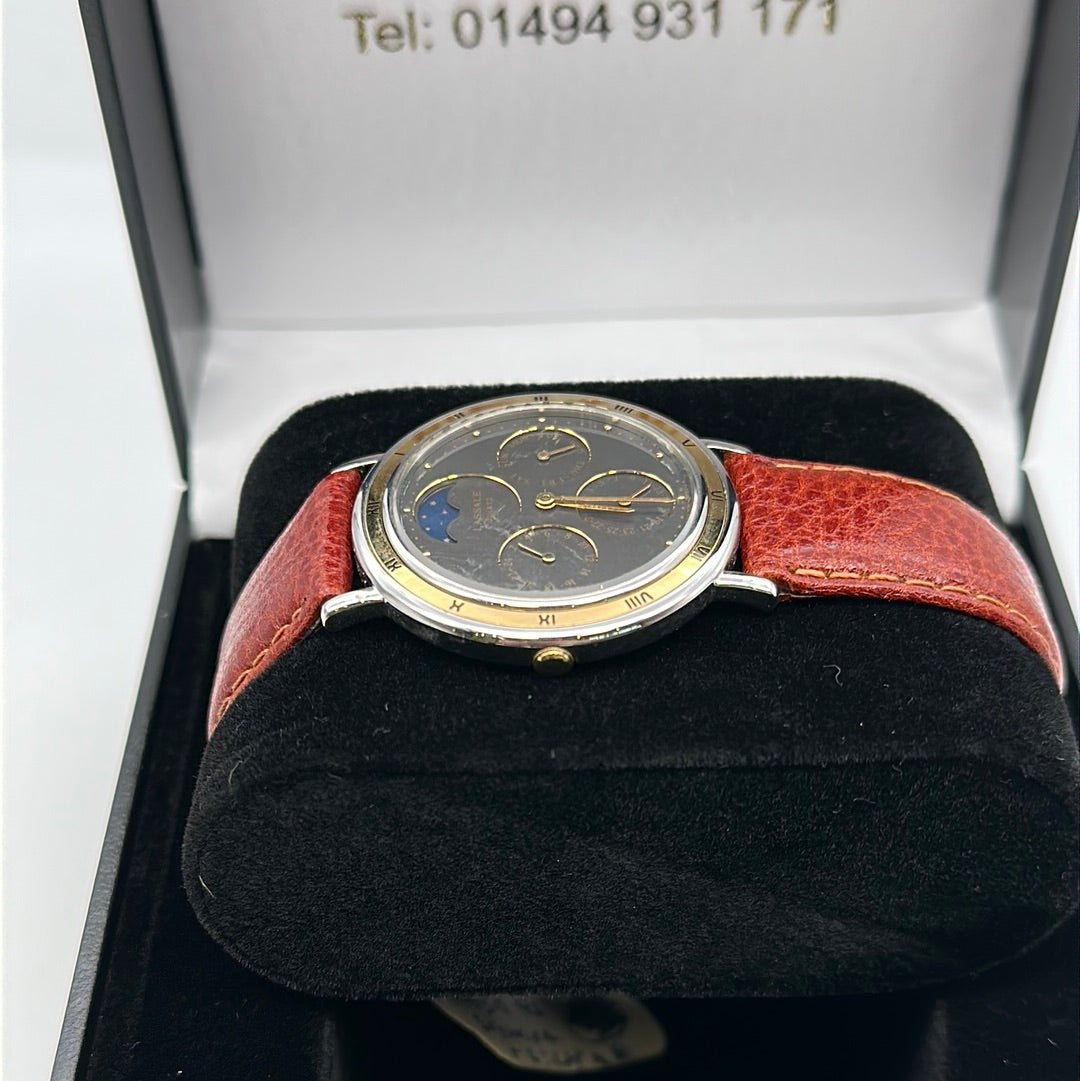 Seiko Lassale moonphase Watch in near unworn condition. This vintage LASSALE lunar calendar moonphase Quartz Watch in very Excellent cosmetic condition. Case is steel with a gold plate bezel, black dial. Hands are gold and original crystal is very clean. Case is 33mm wide excluding crown.