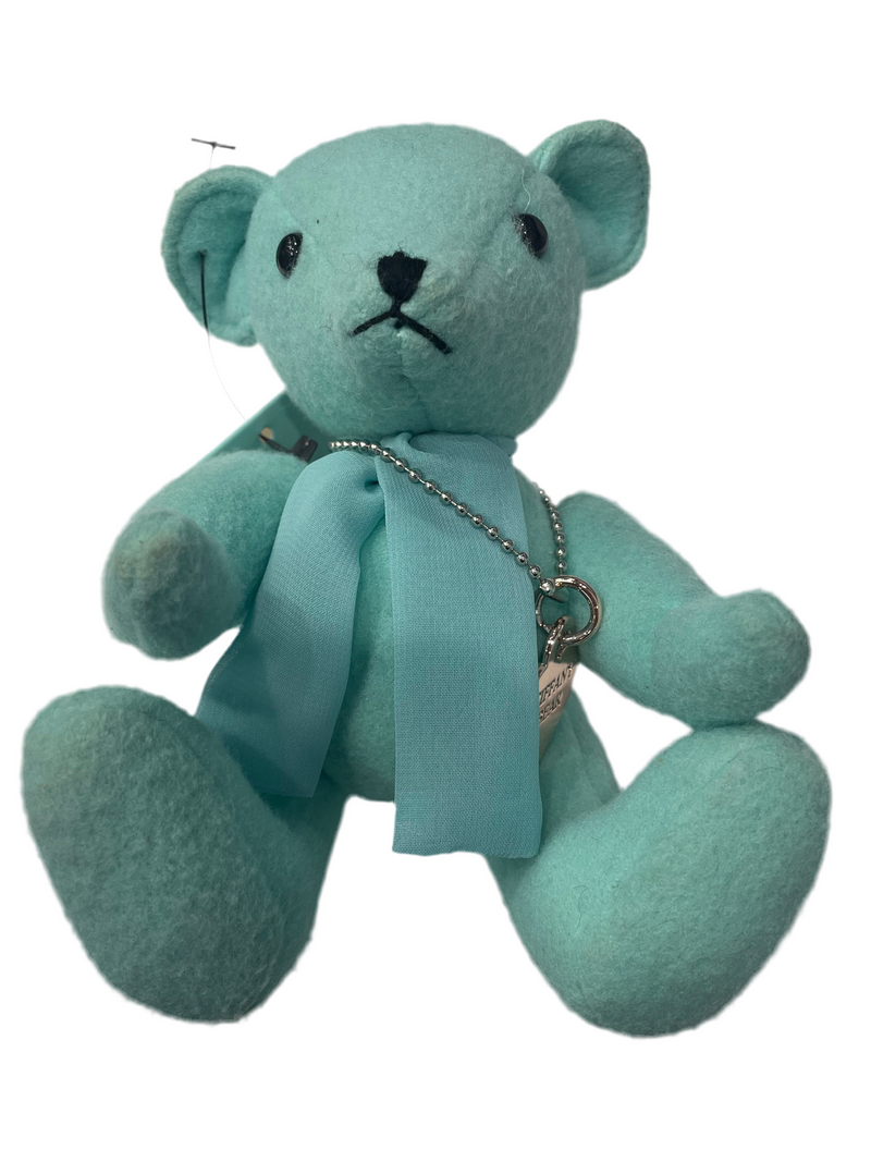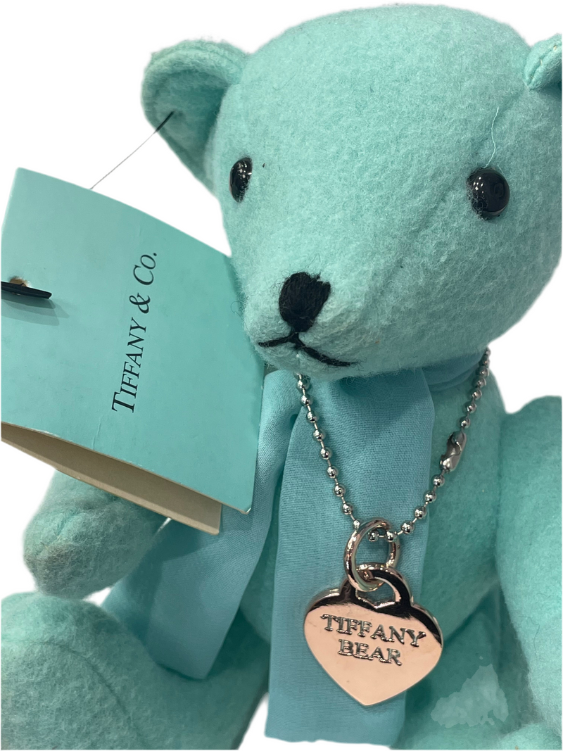 Very rare & brand new with tags Beautiful Tiffany & Co Rare Discontinued Cashmere Blue Authentic Soft Teddy Bear. Has a scarf & Tiffany & Co silver beaded love heart necklace detail.