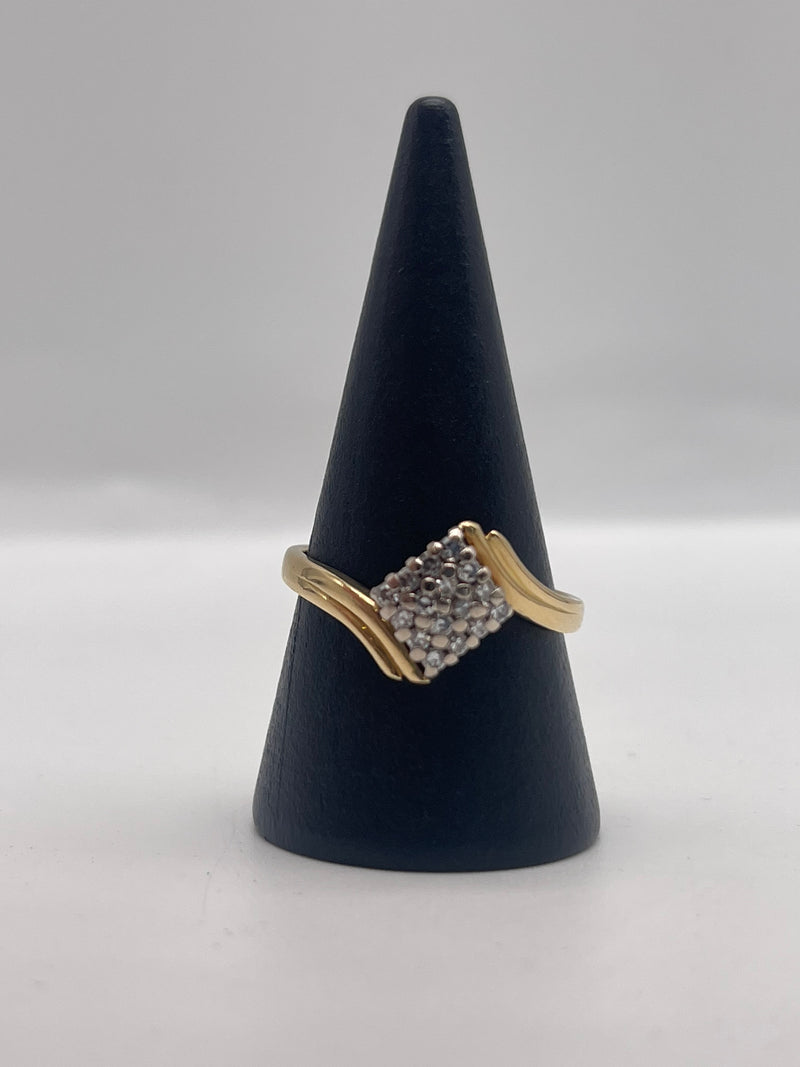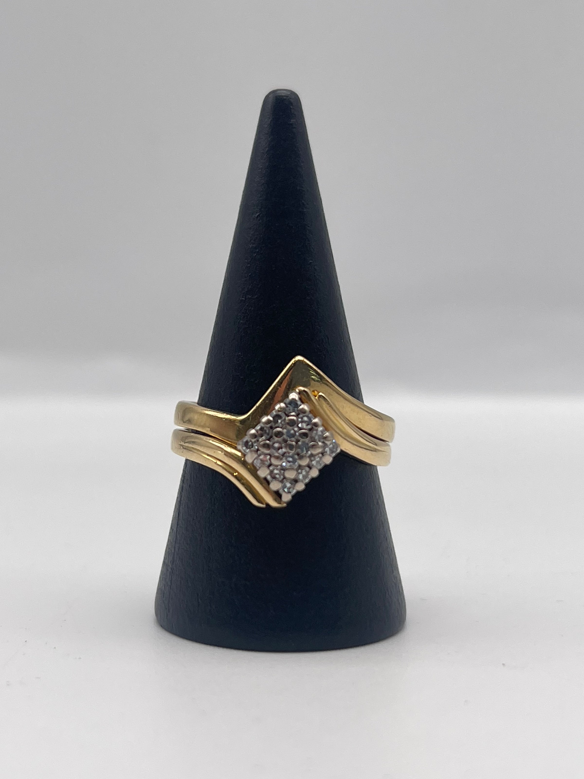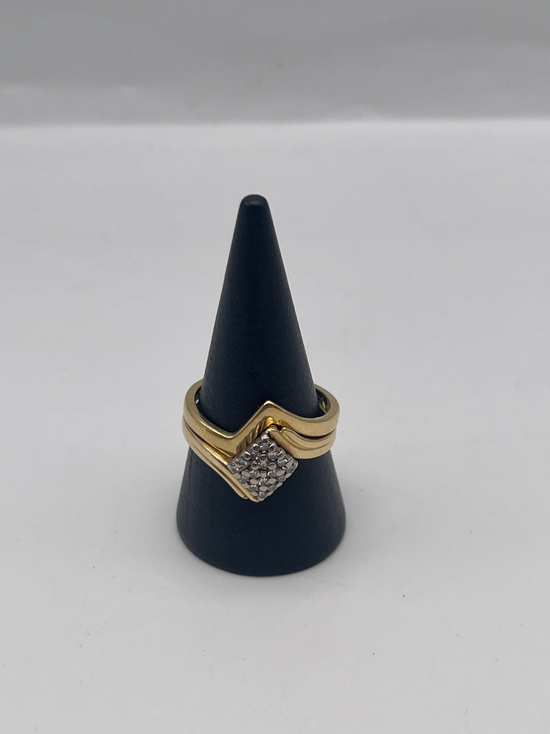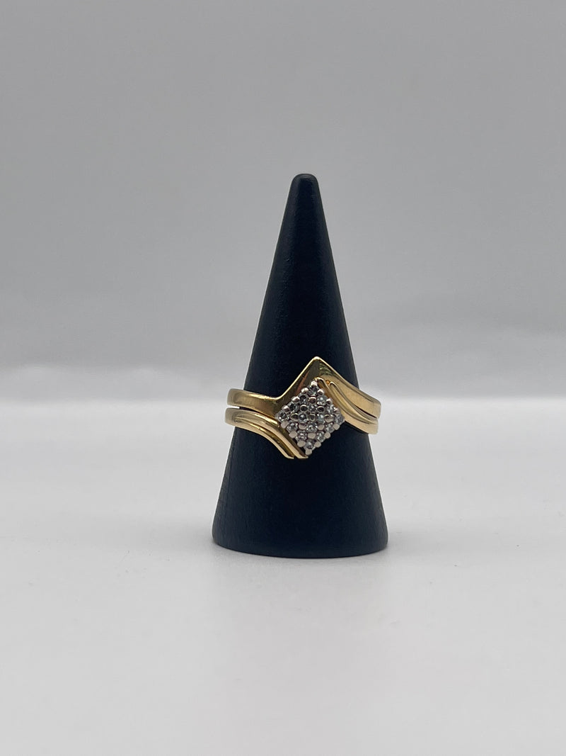 Vintage jewellery often carries a deep sense of history and craftsmanship, and this engagement and wedding band set is no exception. The interlocking design, paired with a beautiful diamond cluster, makes this piece not only a symbol of love but also a statement of enduring beauty and elegance. The yellow gold setting ensures that this piece remains as timeless as the commitment it represents.
