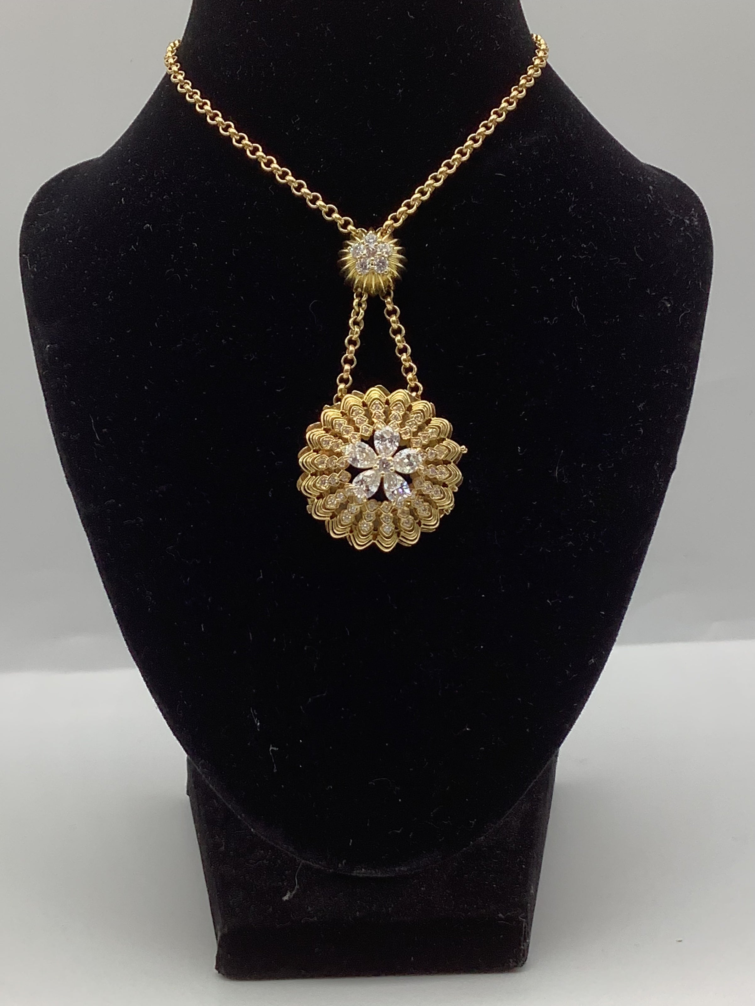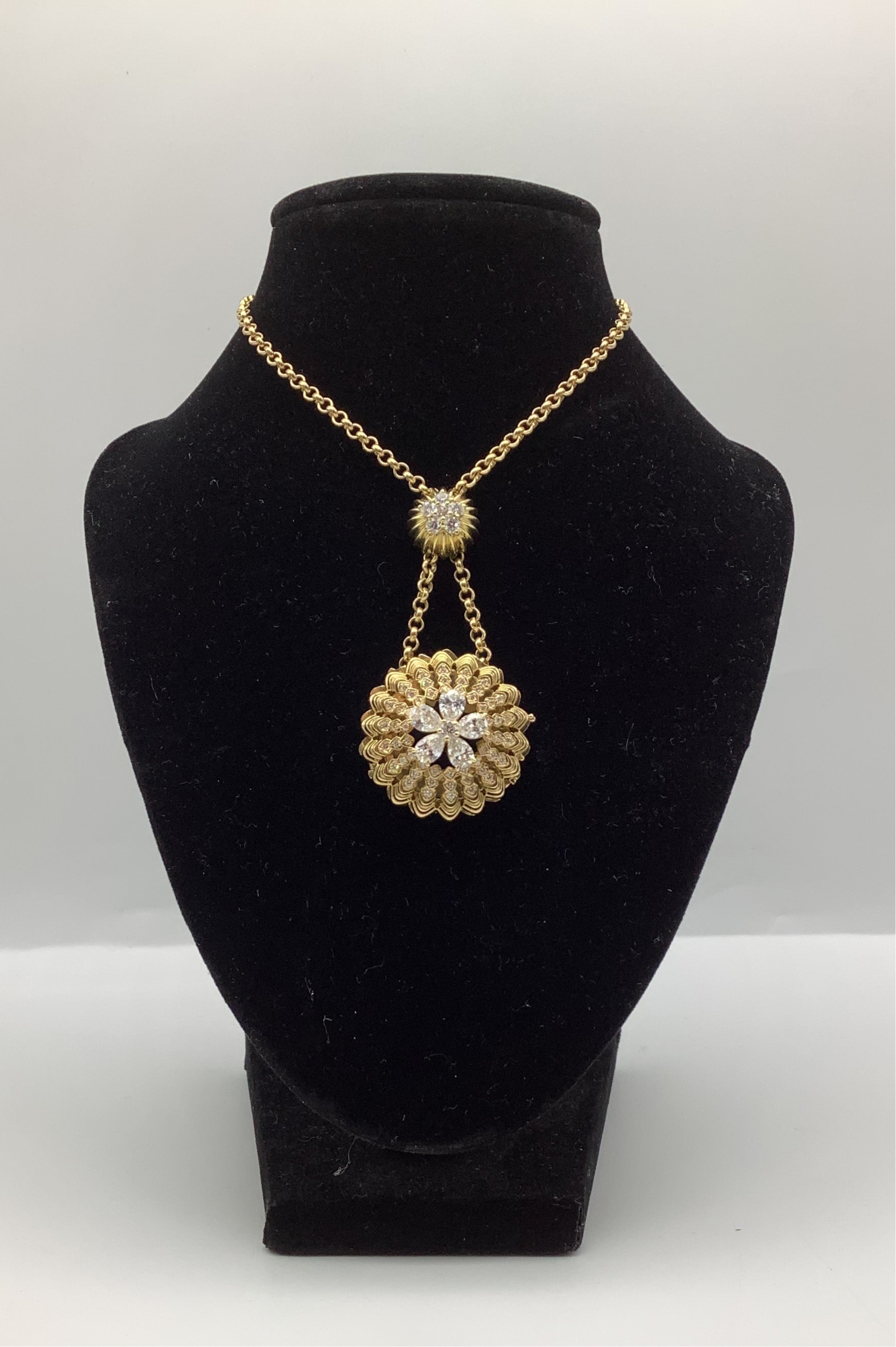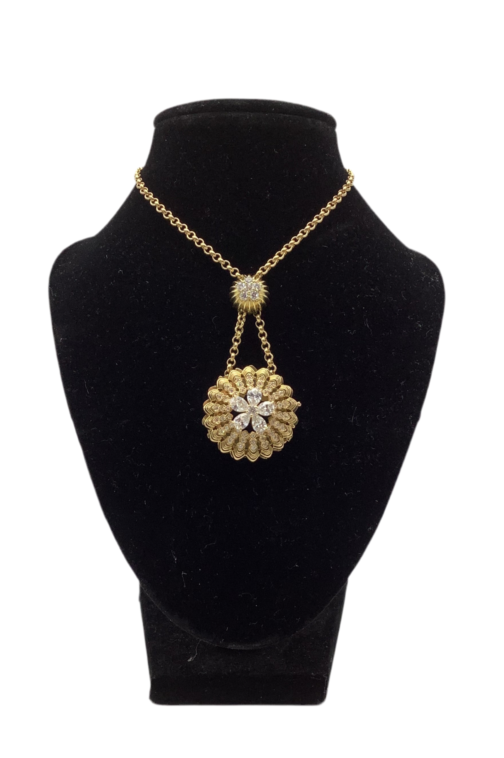 This exquisite 18ct yellow gold necklace is a versatile and elegant piece, designed to be worn as a double-length necklace or as a refined choker. The standout feature is a transformative pendant showcasing a central round brilliant-cut diamond, framed by five pear-shaped diamonds arranged in a delicate floral motif. Each stone is set in fine claw settings, maximising light exposure for exceptional brilliance. A discreet twisting mechanism within the pendant allows it to hinge open, offering flexibility in wear and an innovative touch of craftsmanship. -