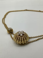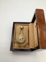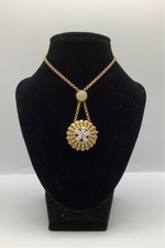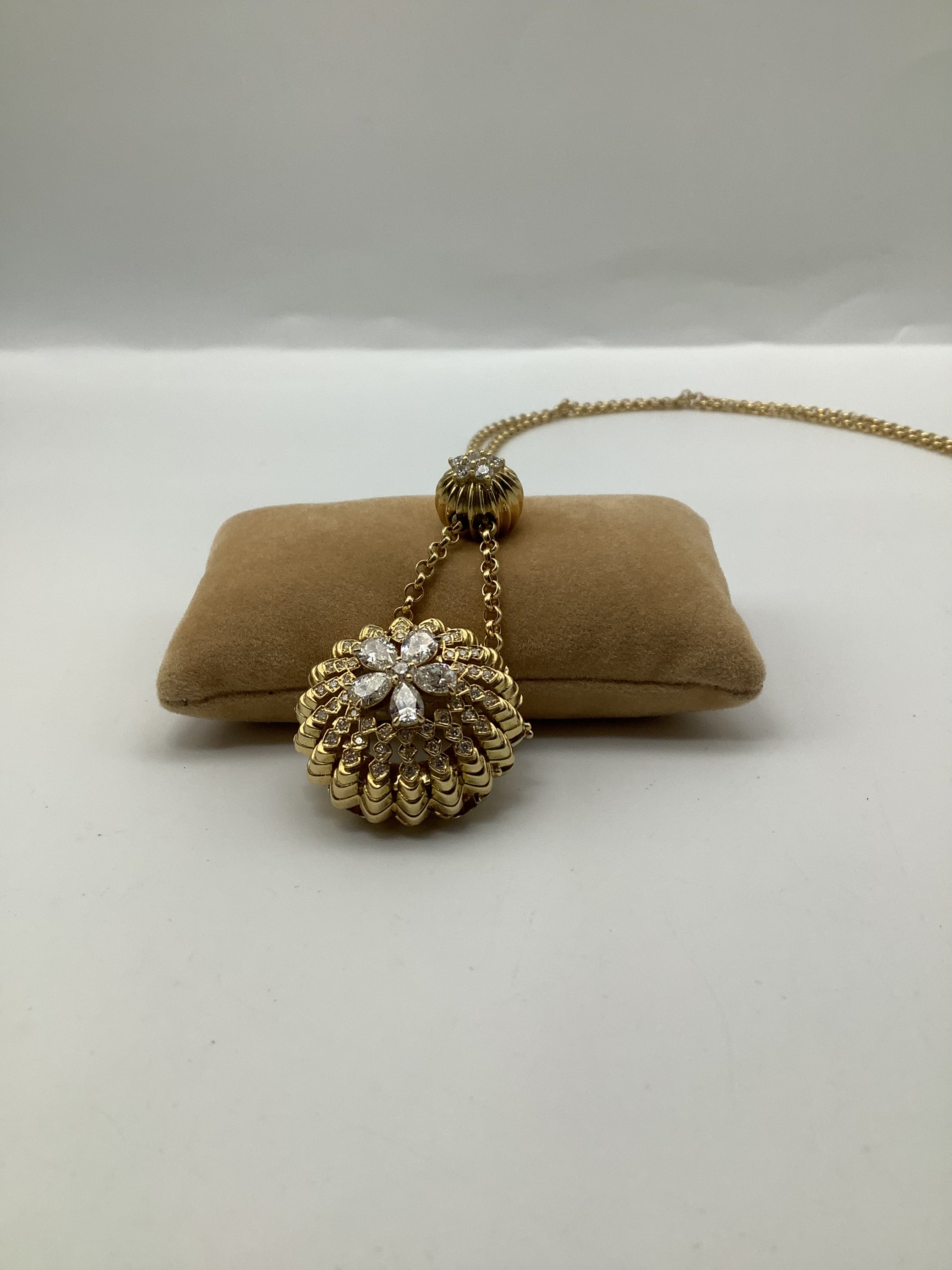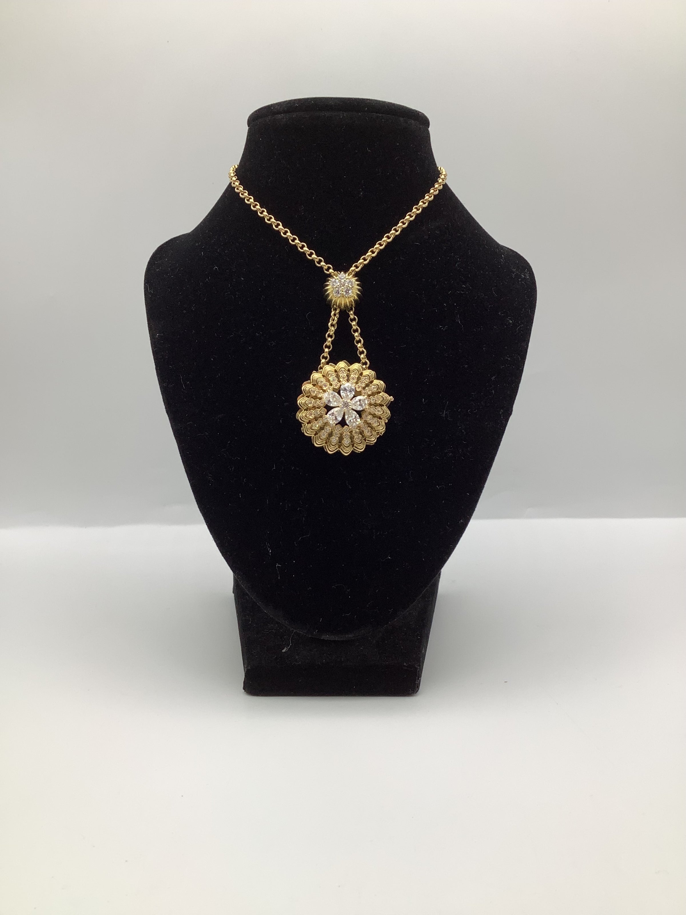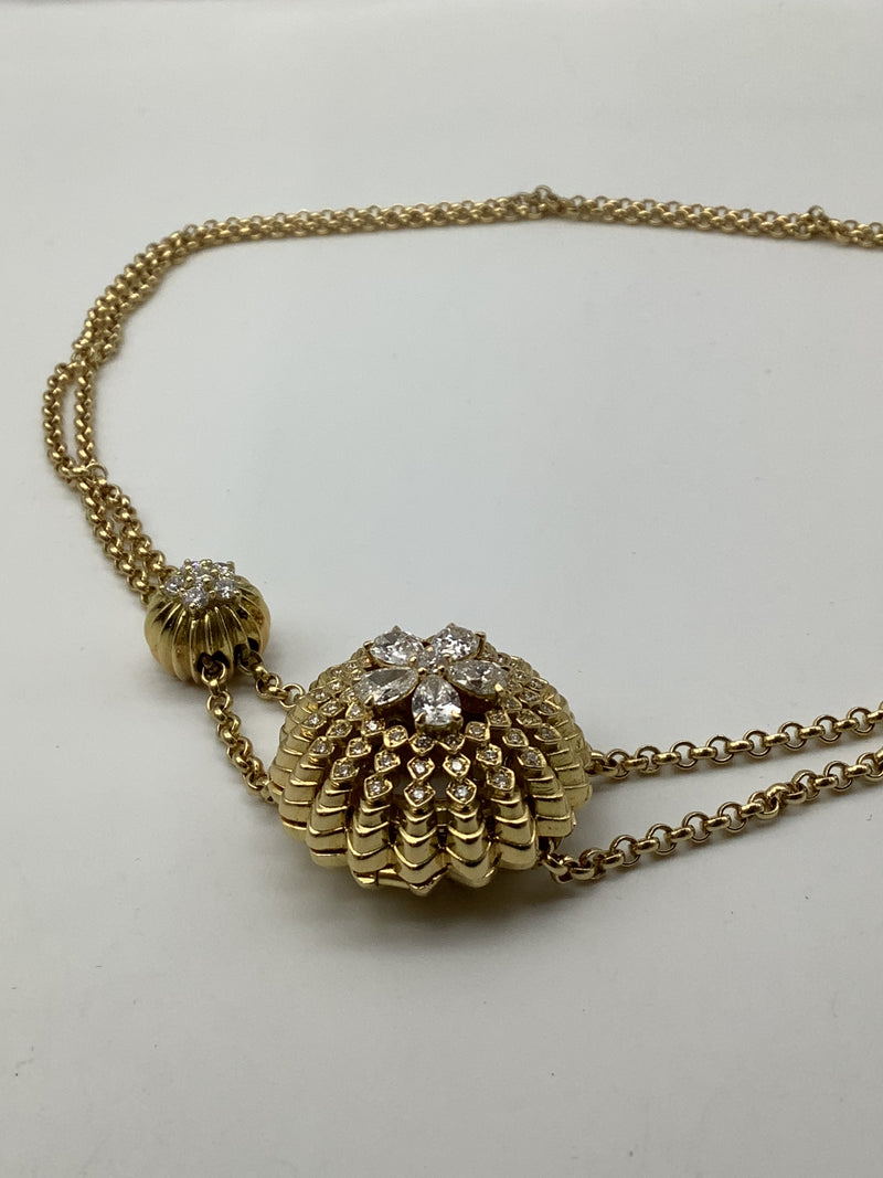 This exquisite 18ct yellow gold necklace is a versatile and elegant piece, designed to be worn as a double-length necklace or as a refined choker. The standout feature is a transformative pendant showcasing a central round brilliant-cut diamond, framed by five pear-shaped diamonds arranged in a delicate floral motif. Each stone is set in fine claw settings, maximising light exposure for exceptional brilliance. A discreet twisting mechanism within the pendant allows it to hinge open, offering flexibility in wear and an innovative touch of craftsmanship. -