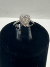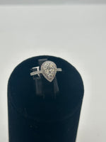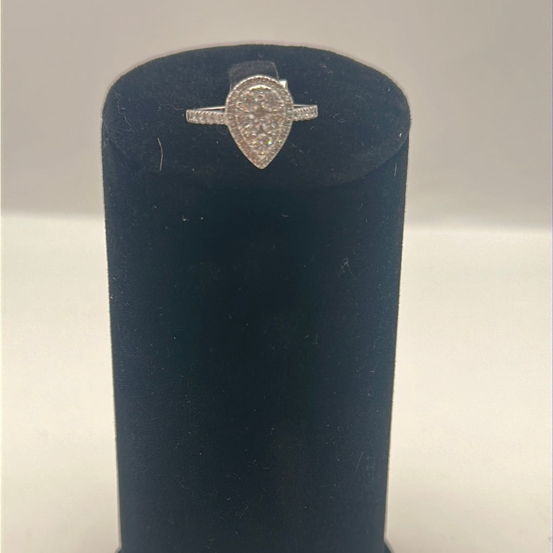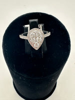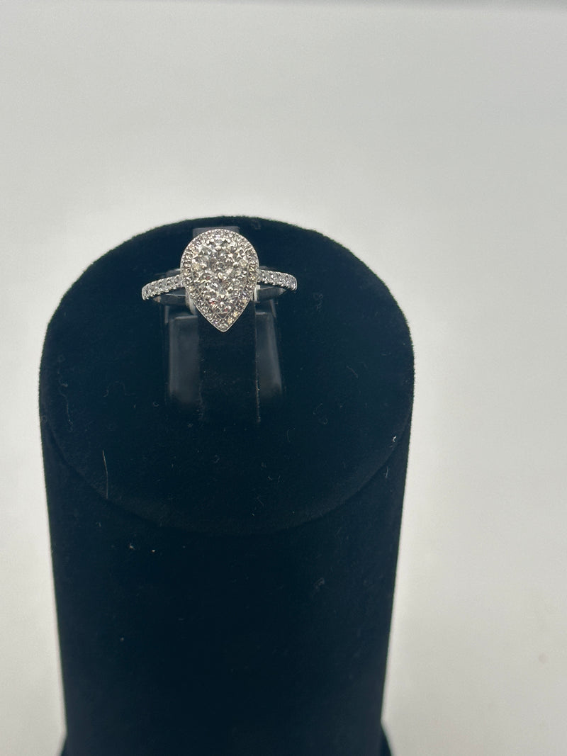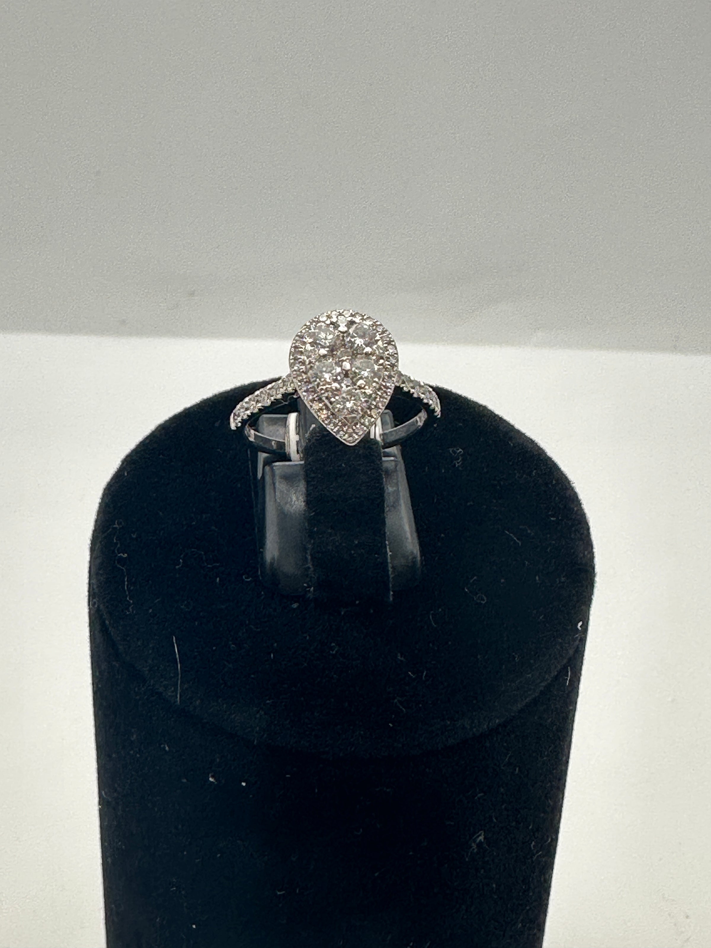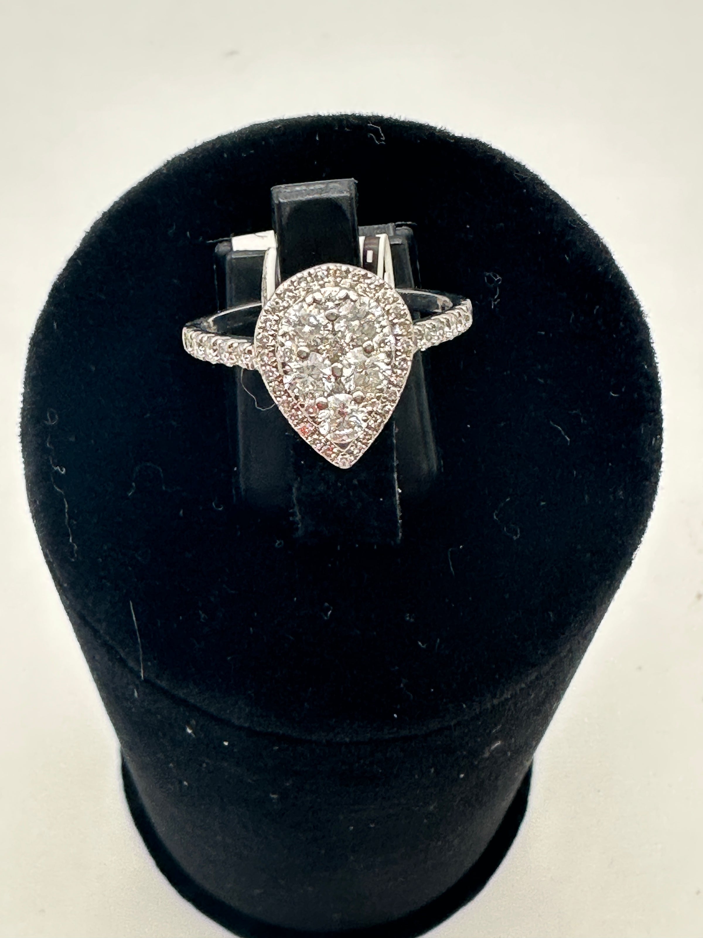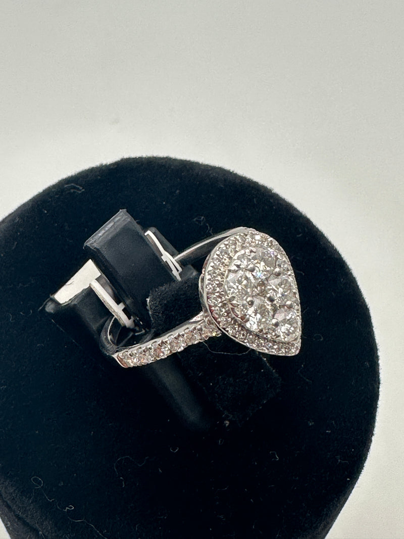 This stunning 18ct white gold diamond engagement ring is set with brilliant cut diamonds in a illusion setting in a pear shape with a halo of brilliant cut diamonds surrounding and running down the shoulders.