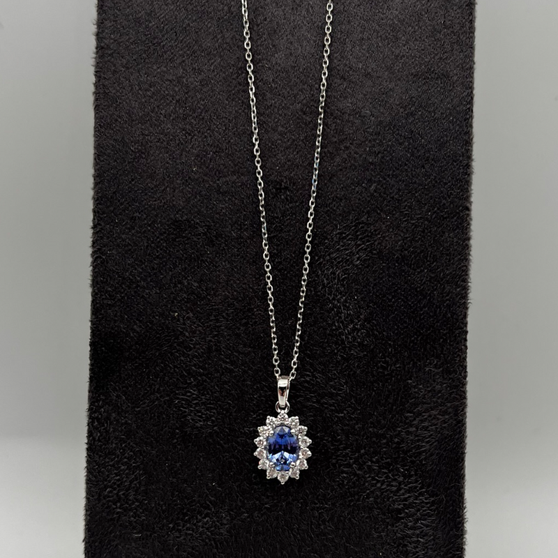A stunning 18ct White Gold Sapphire And Diamond Cluster Necklace to adorn your outfit adding further to your sophistication and style.