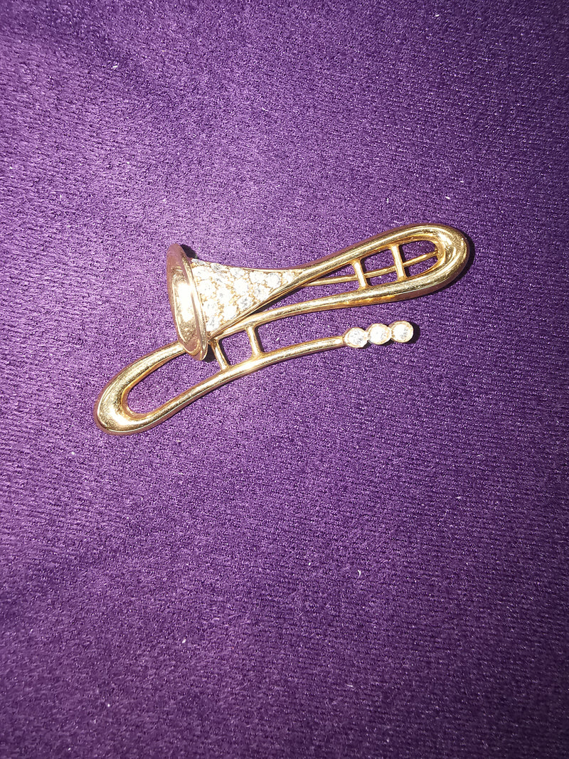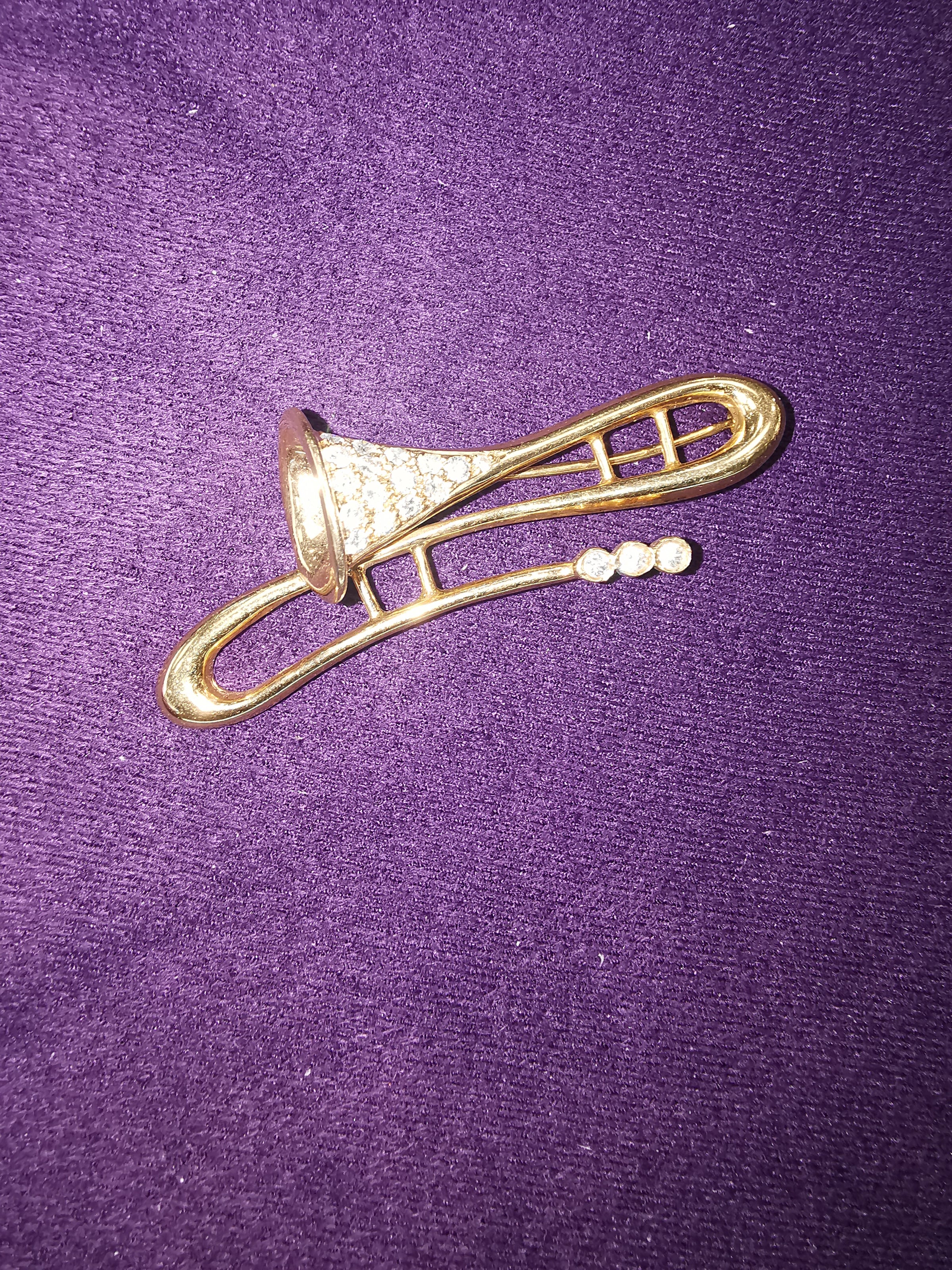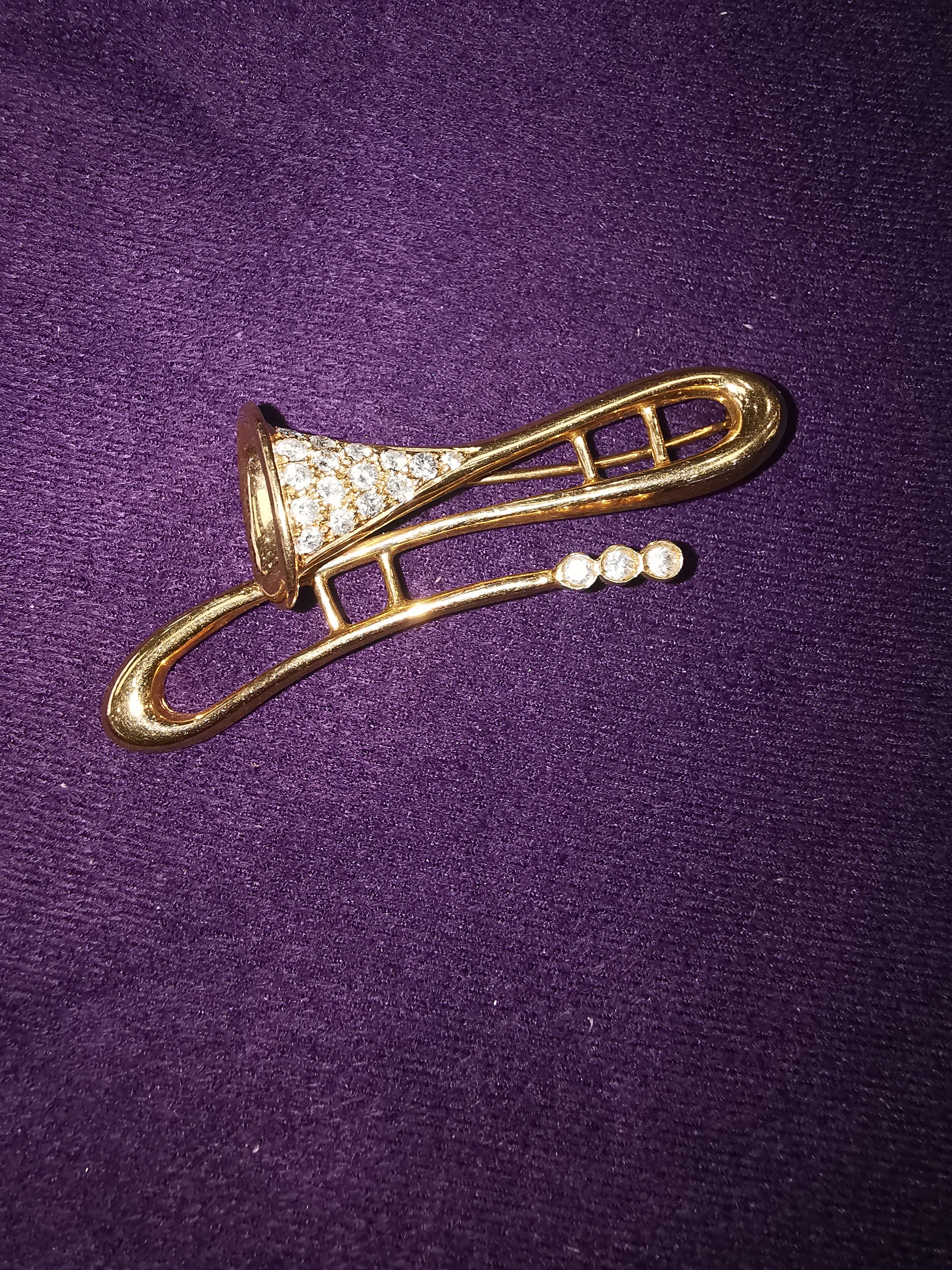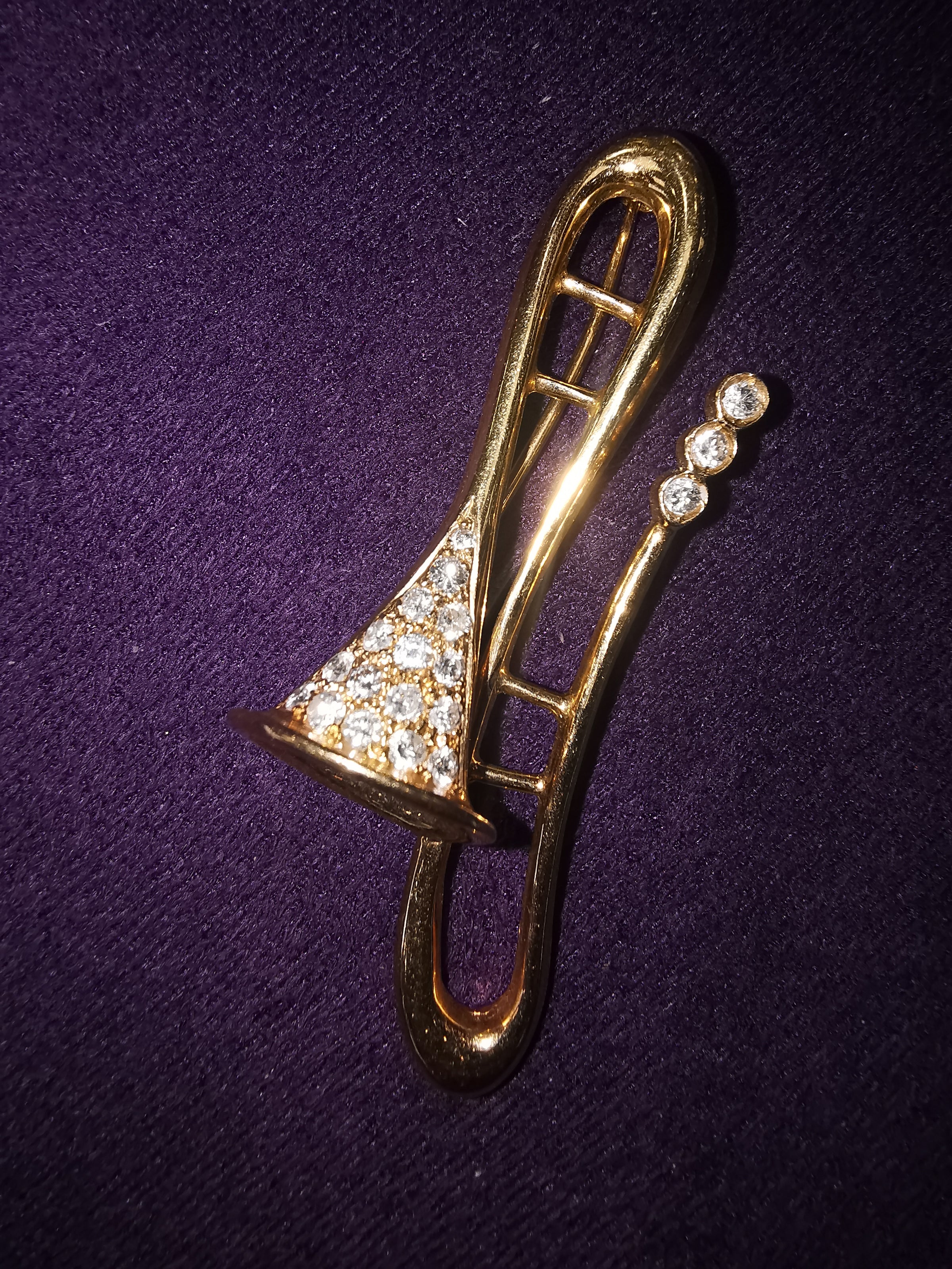 Introducing our 18ct Yellow Gold Diamond Trumpet Brooch, a harmonious blend of musical artistry and exquisite craftsmanship. This brooch is meticulously designed to resemble a trumpet, capturing the instrument's elegant curves and intricate details. Adorned with brilliant-cut diamonds in both pavé and rub-over settings, it offers a captivating sparkle that enhances its luxurious appeal.