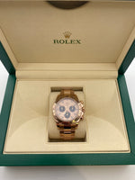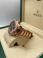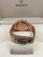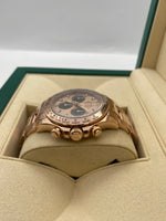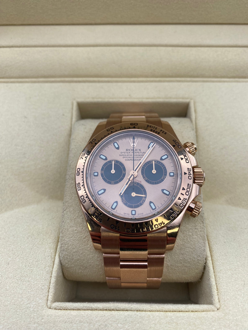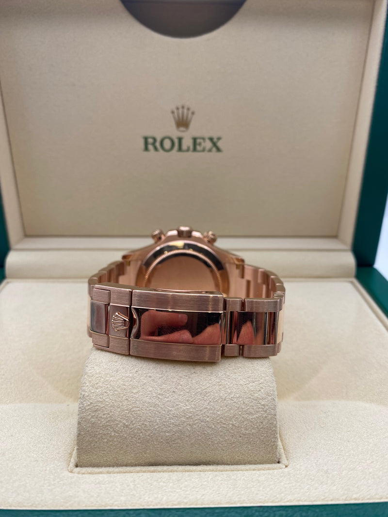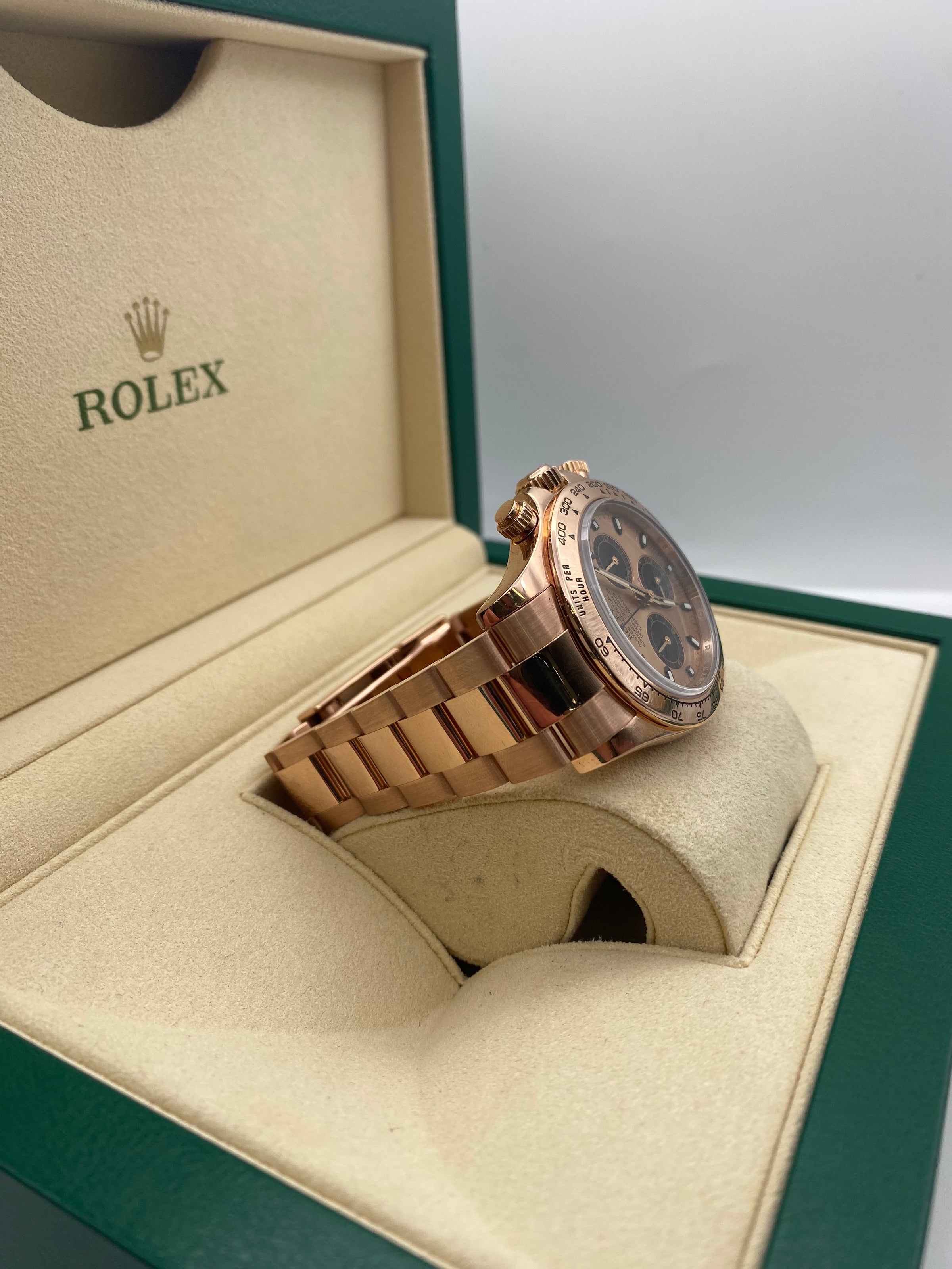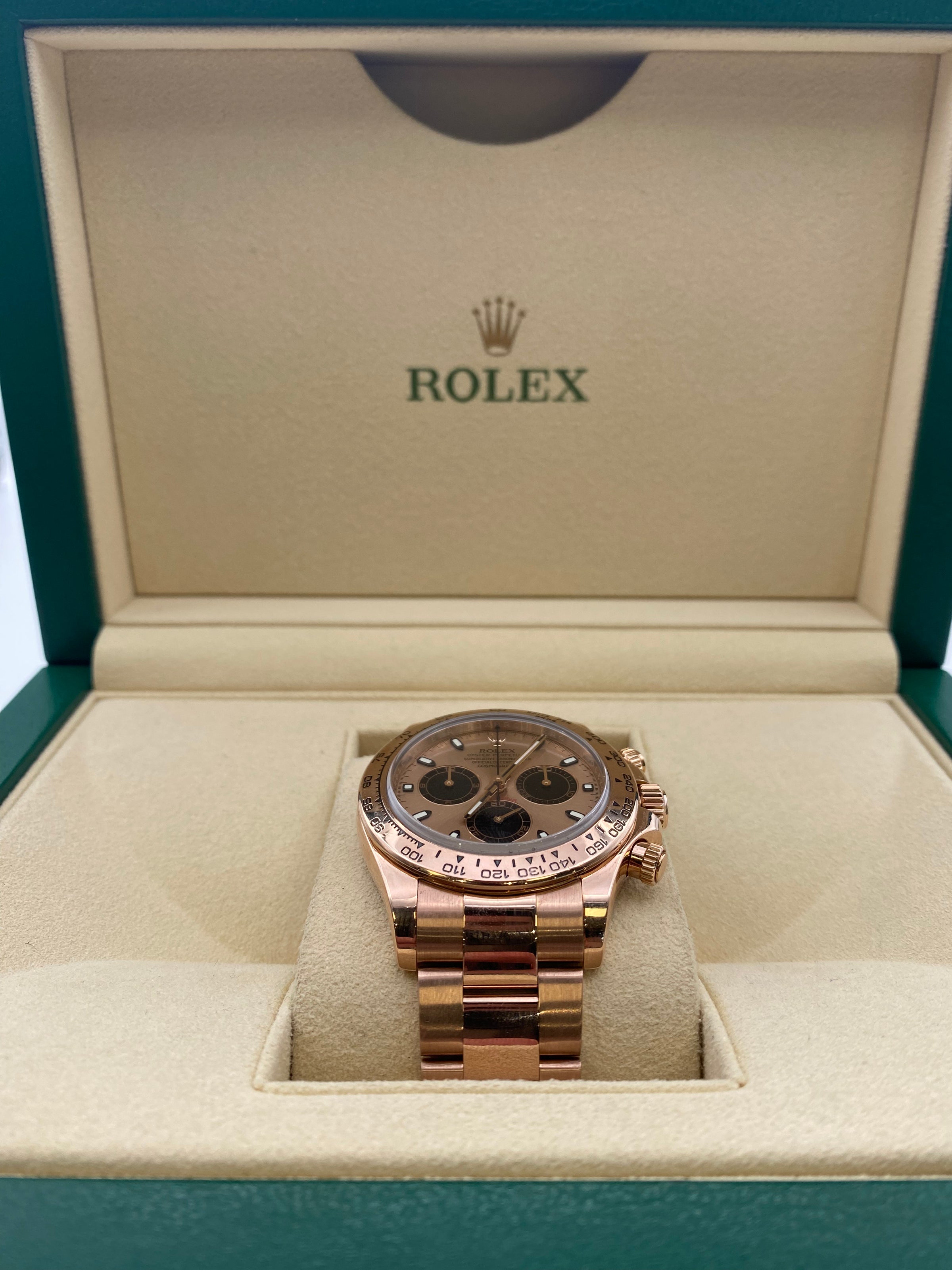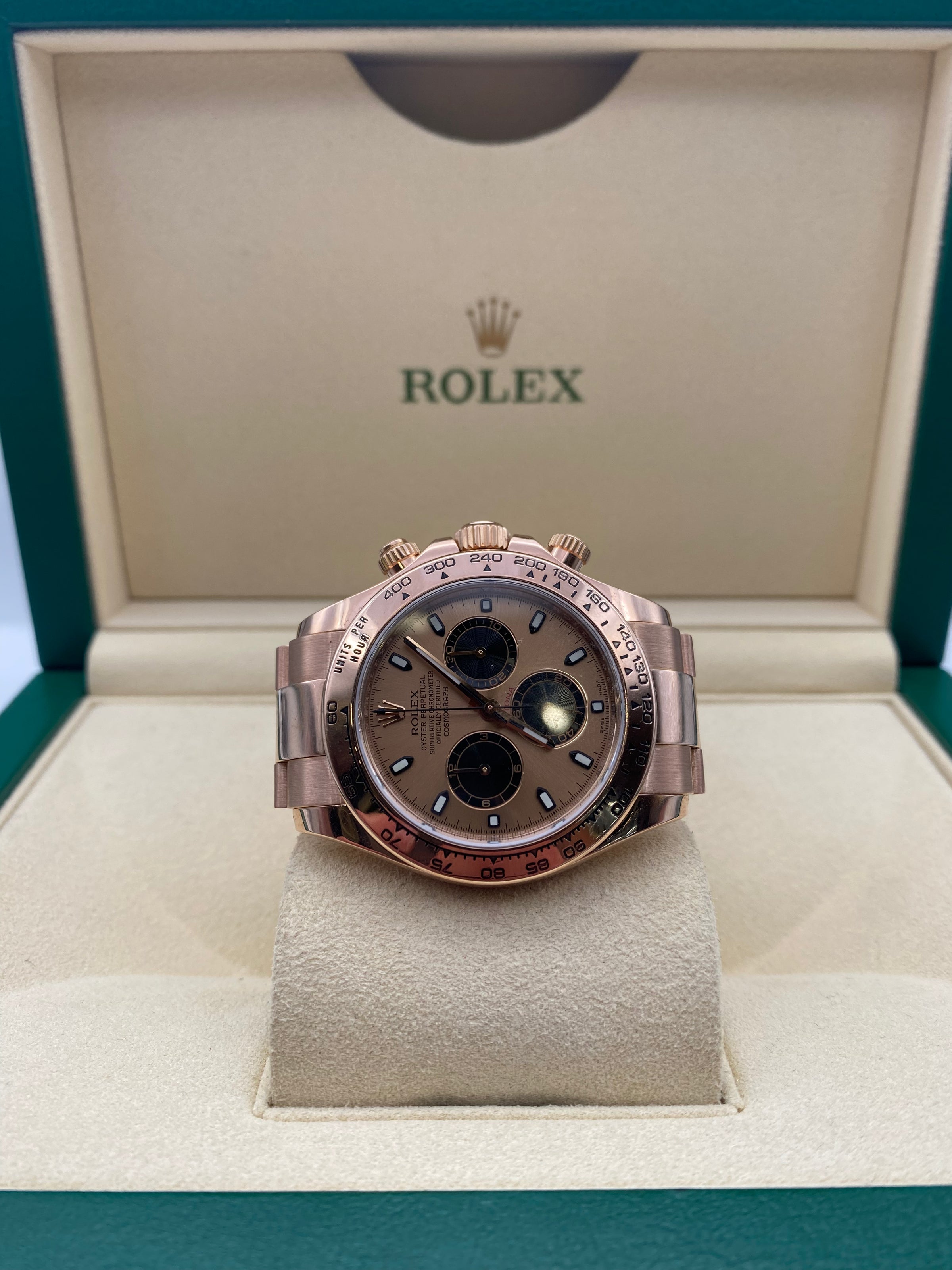 This Stunning Rolex Cosmograph Daytona features a 40mm solid 18k rose gold case, rose sunburst dial with intense black sub dials, screw down crown and a solid 18k rose gold oyster bracelet.