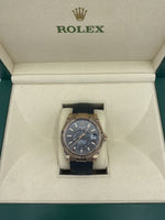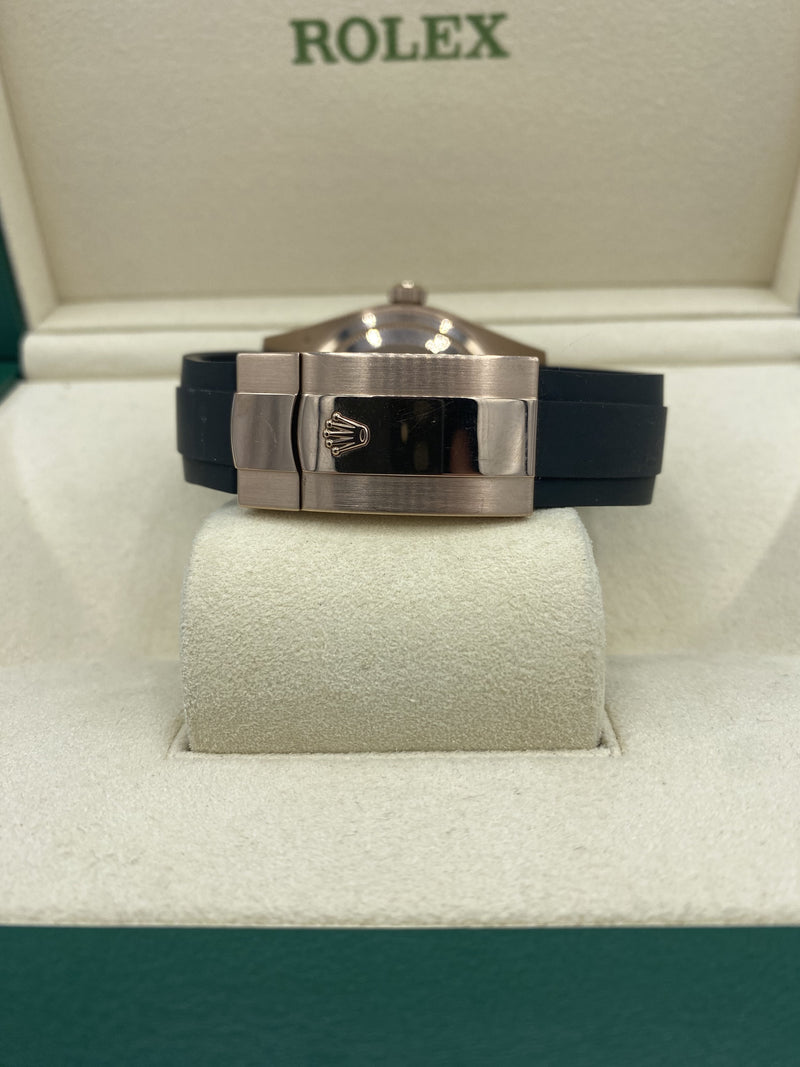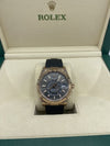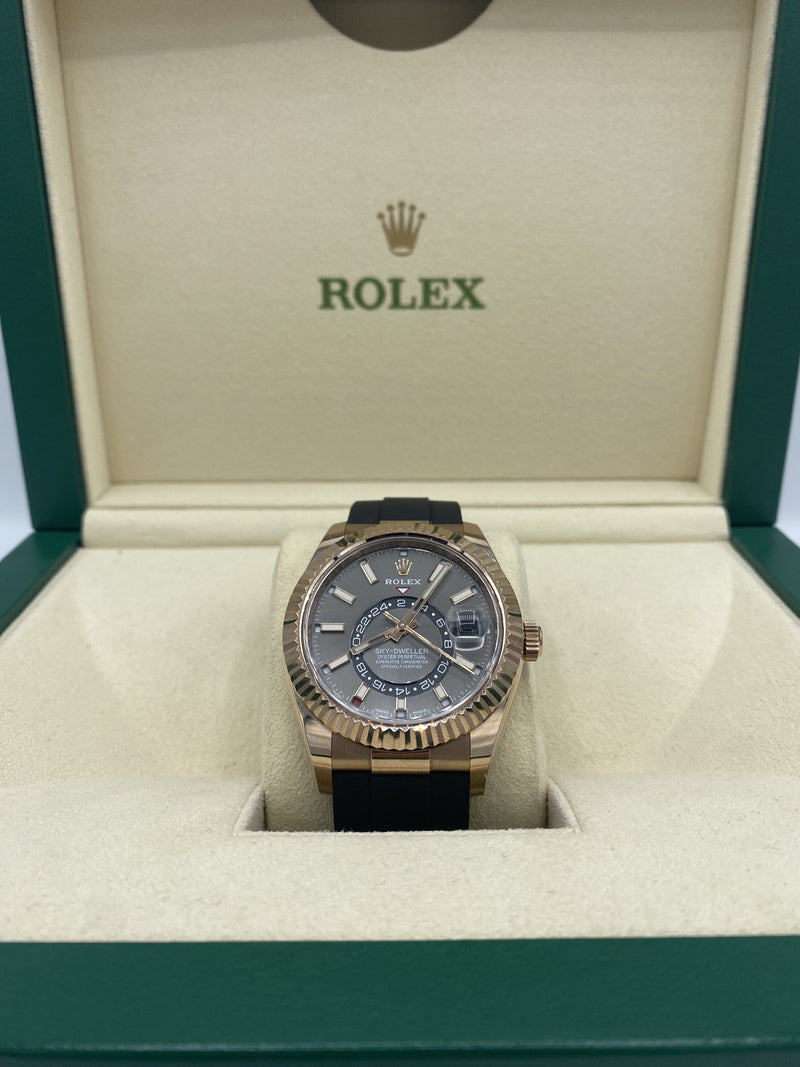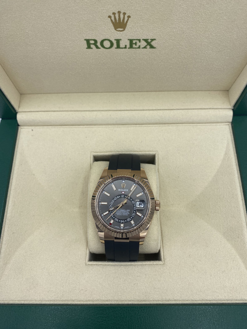 This rose gold Rolex sky-dweller features a 42mm rose gold case, slate dial and a oyster flex bracelet with a rose gold clasp. This model is the most complex movement Rolex have ever manufactured featuring two time zones, a date display, and an annual calendar.