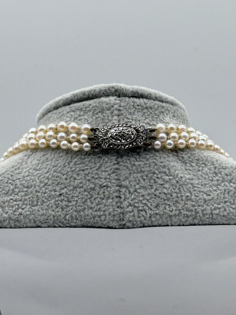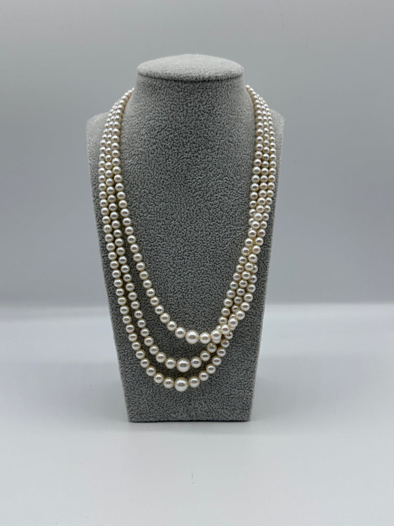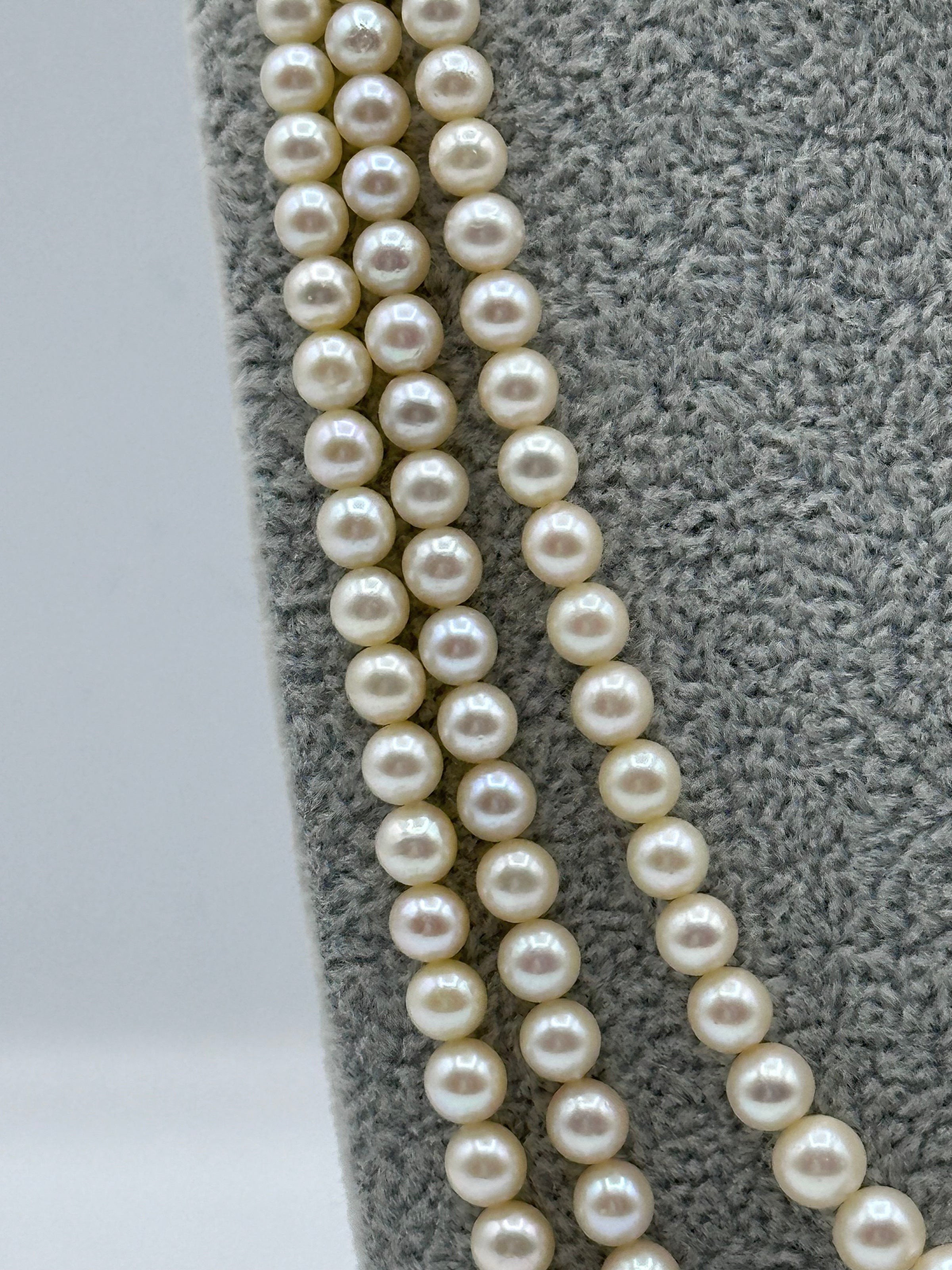 Beautiful three row pearl necklace set with graduated cultured pearls with a beautiful pearl clasp securing all three rows. Comes in original box.