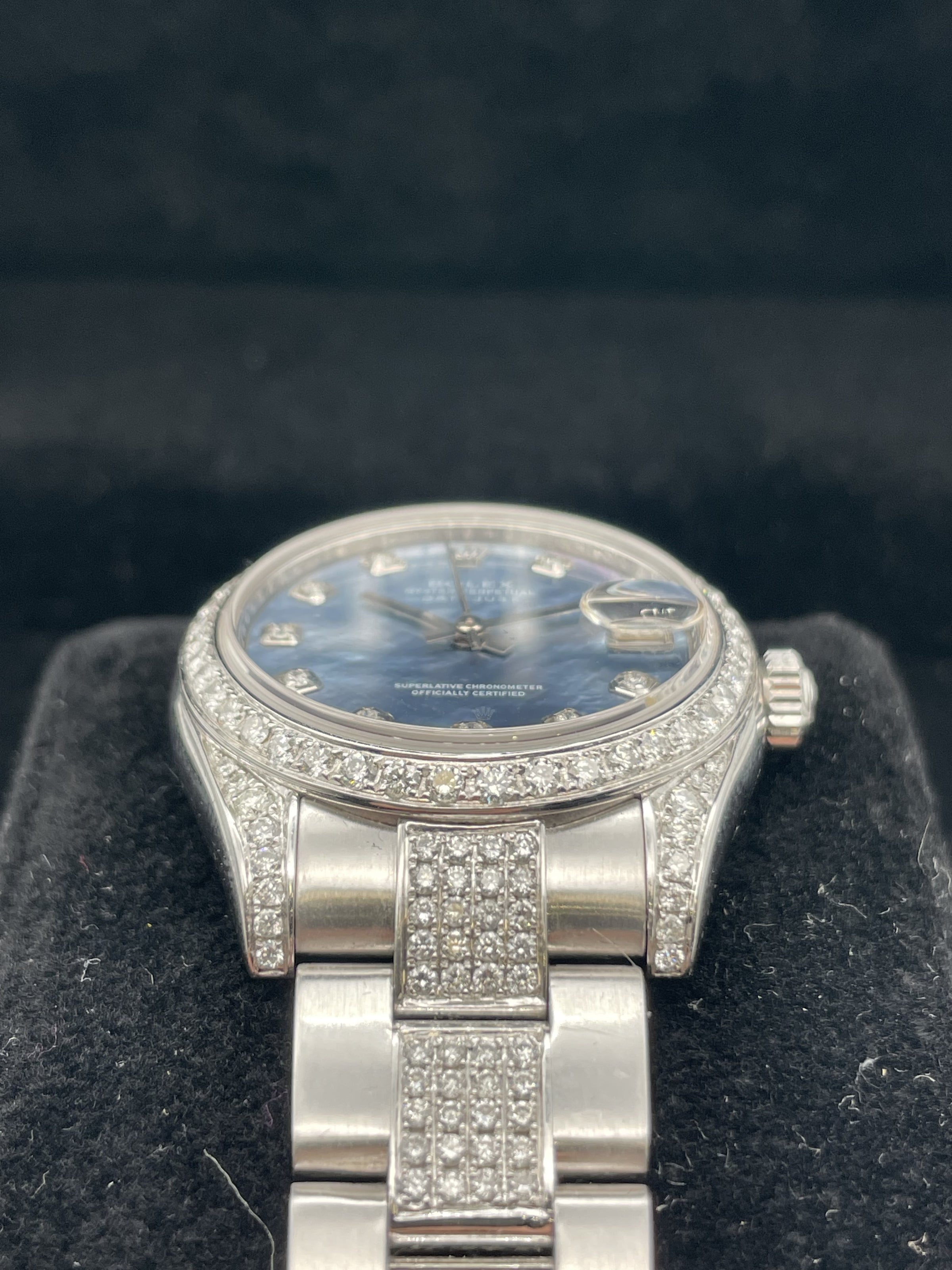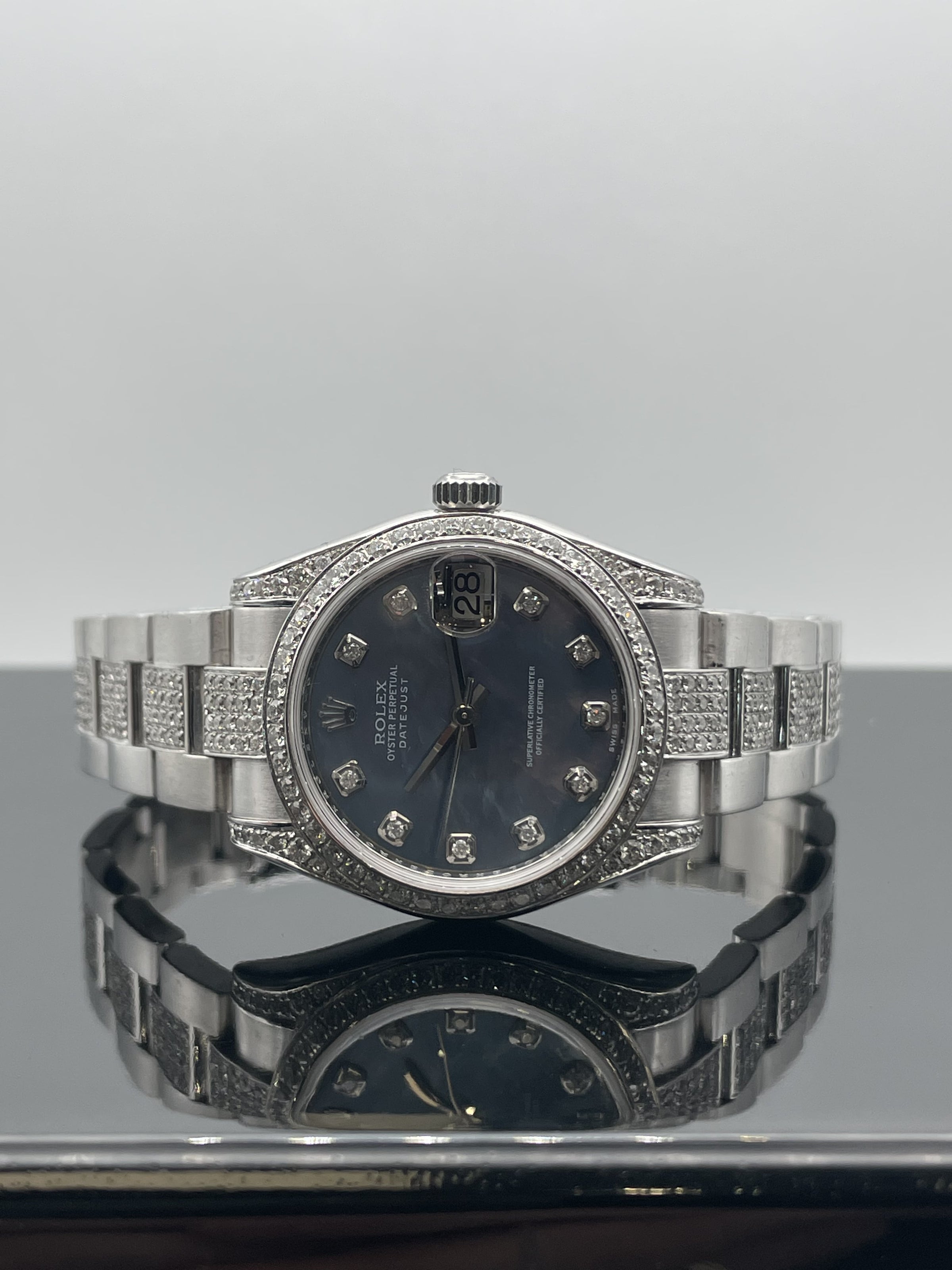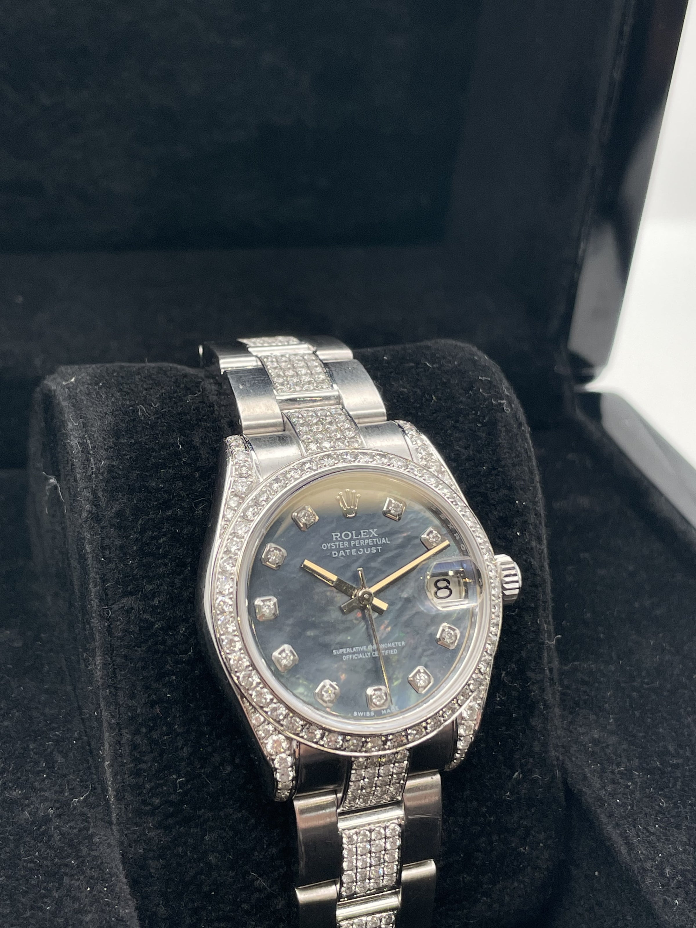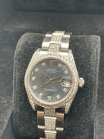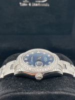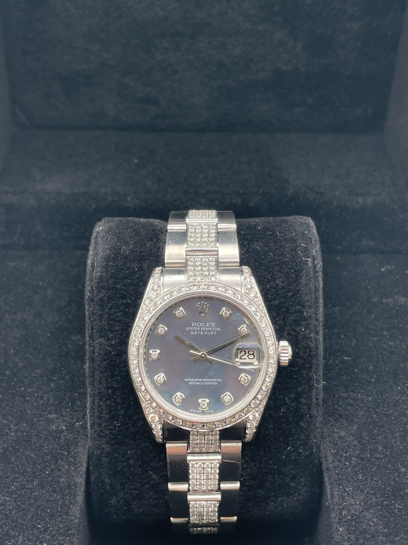 This stunning Rolex ladies datejust features a 31mm oyster steel case, oyster bracelet, blue marble dial with diamond set hour markers, diamond set bezel and a oyster steel bracelet with diamond set centre links. This watch has been set with aftermarket diamonds which means the diamonds have not been set by Rolex themselves. The diamonds have been set by "Time 4 Diamonds" who have done an exceptional job with setting these beautiful stones.