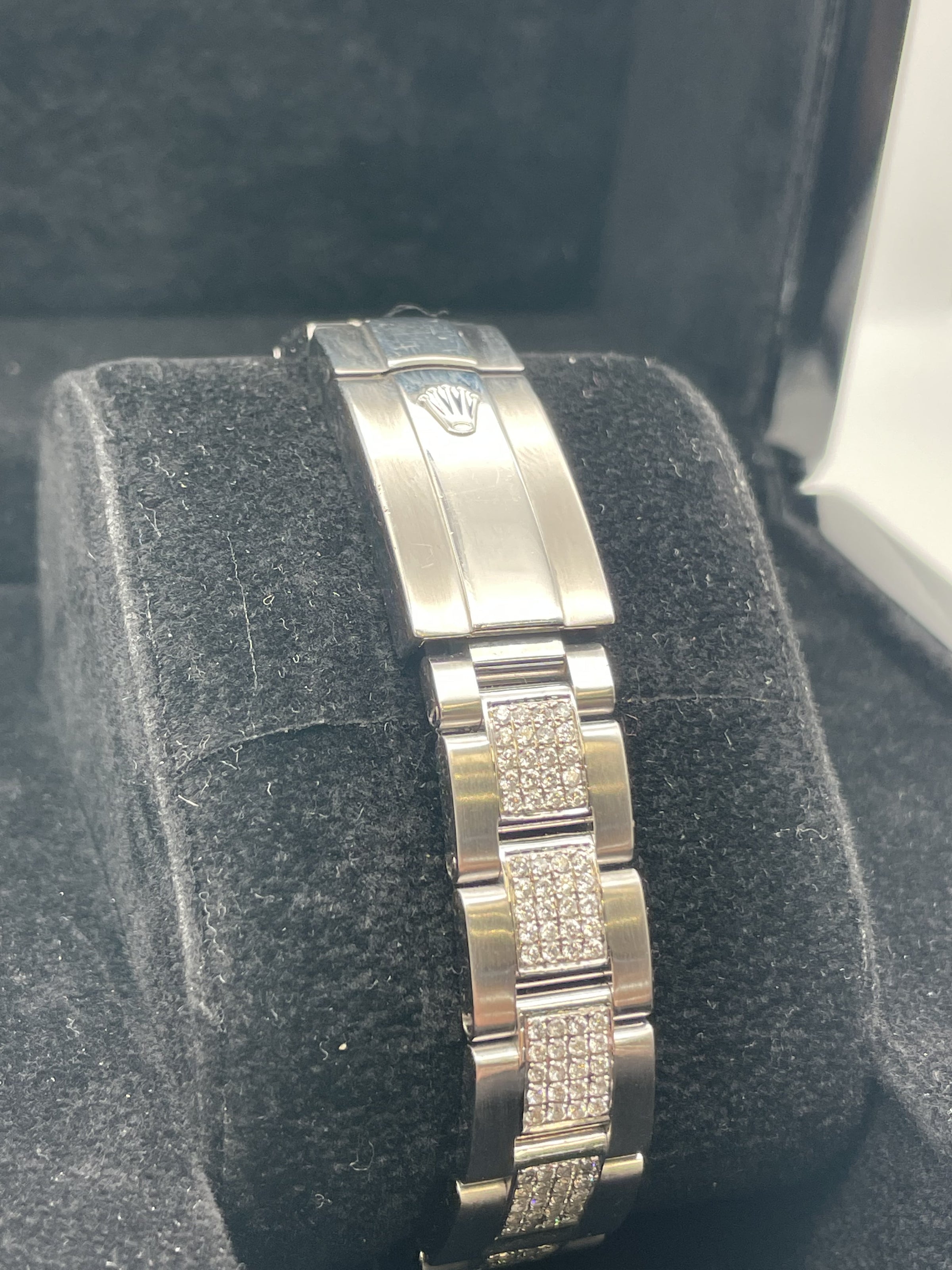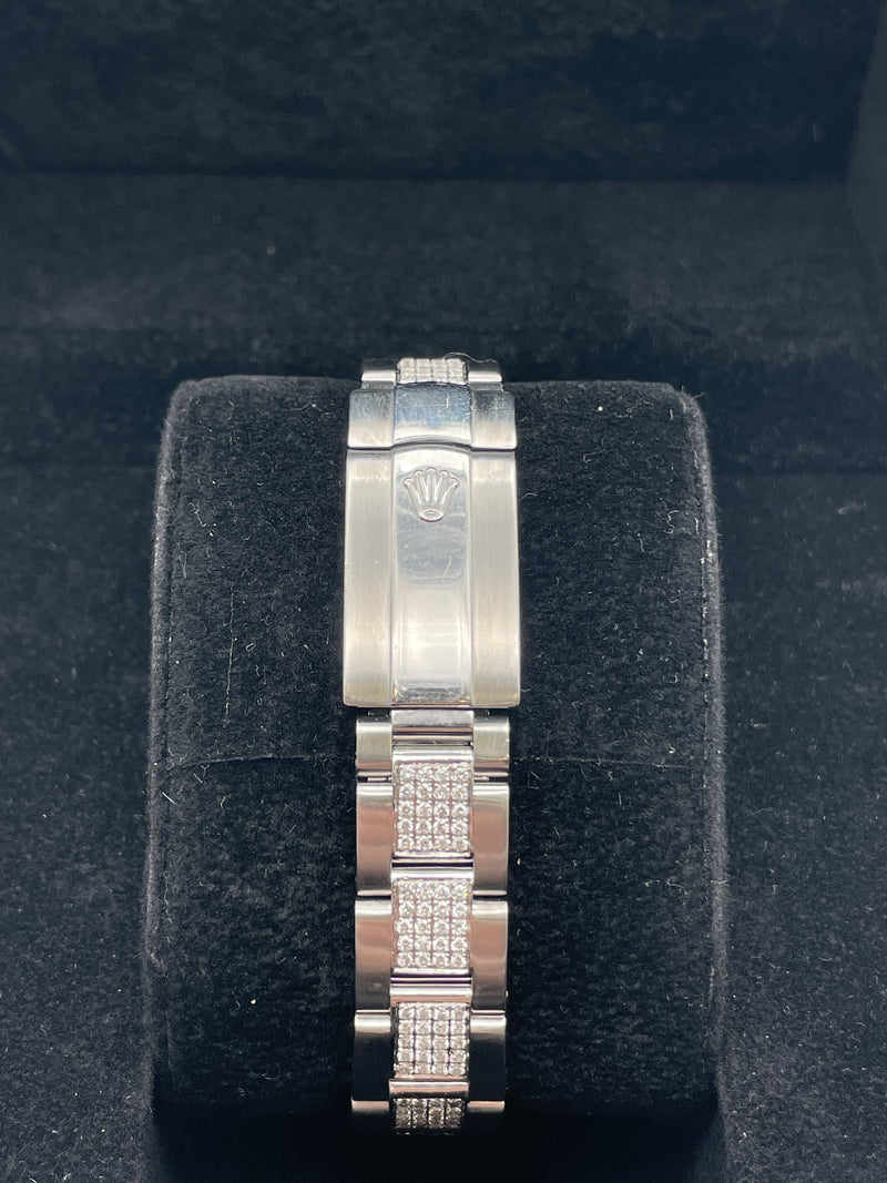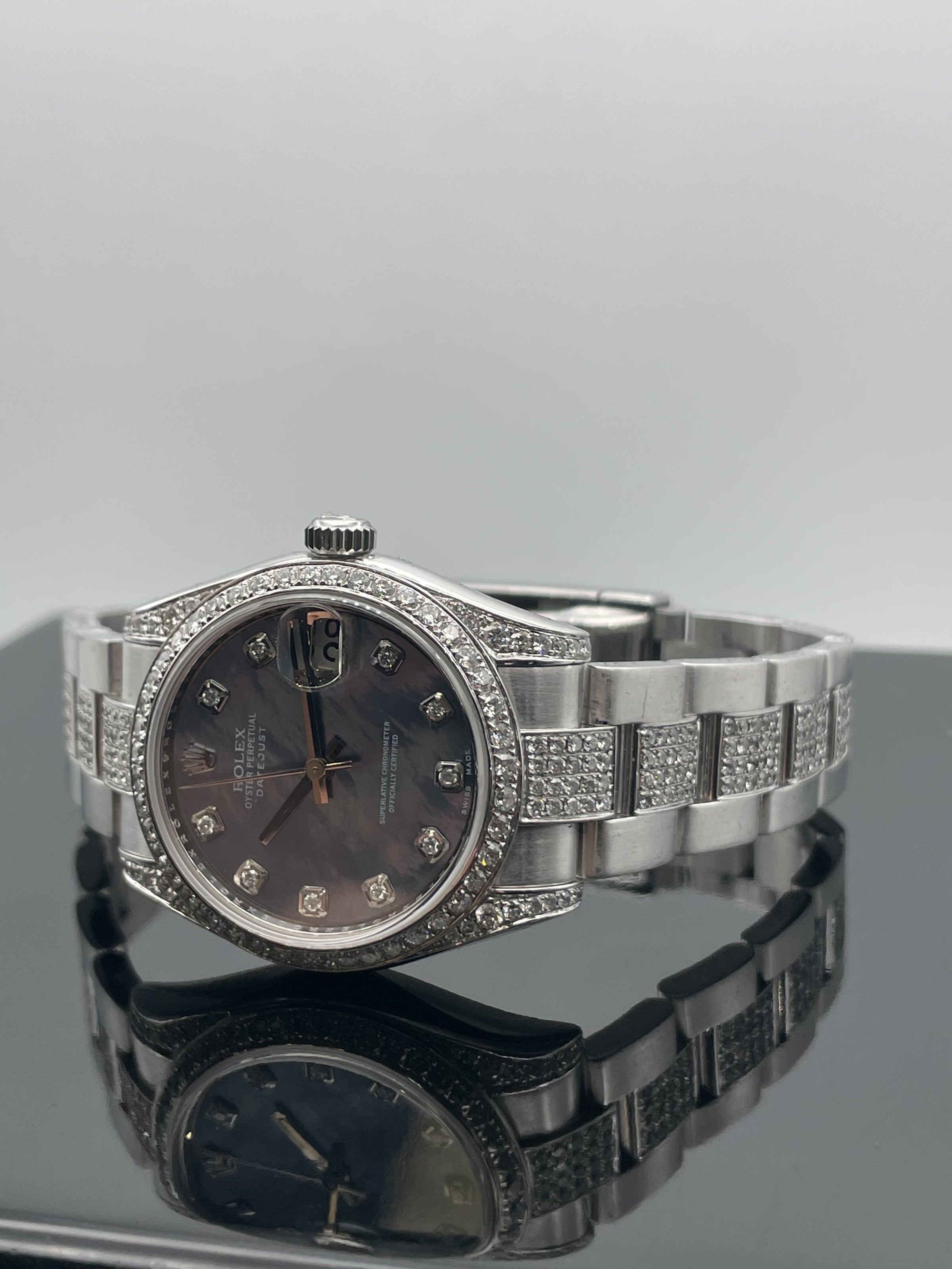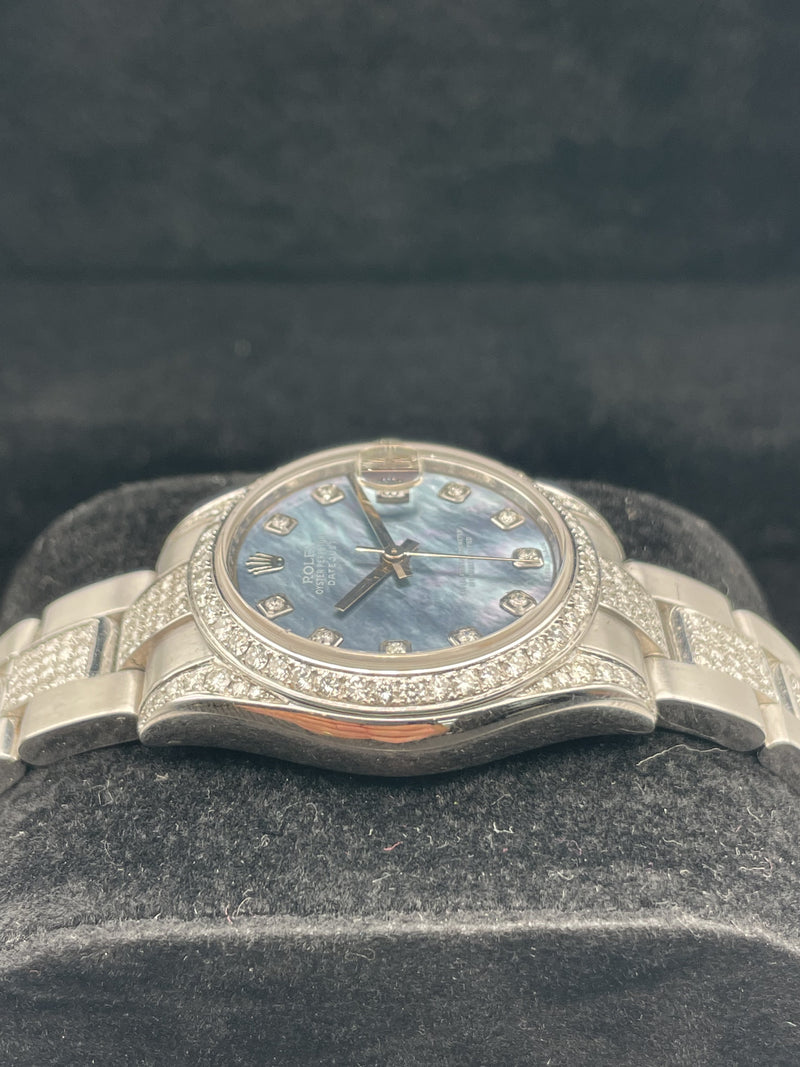 This stunning Rolex ladies datejust features a 31mm oyster steel case, oyster bracelet, blue marble dial with diamond set hour markers, diamond set bezel and a oyster steel bracelet with diamond set centre links. This watch has been set with aftermarket diamonds which means the diamonds have not been set by Rolex themselves. The diamonds have been set by "Time 4 Diamonds" who have done an exceptional job with setting these beautiful stones.