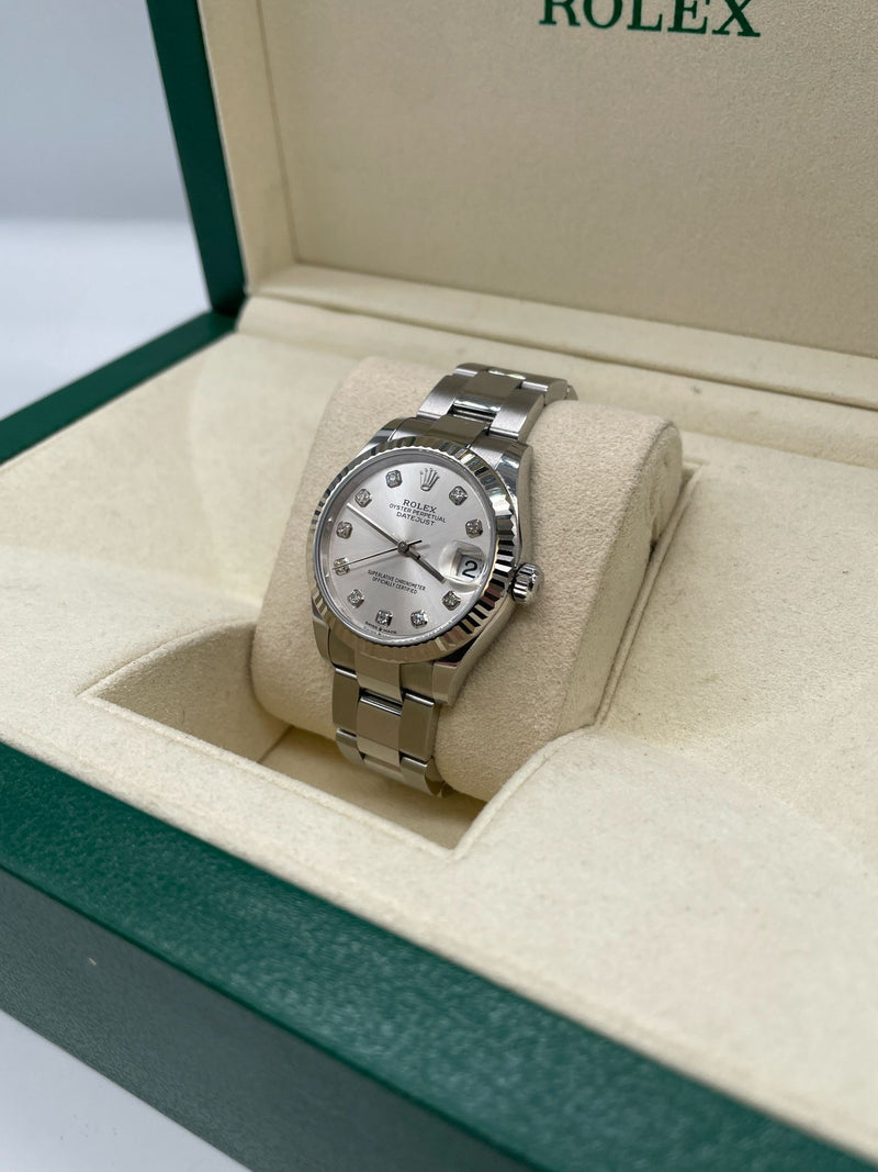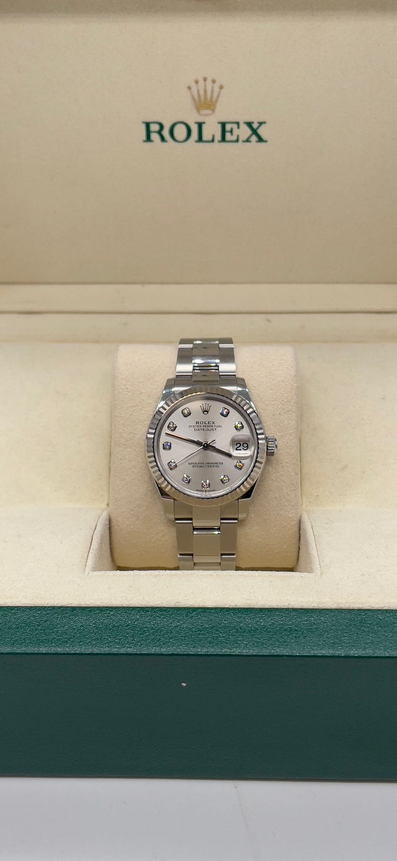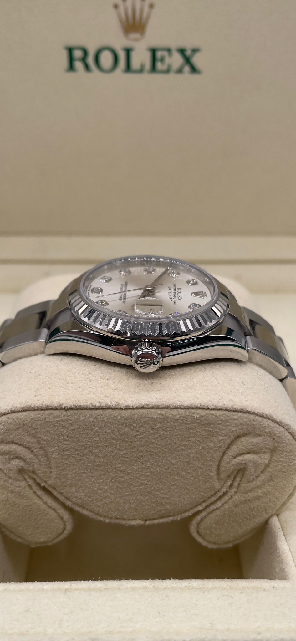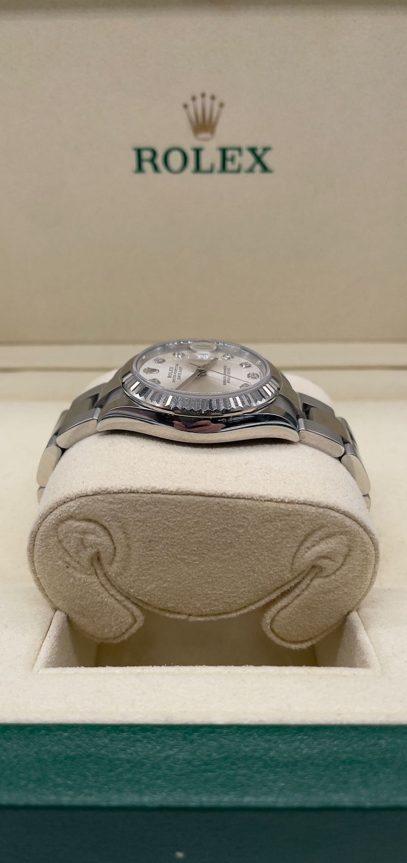 This stunning Rolex ladies Datejust features a 31mm stainless steel case, silver dial with diamond hour markers, 18k white gold fluted bezel and a oyster steel bracelet. This watch houses a Rolex calibre 2236 movement and a screw down crown making it water proof to 100m/330ft. This watch comes as a full set will box, paperwork and hang tags.