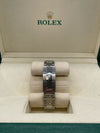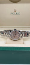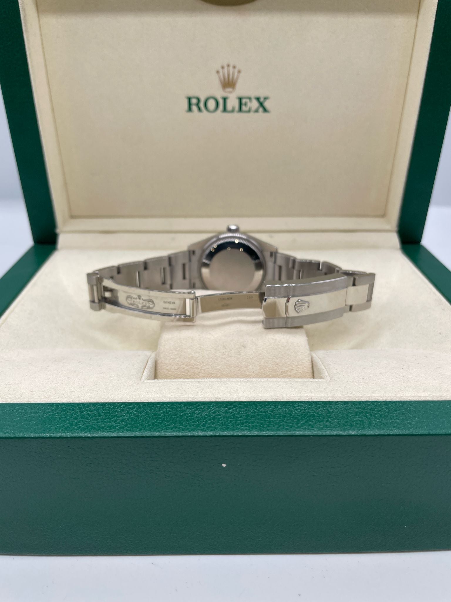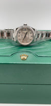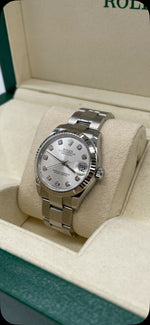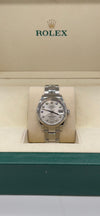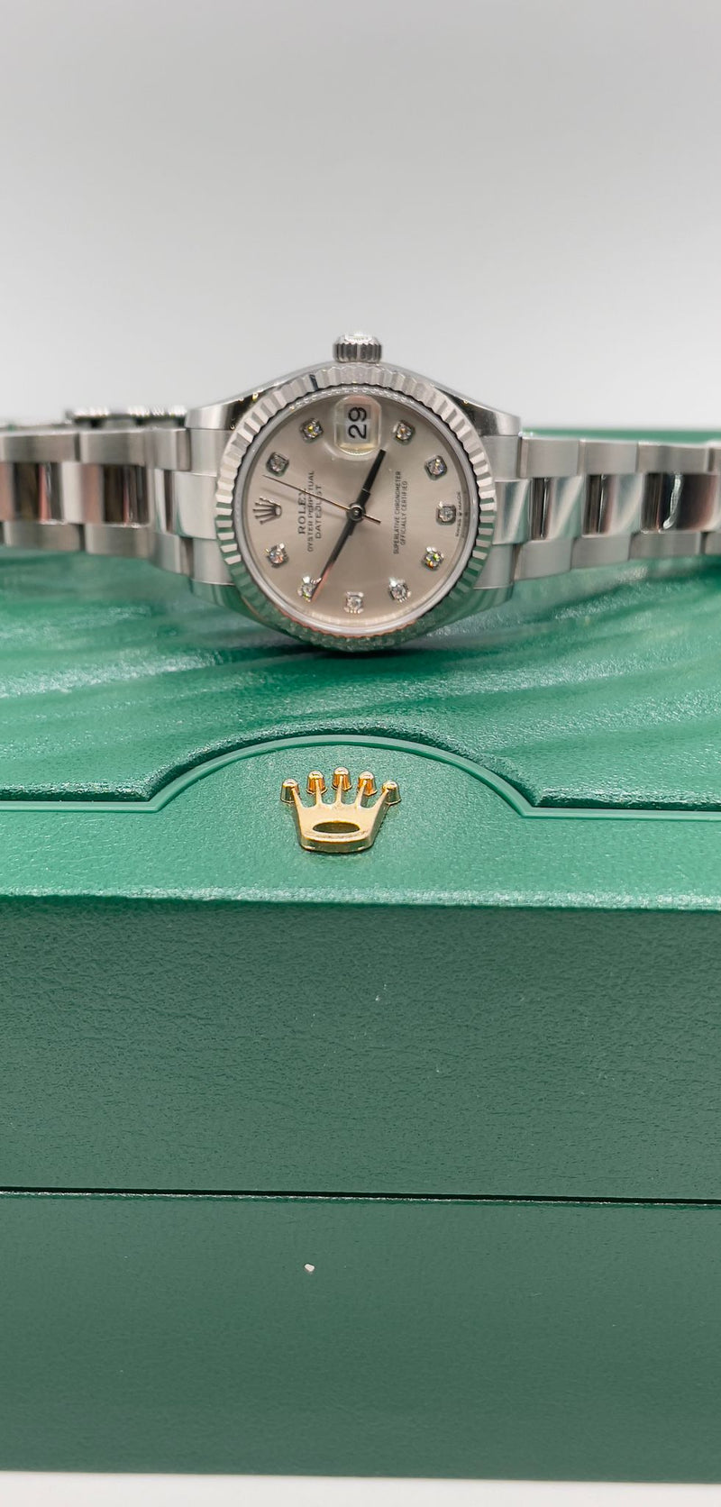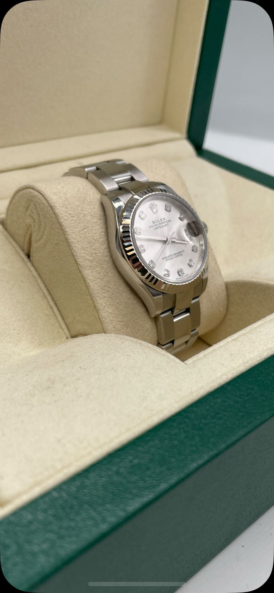 This stunning Rolex ladies Datejust features a 31mm stainless steel case, silver dial with diamond hour markers, 18k white gold fluted bezel and a oyster steel bracelet. This watch houses a Rolex calibre 2236 movement and a screw down crown making it water proof to 100m/330ft. This watch comes as a full set will box, paperwork and hang tags.