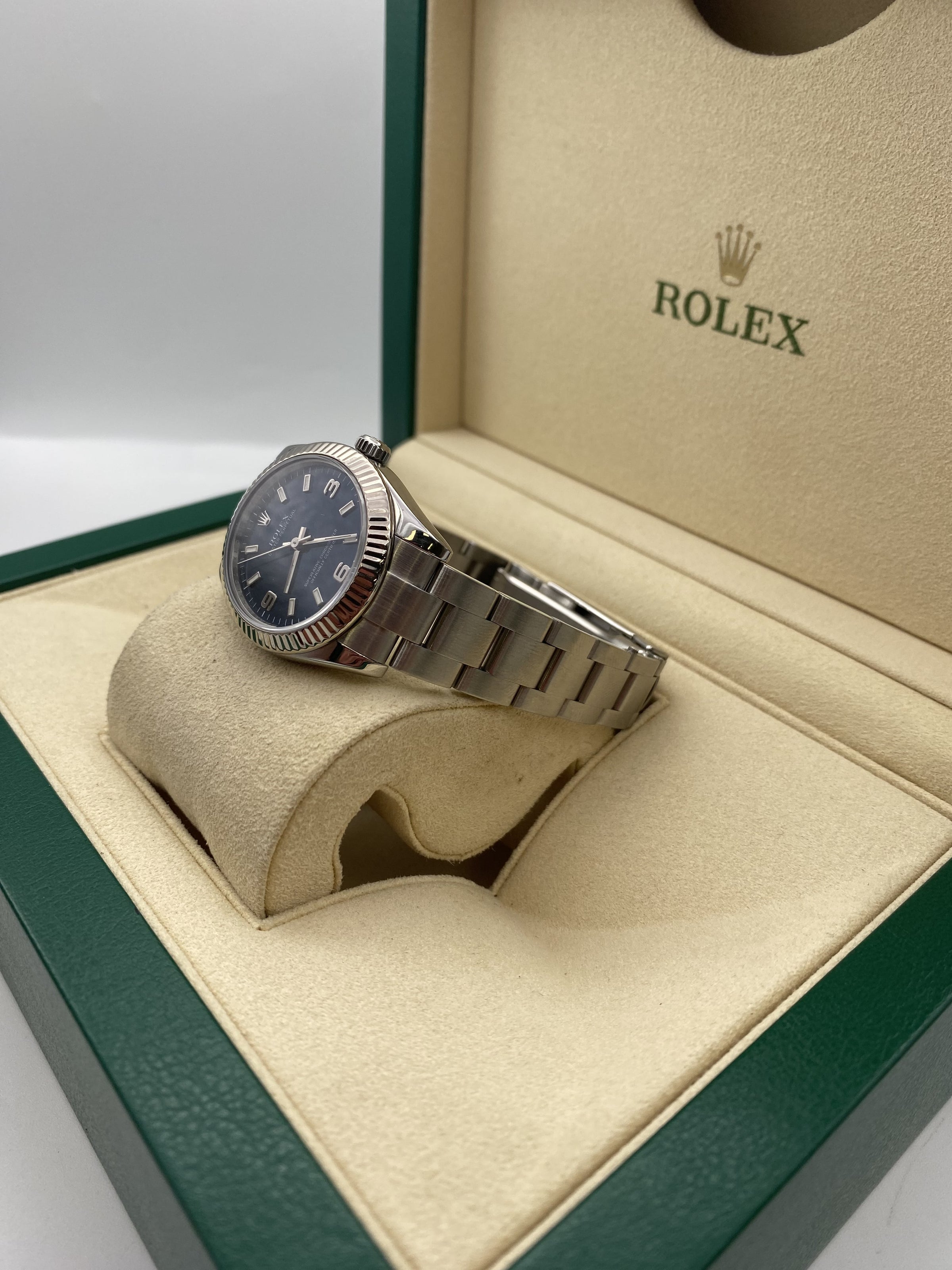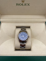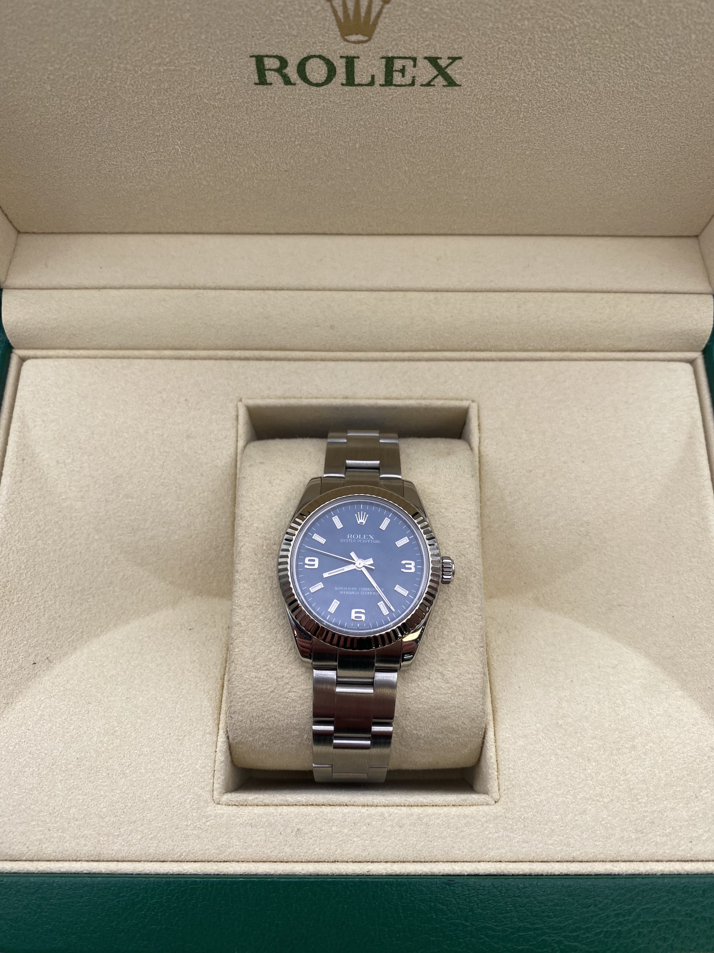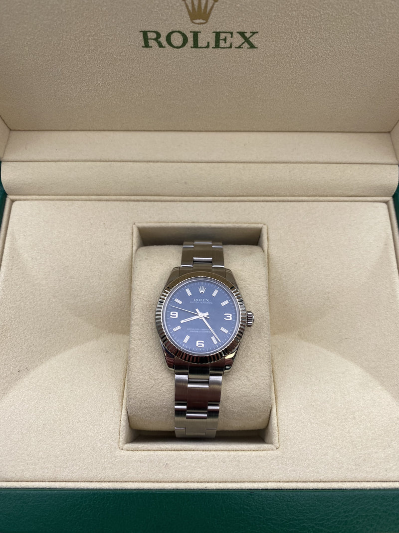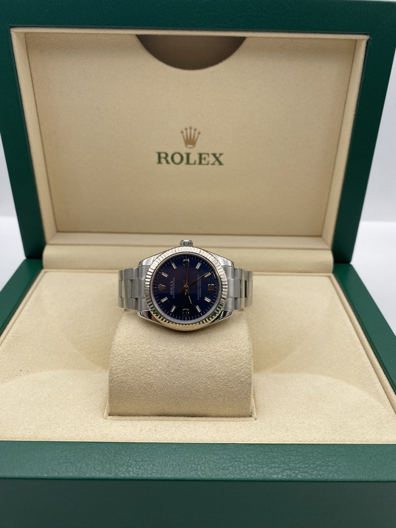 This Rolex Oyster Perpetual features a 31mm stainless steel case, white gold fluted bezel, bright blue dial with baton hour markers and Arabic numerals at 3,6,9 O'clock and a oyster steel bracelet.