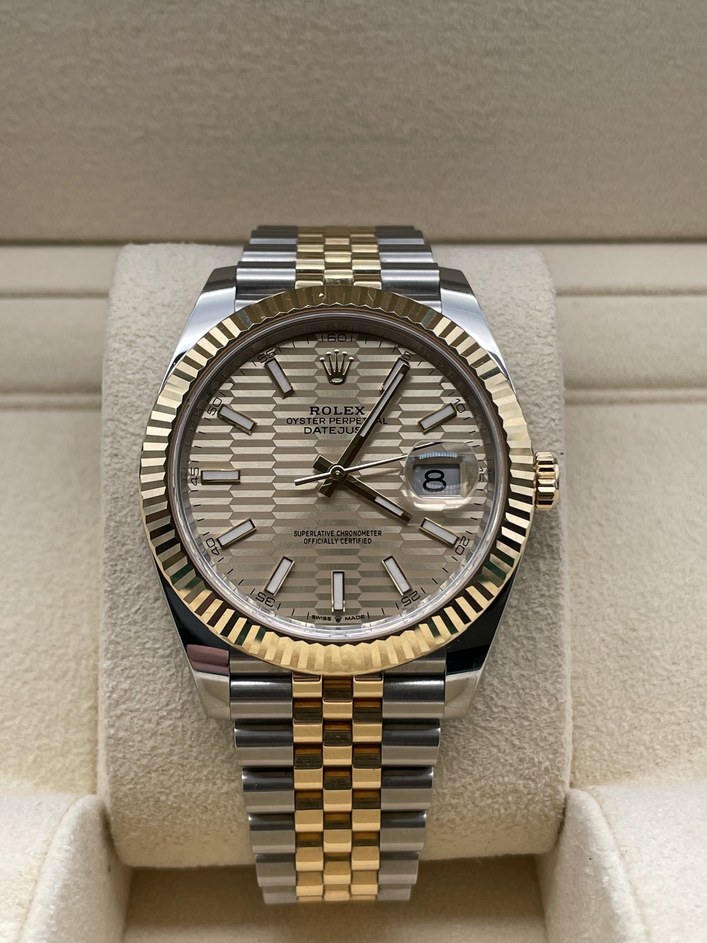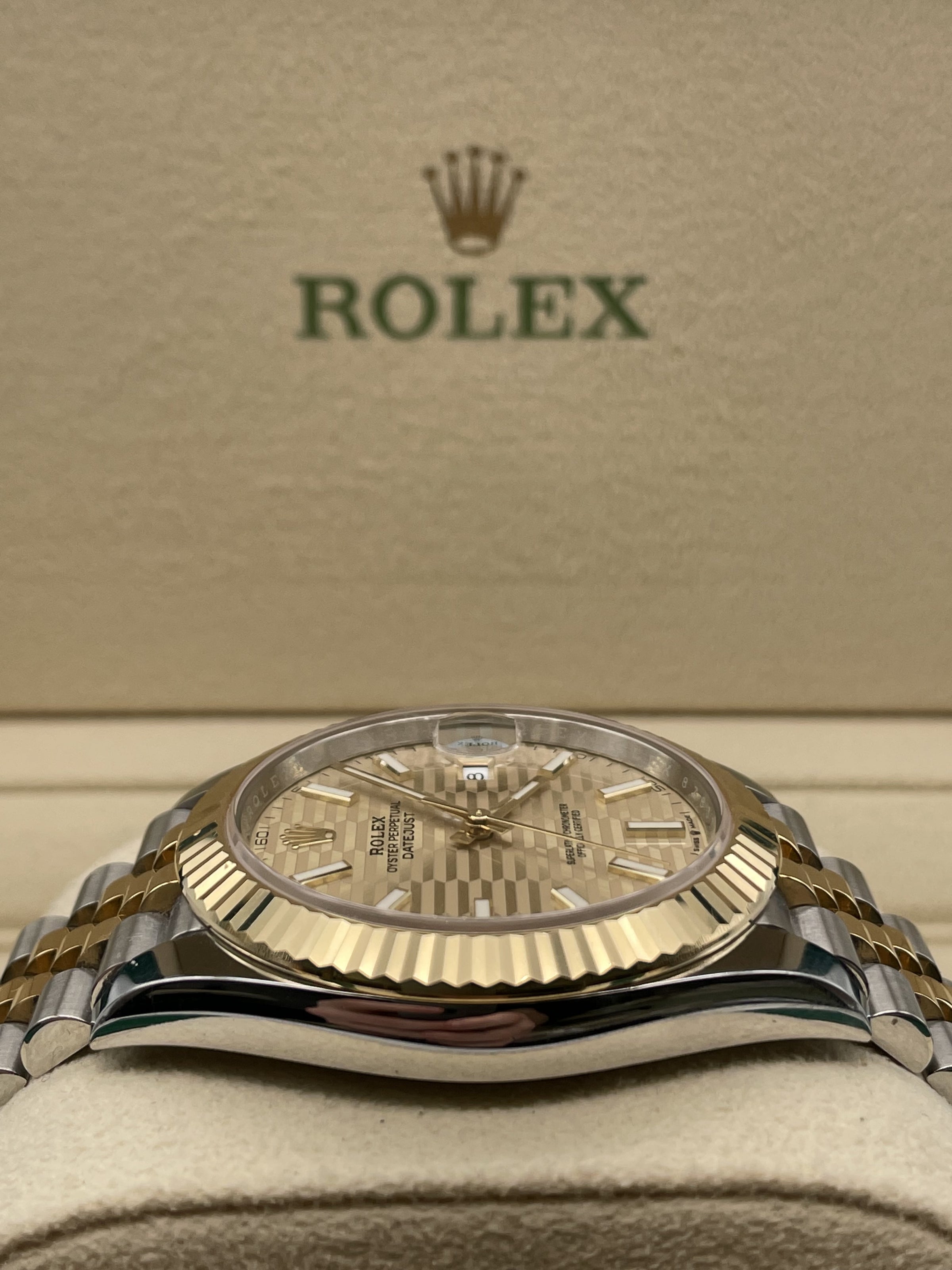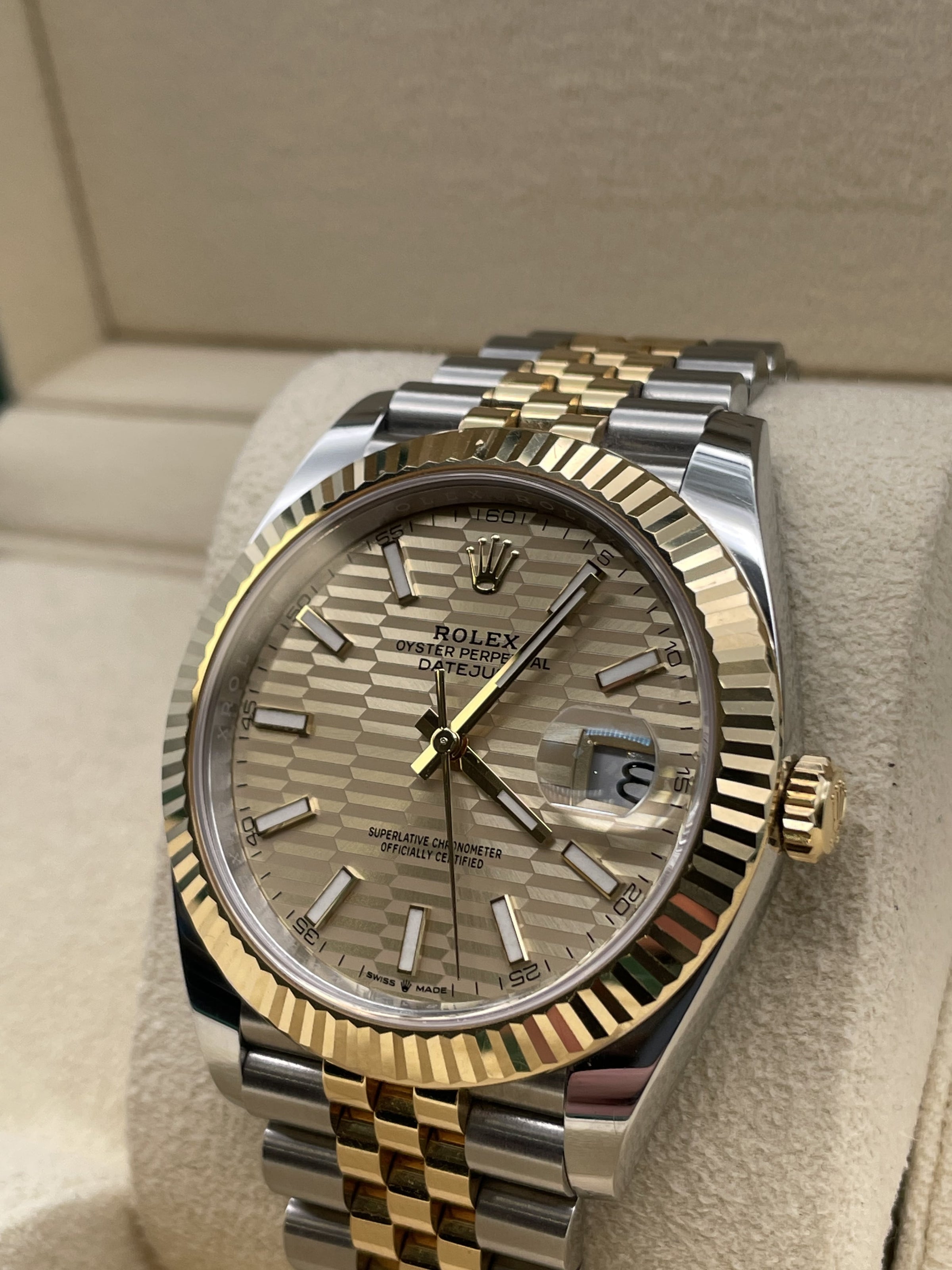 This stunning 41mm Rolex date-just is a hugely popular watch featuring a steel and yellow gold jubilee bracelet, 41mm steel case, gold fluted bezel and crown and a gold motif dial. Created in 1945, the Datejust was the first self-winding waterproof chronometer wristwatch to display the date in a window at 3 o'clock on the dial – hence its name. With its timeless aesthetics, functions and rich history, the Datejust is a watchmaking icon and one of the brand's most recognizable watches.