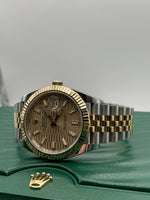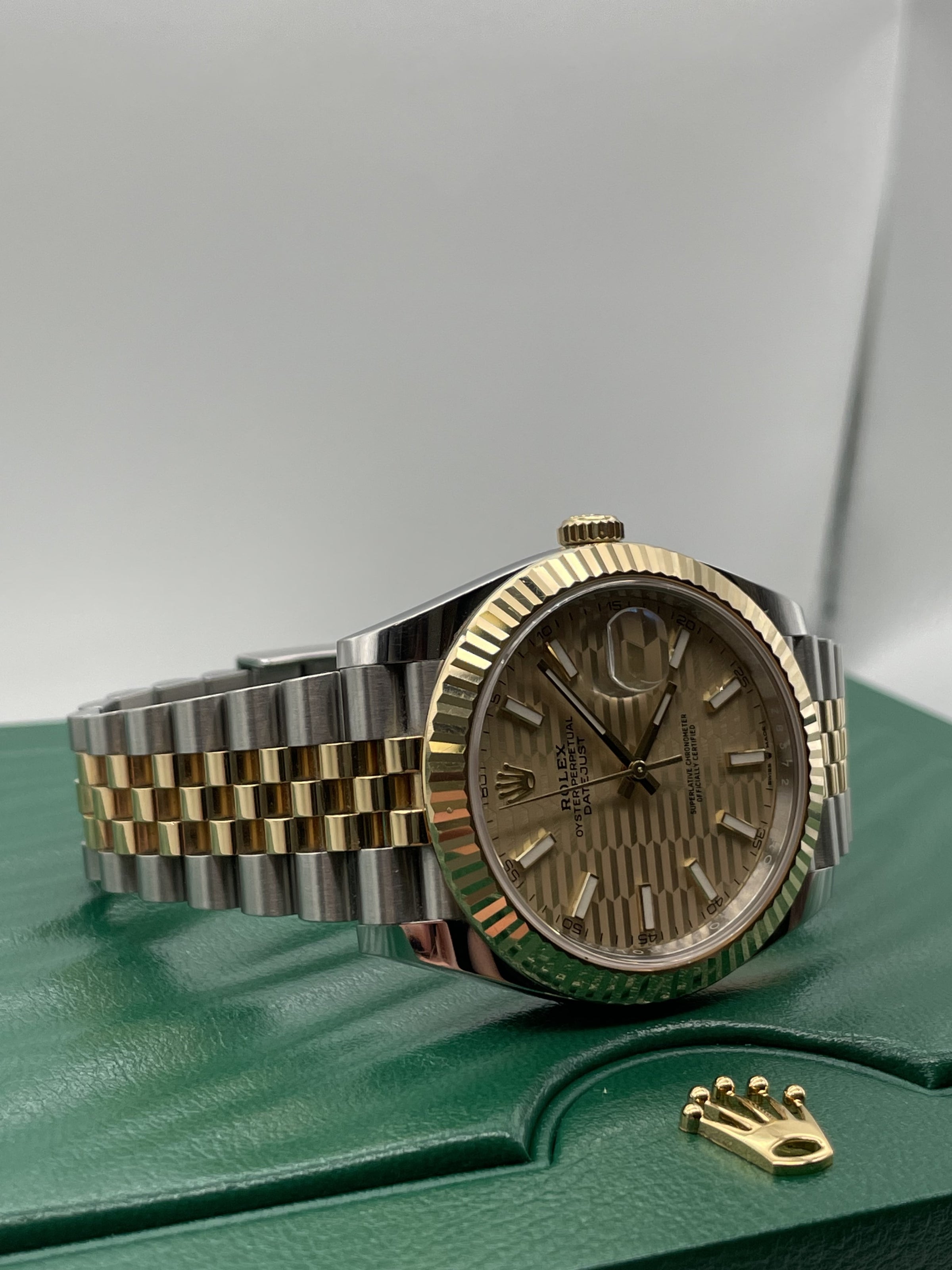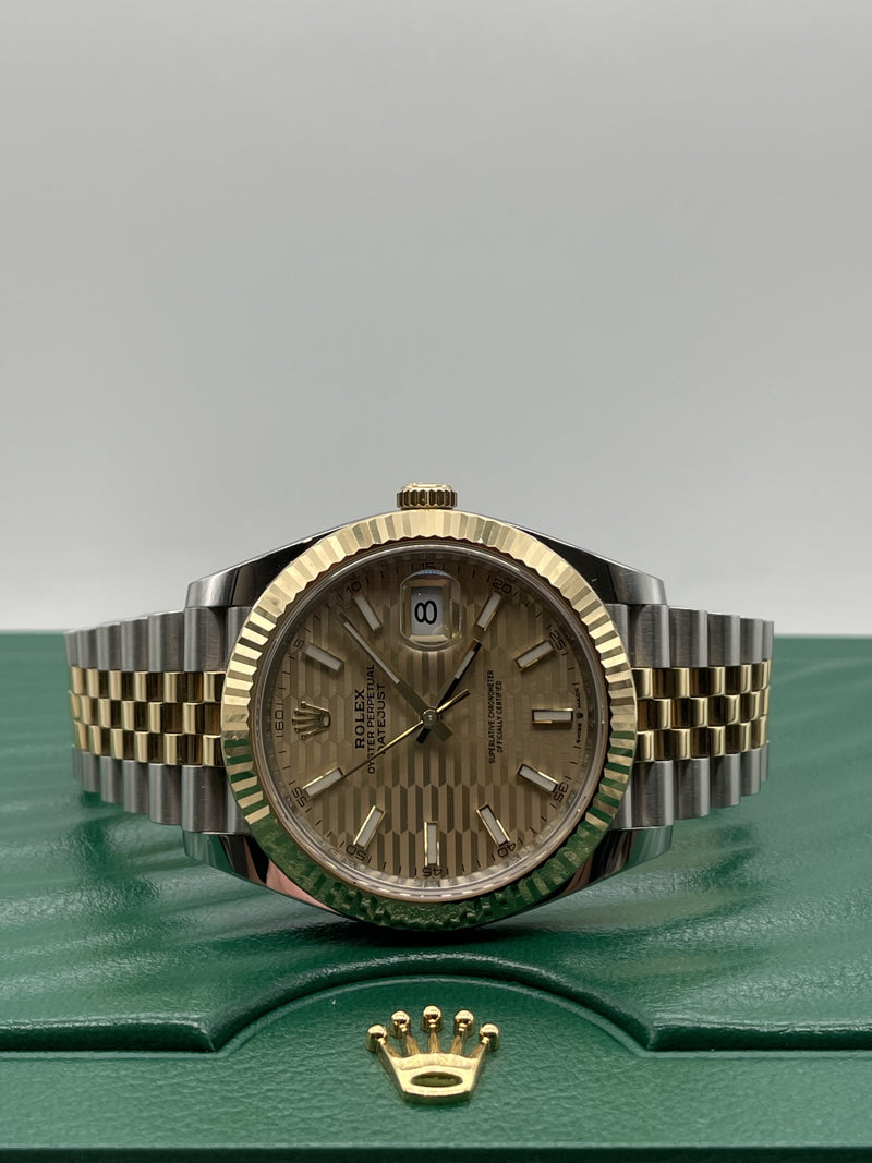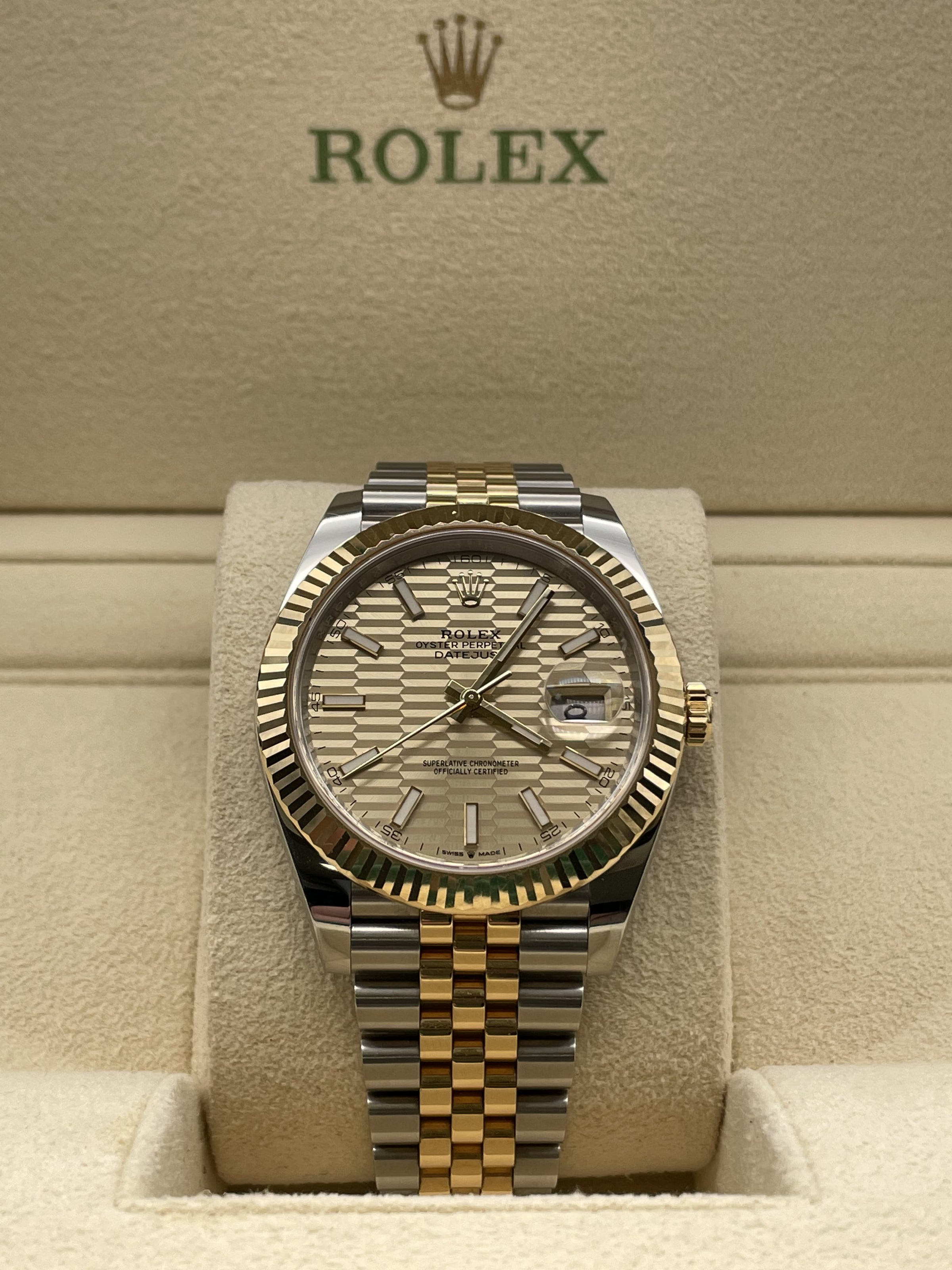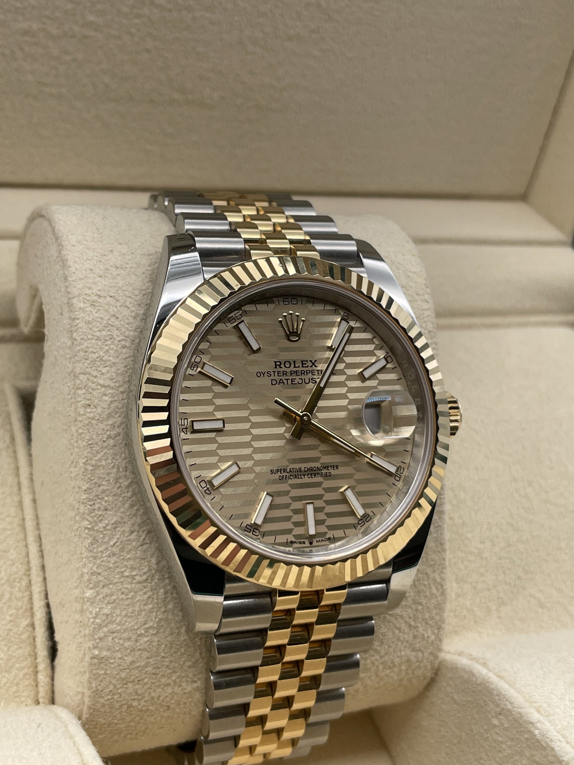 This stunning 41mm Rolex date-just is a hugely popular watch featuring a steel and yellow gold jubilee bracelet, 41mm steel case, gold fluted bezel and crown and a gold motif dial. Created in 1945, the Datejust was the first self-winding waterproof chronometer wristwatch to display the date in a window at 3 o'clock on the dial – hence its name. With its timeless aesthetics, functions and rich history, the Datejust is a watchmaking icon and one of the brand's most recognizable watches.