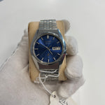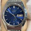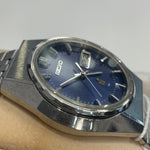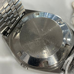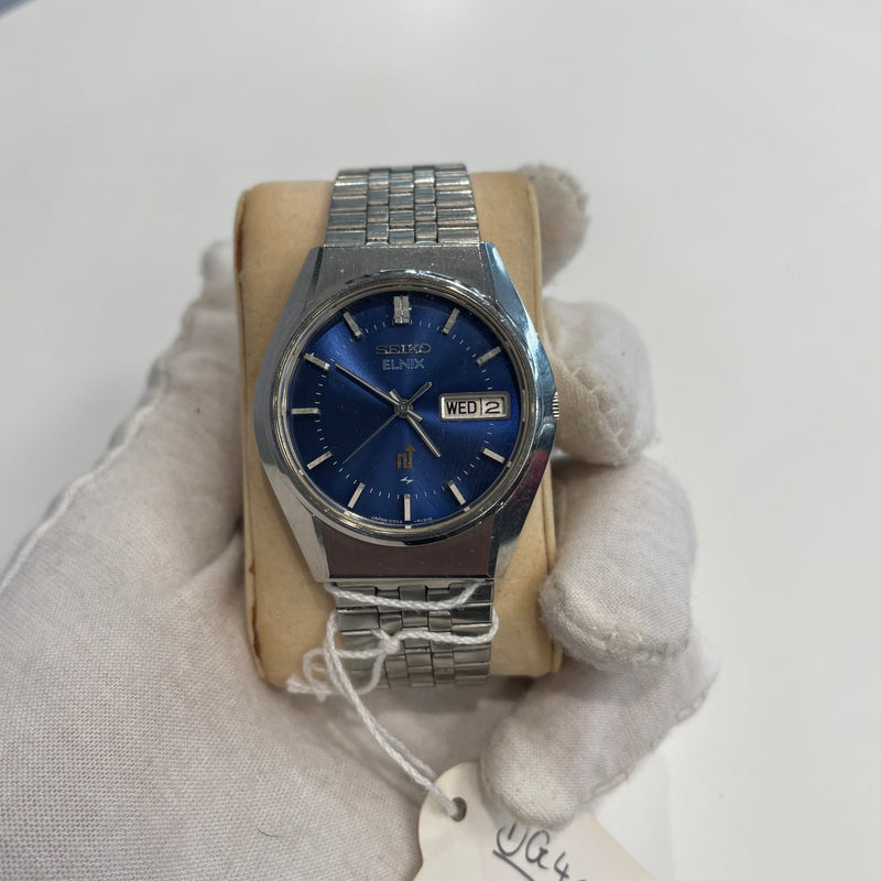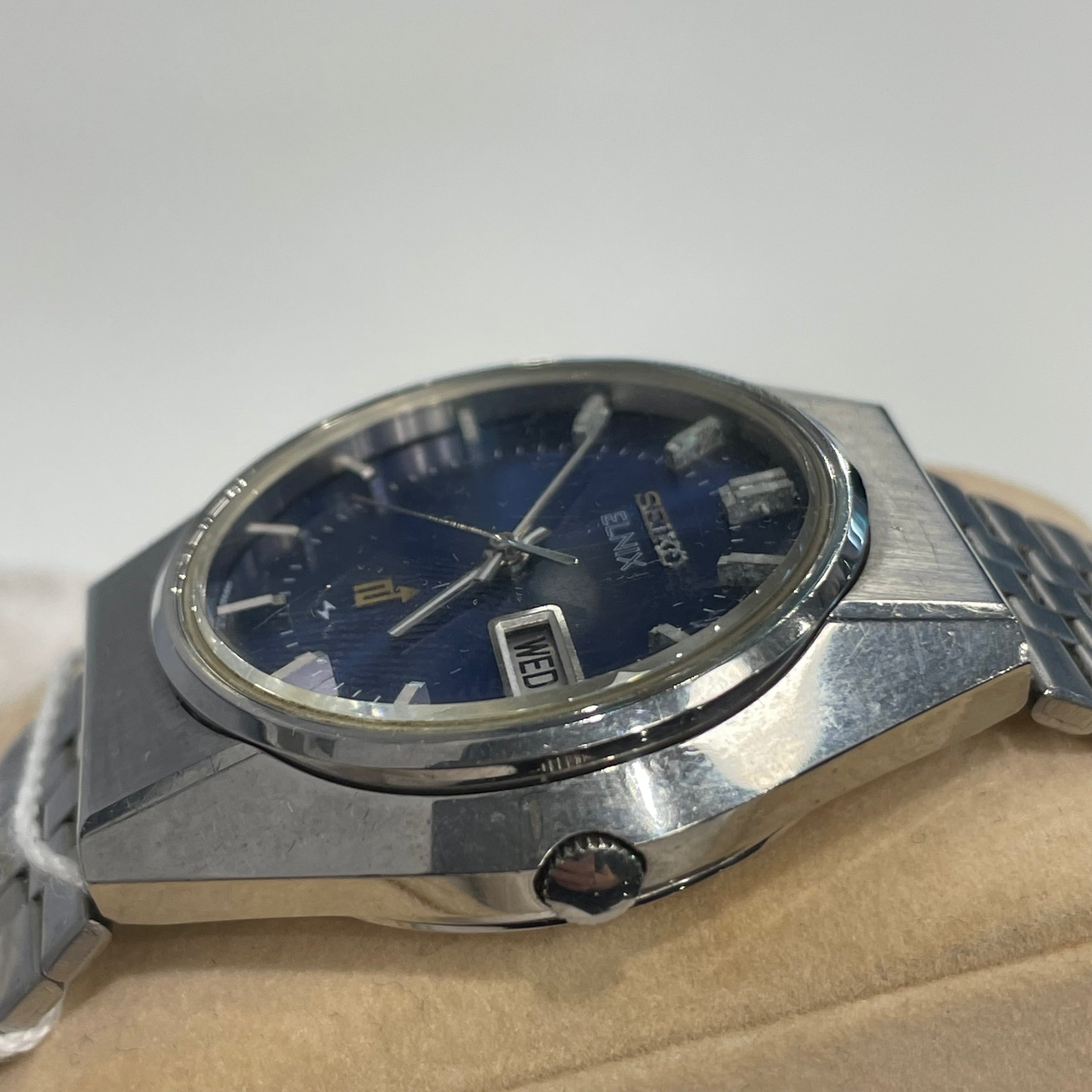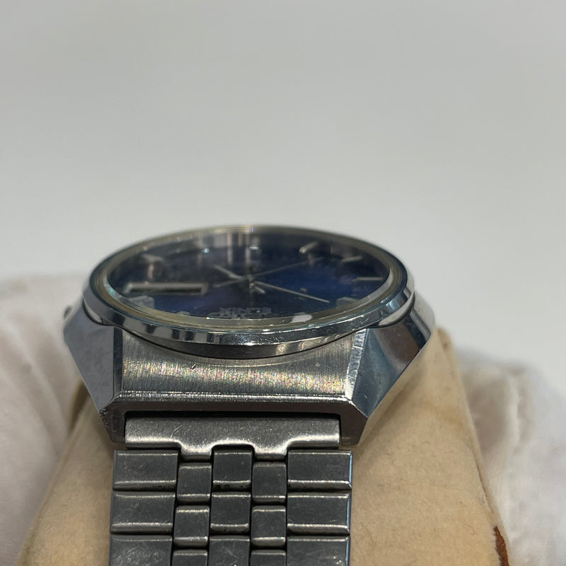 This is a Seiko Elnix from 1970's that has never been worn. It has a blue dial which is quite the rarity. Also on the bracelet an extender has been attached, it is the original Seiko extender which was also featured on the Lord-Matic of the time. It is quite the innovation as it is not just an extender but operates on a spring - thus it always fits! Your wrist may swell a bit, or contract, this Elnix will fit comfortably at all times.