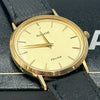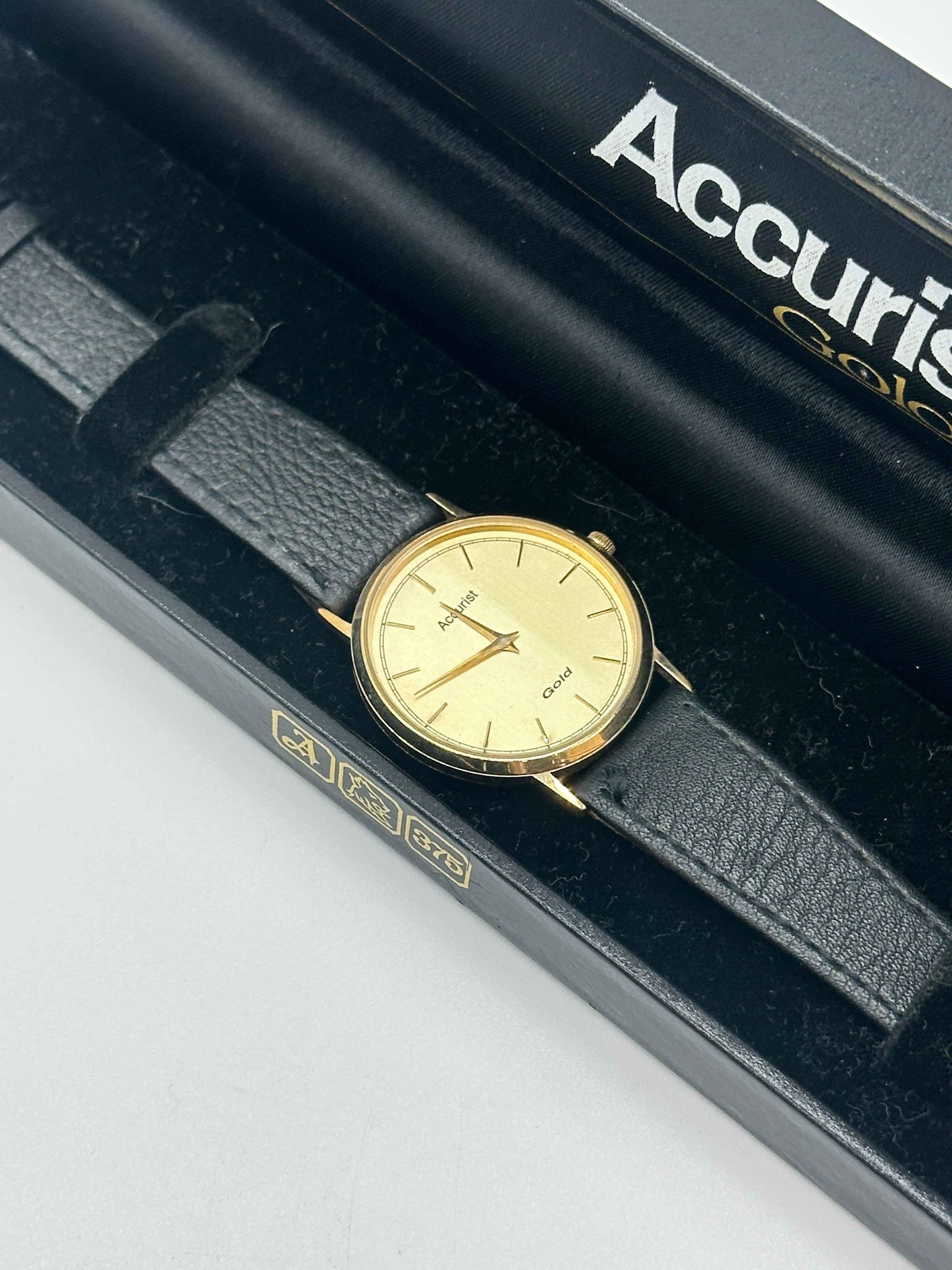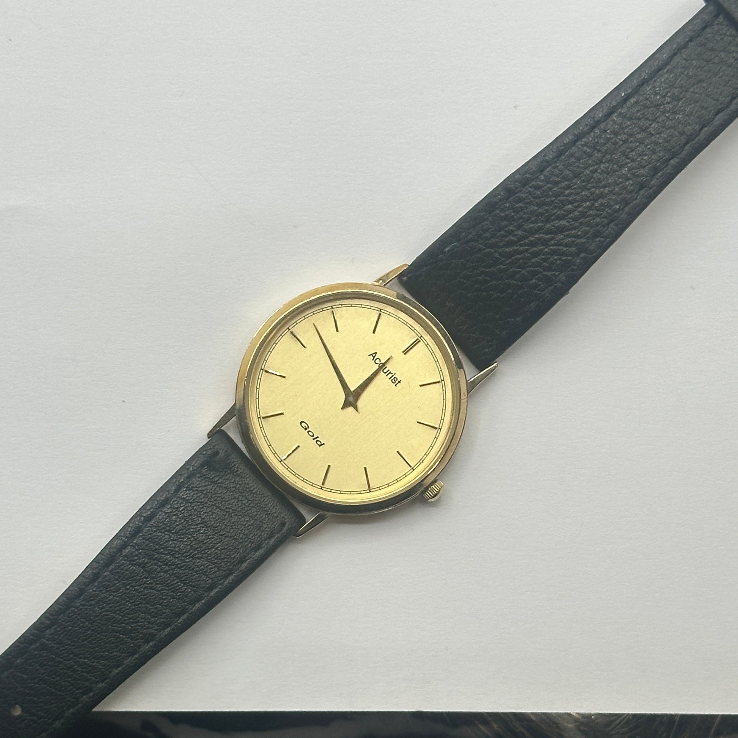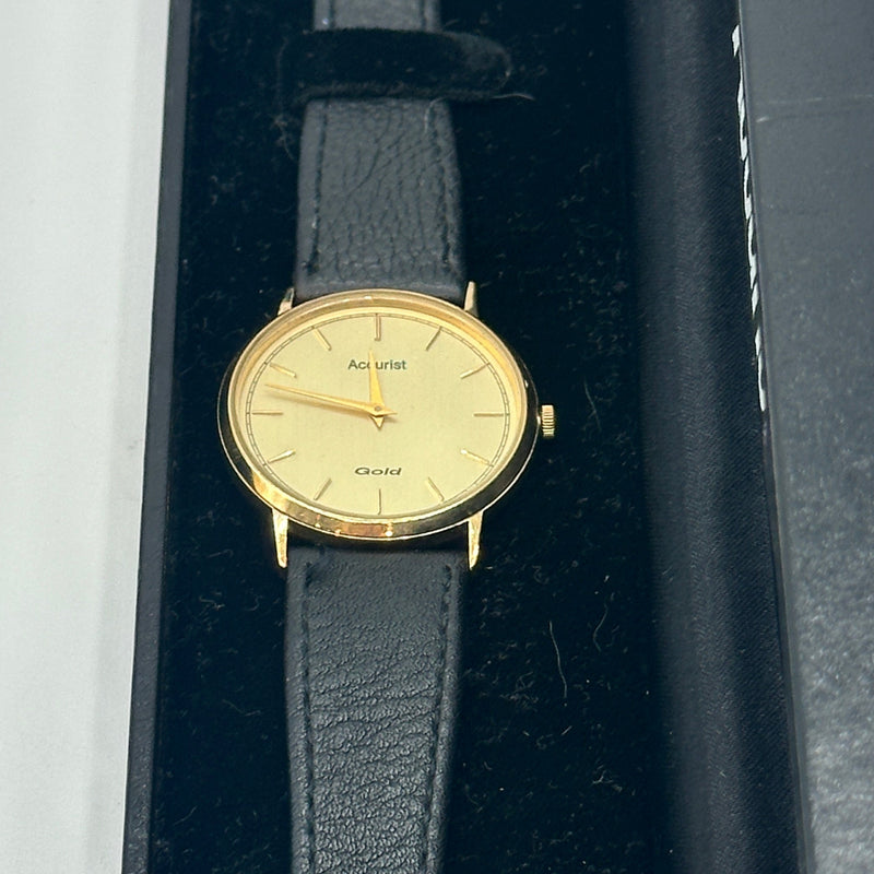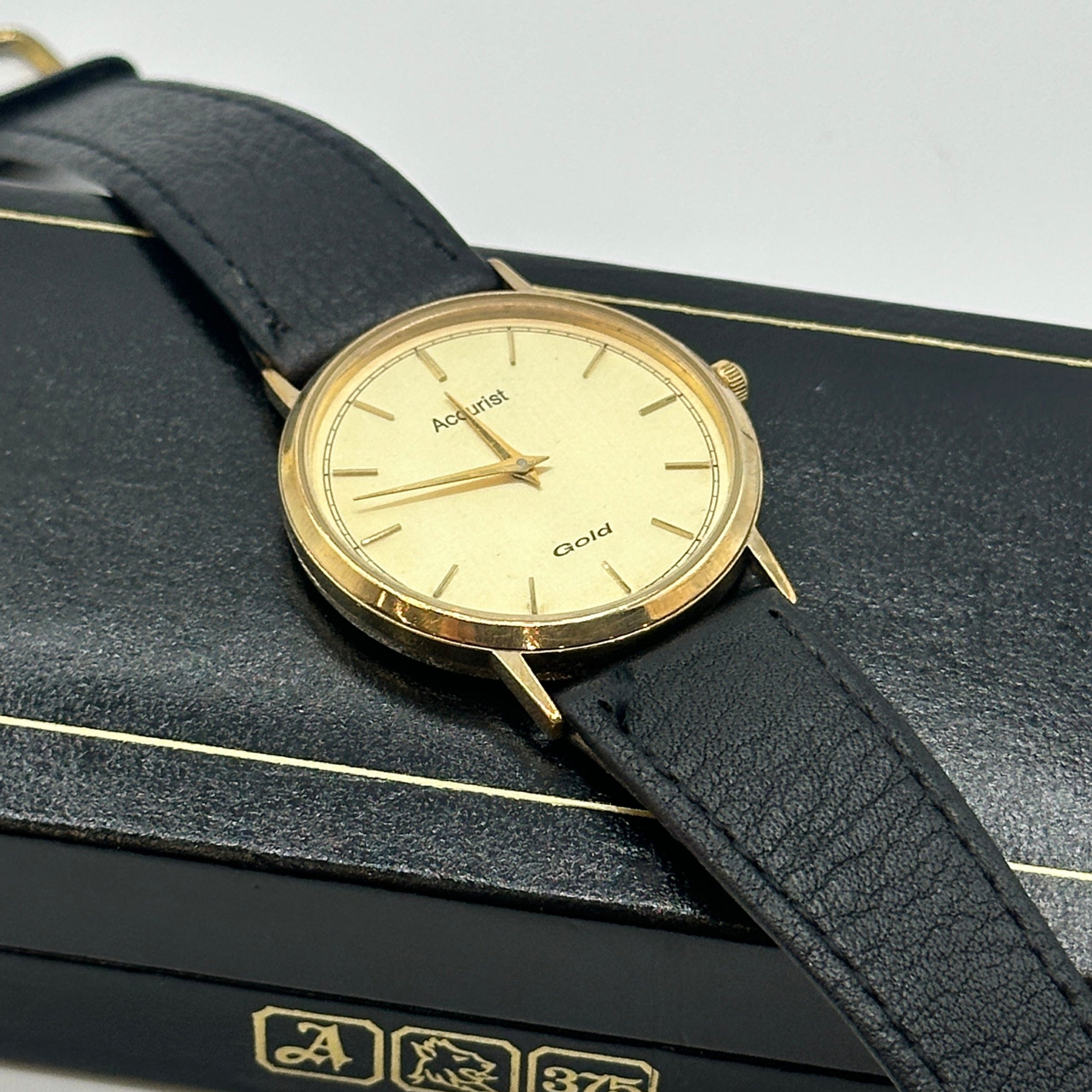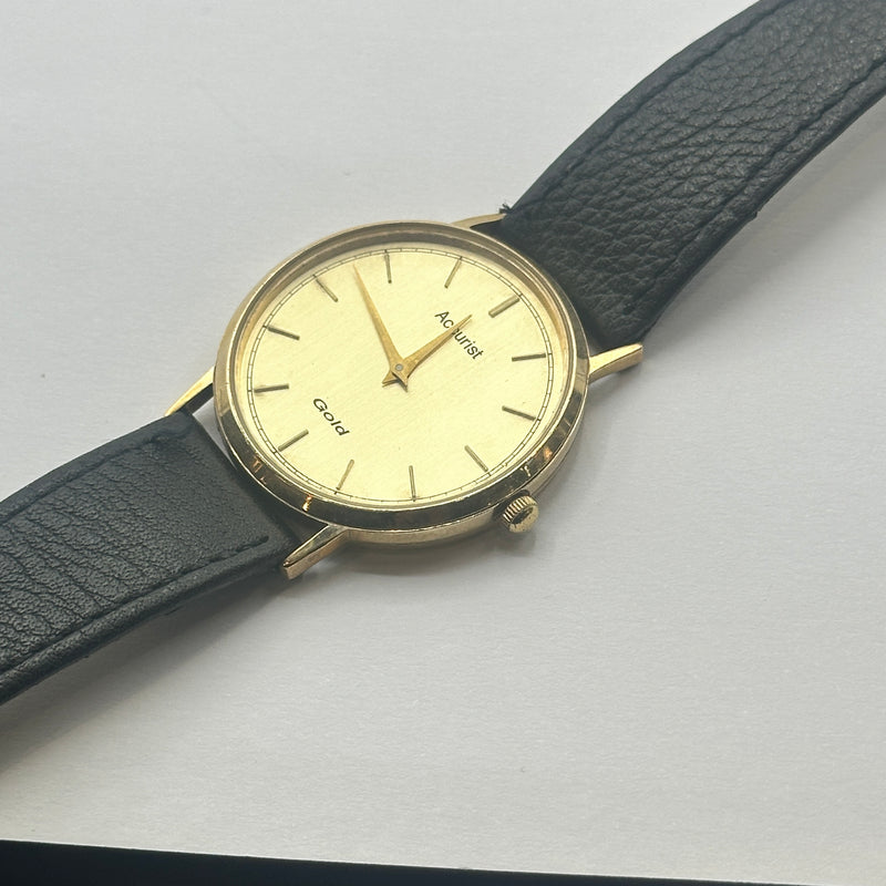 This refined Accurist wristwatch from 1990 is crafted from solid 9ct yellow gold, offering a sleek and timeless aesthetic. The brushed gold-tone dial is elegantly minimalist, featuring fine black baton hour markers and slim gold-tone hands. Housed in a 33mm gold case, the watch is paired with a black leather strap and gold-tone buckle, creating a smart and versatile appearance. Powered by a precise quartz movement, this piece delivers reliable timekeeping combined with understated vintage luxury, ideal for everyday wear or formal occasions.