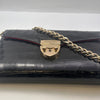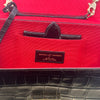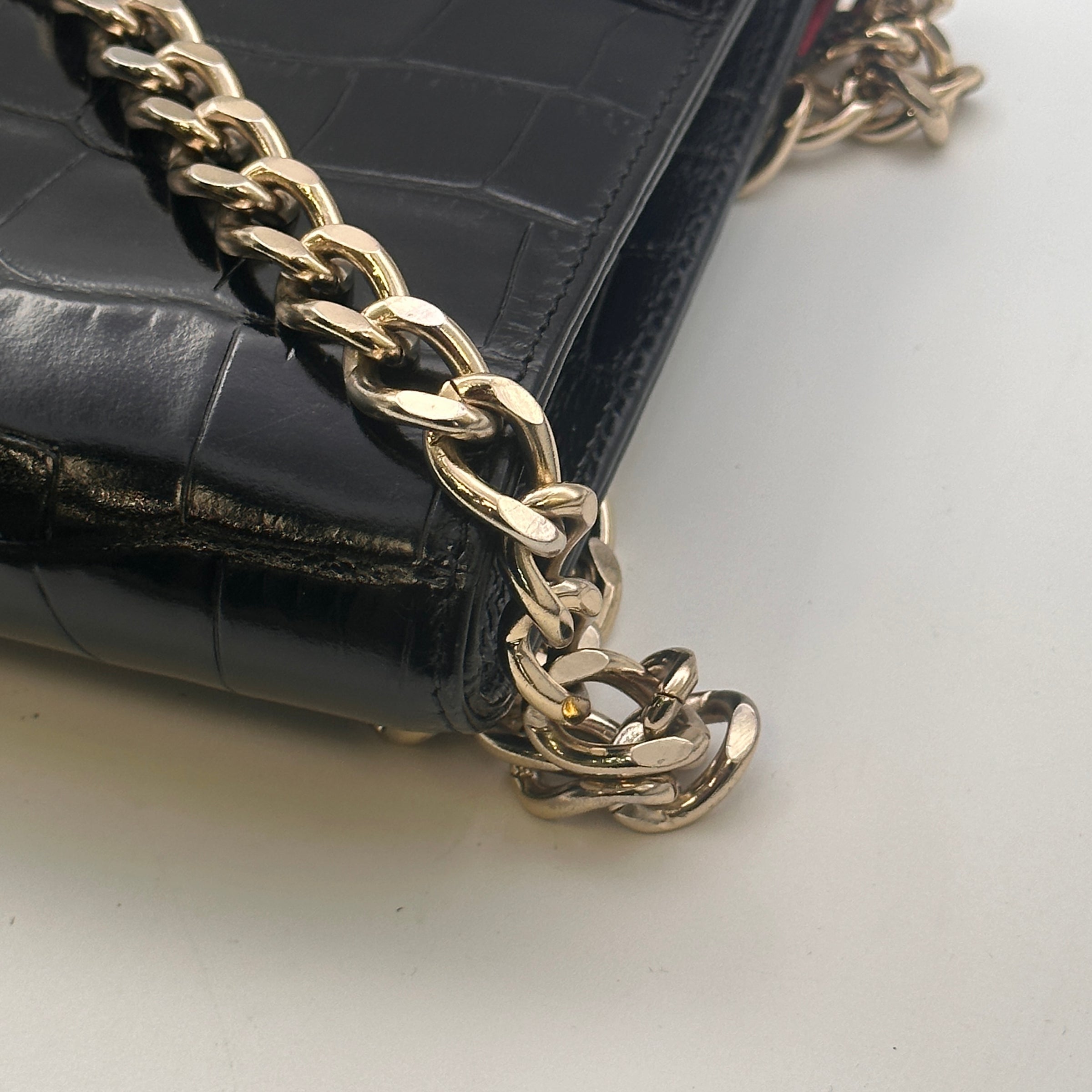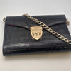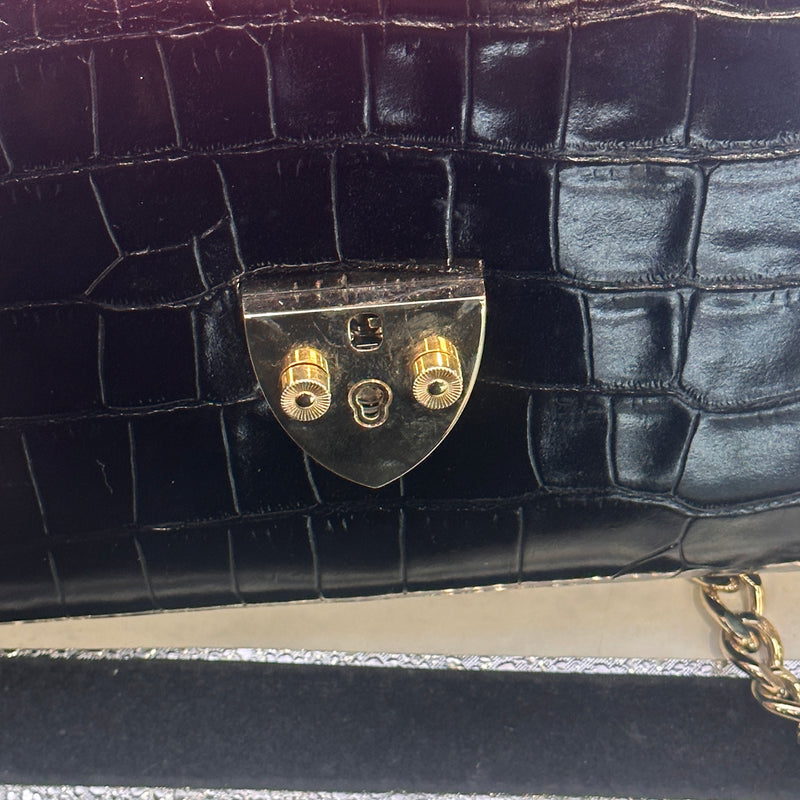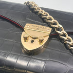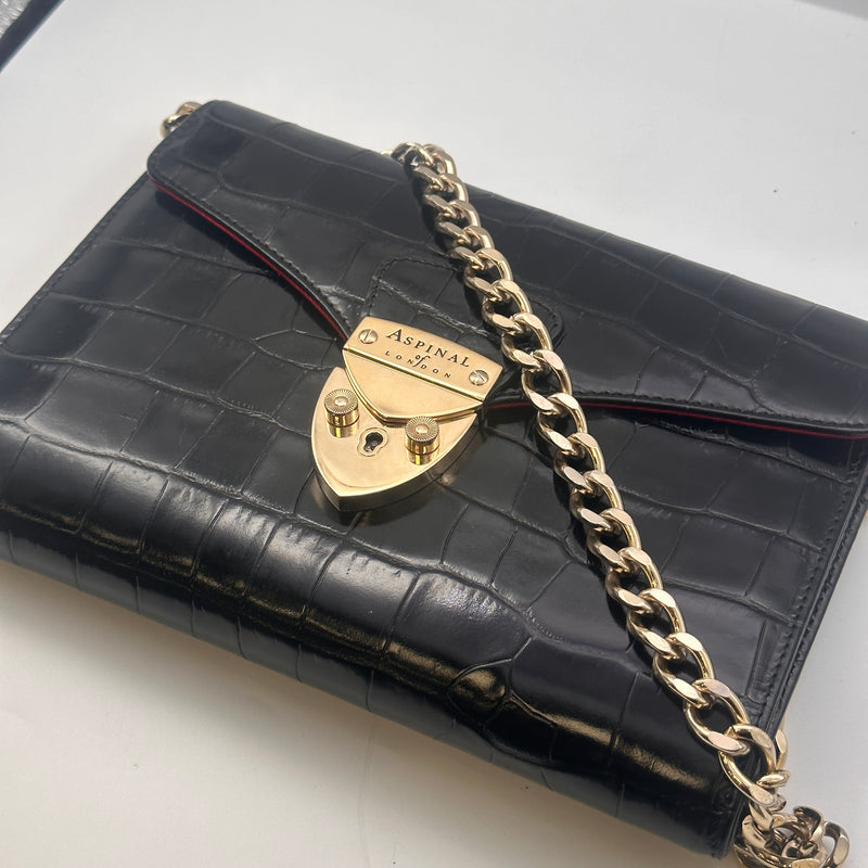 Materials & Design: The Aspinal of London "Elizabeth Hurley Bag" is meticulously crafted from black patent leather with a crocodile-embossed texture, offering a luxurious and sophisticated appearance. Its sleek design embodies timeless elegance, making it a versatile accessory suitable for various occasions.
