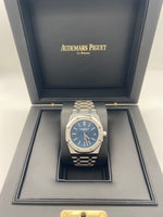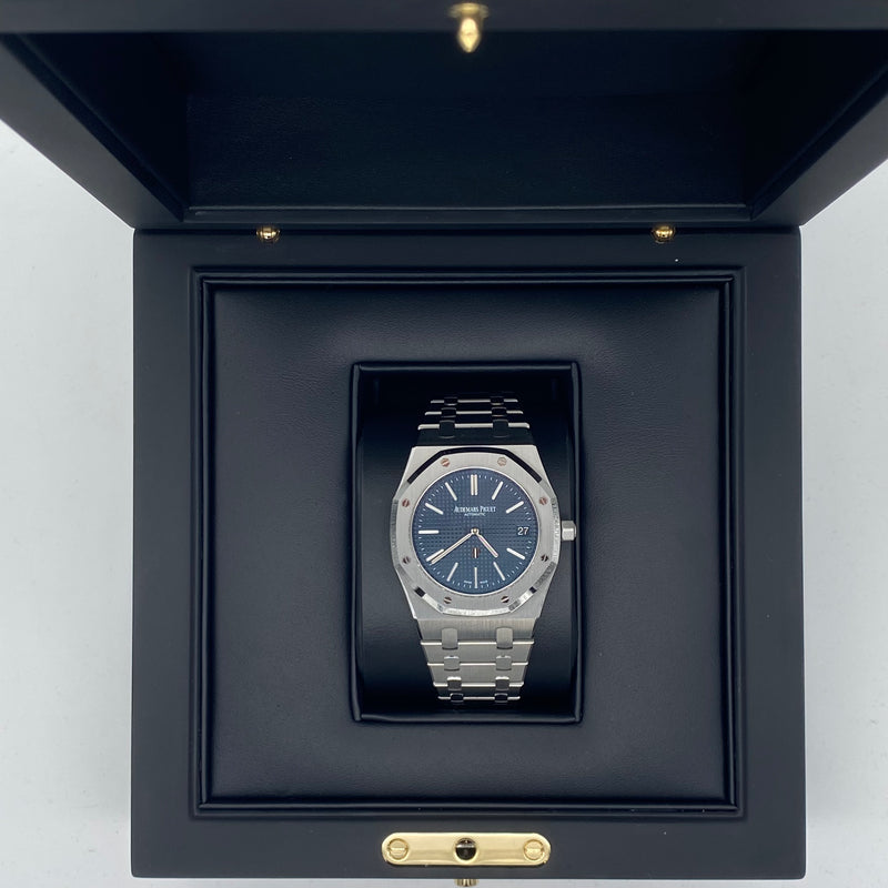The Royal Oak is immediately recognizable thanks to its octagonal bezel secured by eight hexagonal screws and dials adorned with unique textures. Featuring a navy blue textured Grande Tapisserie dial, polished white gold baton hour markers and Royal Oak hands with luminescent coating, stainless steel octagonal bezel, hand crafted steel 39mm case with glareproofed sapphire crystal and integrated link bracelet with AP folding clasp. This watch has a see-through case back showcasing the impressive automatic AP Calibre 2121 movement contained within.