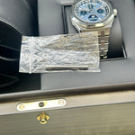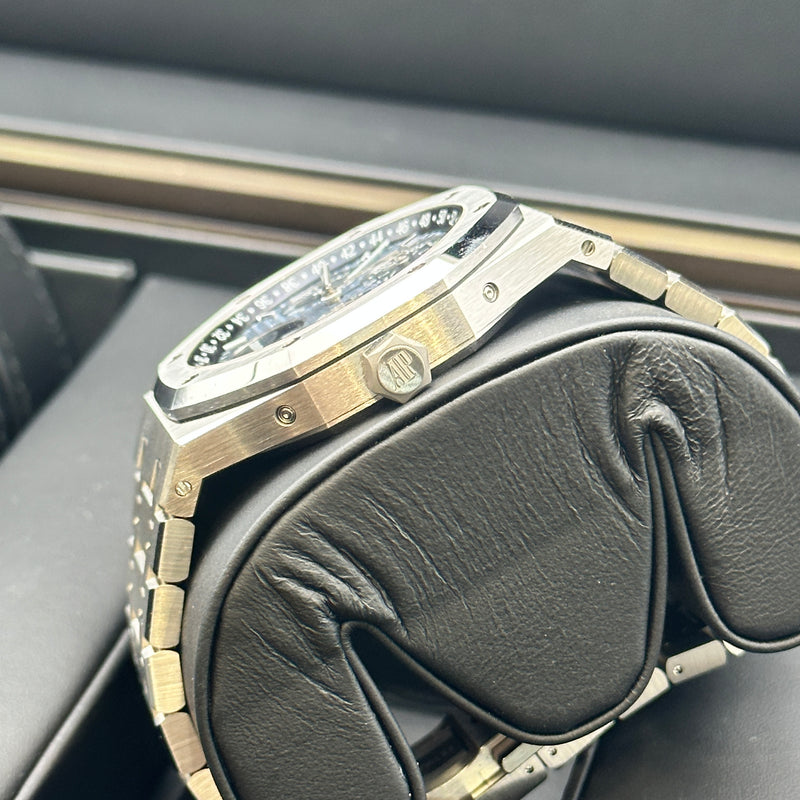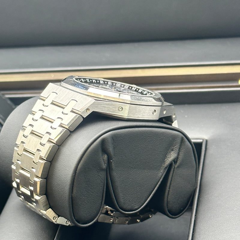 • Design: This timepiece boasts a 41 mm case with a thickness of 9.5 mm, presenting a harmonious balance between presence and comfort. The blue dial showcases the iconic "Grande Tapisserie" pattern, complemented by blue subdials and an inner bezel in the signature "Night Blue, Cloud 50" hue. White gold applied hour-markers and Royal Oak hands with luminescent coating ensure optimal readability.