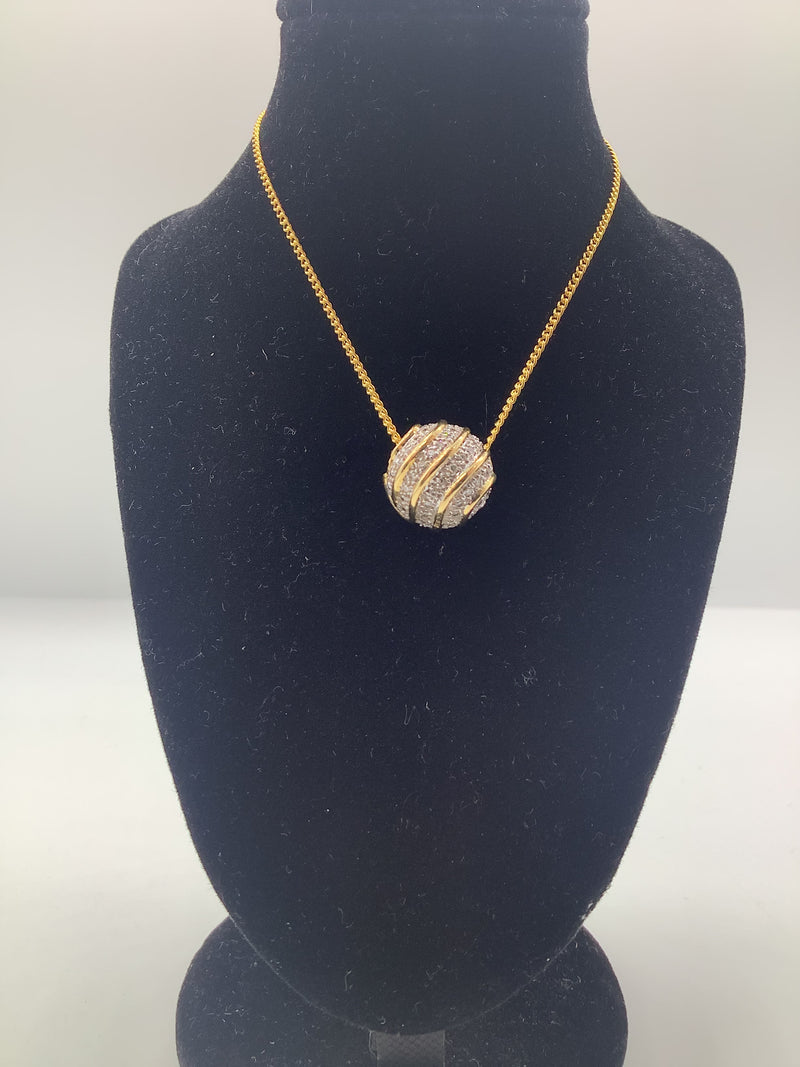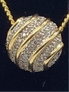 This beautiful ball pendant is crafted from 18ct yellow gold and features a stunning swirl design. The pendant is adorned with clusters of diamonds set in white gold, creating a striking contrast against the warm yellow gold. The design combines elegance and sophistication, with the diamonds offering a brilliant sparkle as they form the intricate swirl pattern. The pendant hangs from a yellow gold-plated chain, adding to its luxurious look. With an approximate carat weight of 0.30ct, this pendant is a perfect blend of refinement and modern style. -