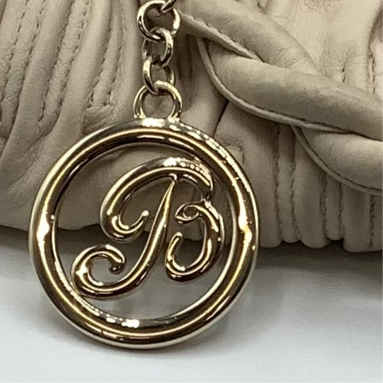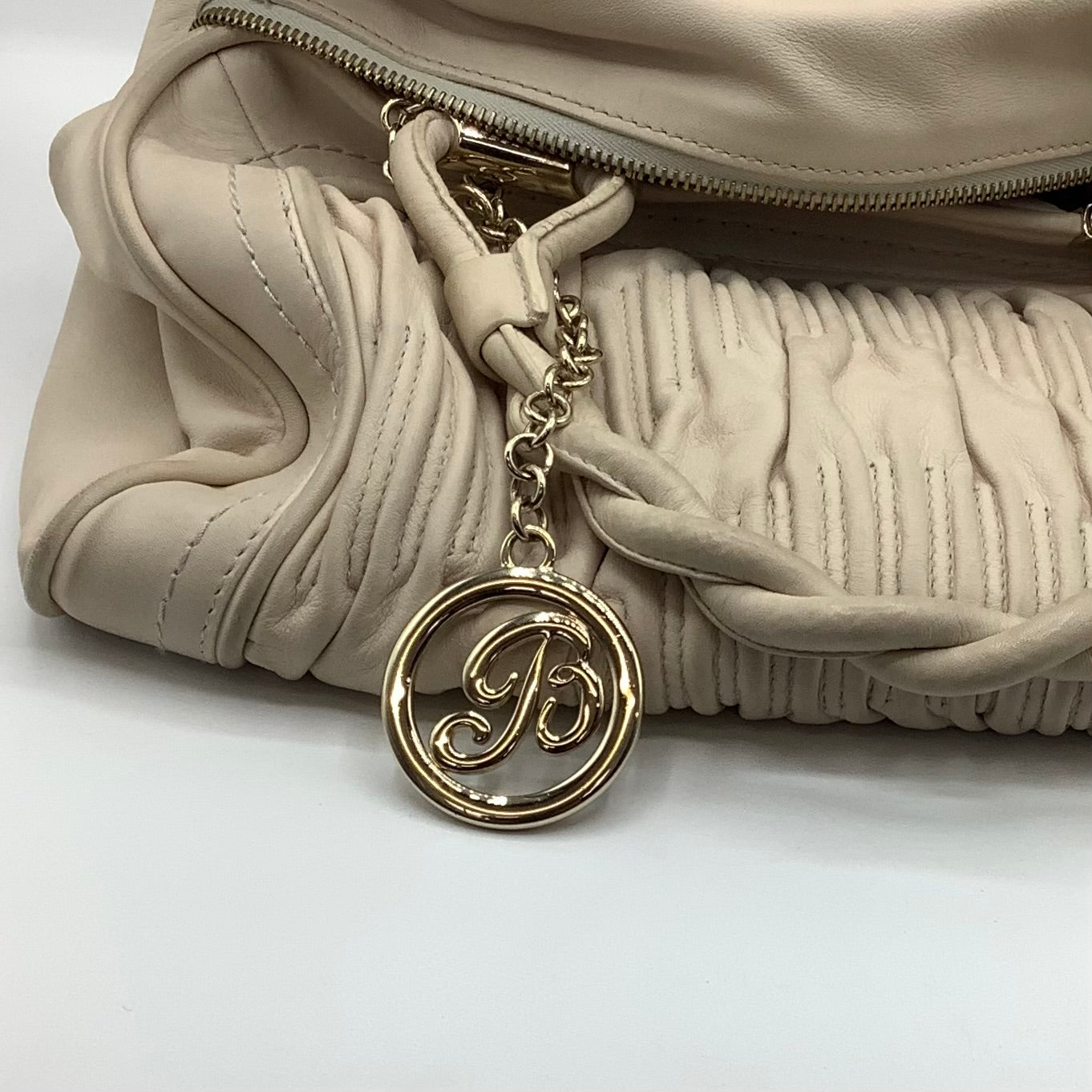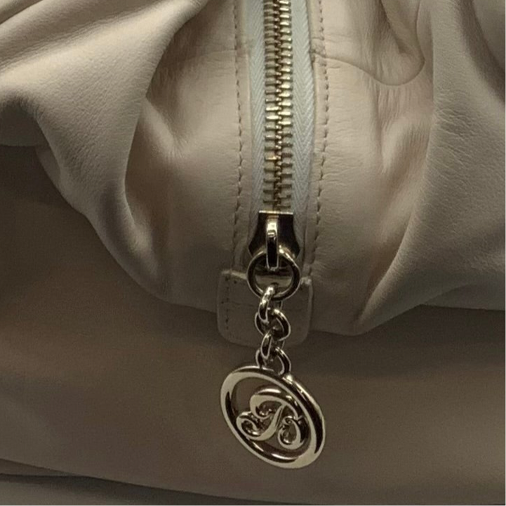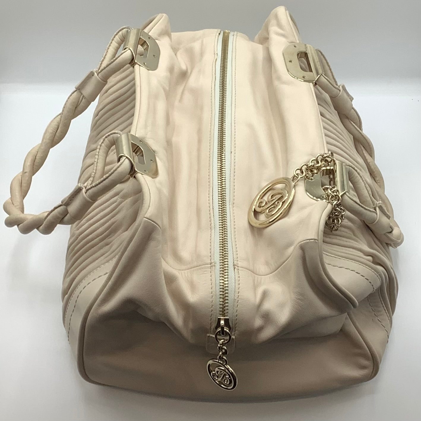 A refined Bally shoulder bag in rich, natural cream leather, featuring a decorative pattern. Polished gold-tone hardware accompanies twisted leather straps, exemplifying understated elegance. Zip closure and zipped internal pocket ensures security and convenience.