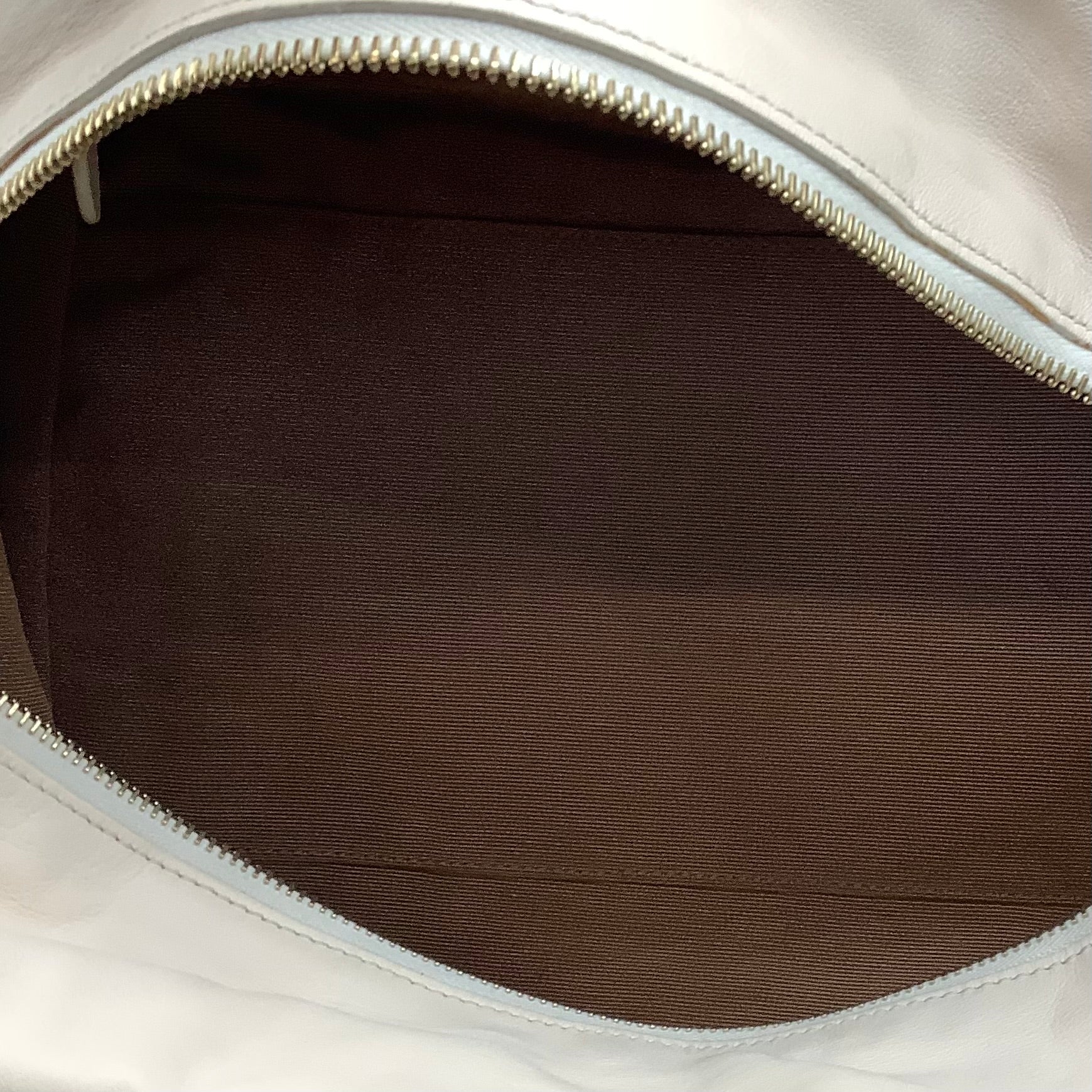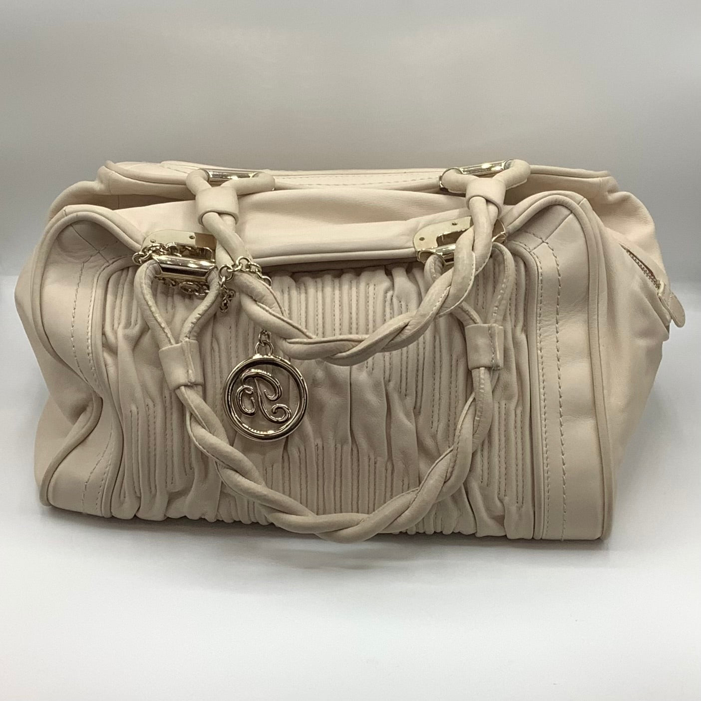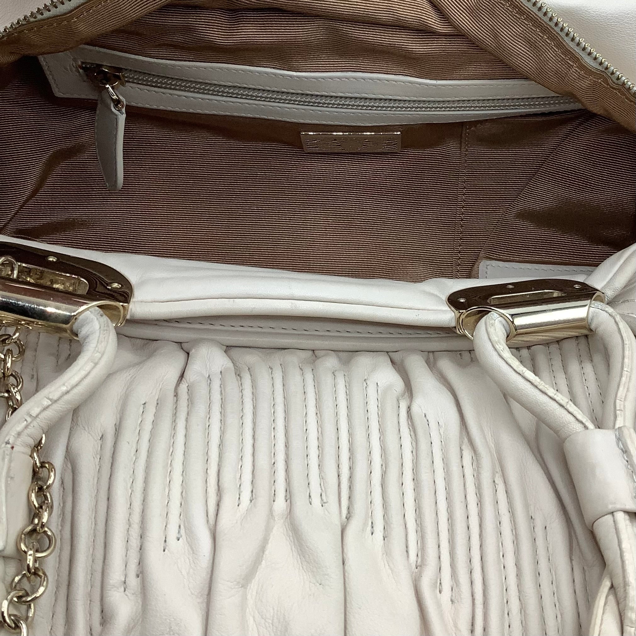 A refined Bally shoulder bag in rich, natural cream leather, featuring a decorative pattern. Polished gold-tone hardware accompanies twisted leather straps, exemplifying understated elegance. Zip closure and zipped internal pocket ensures security and convenience.