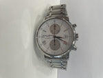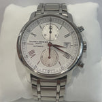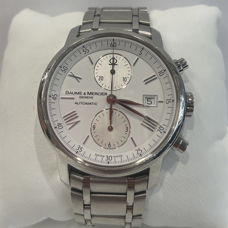 The Baume & Mercier Classima XL Chronograph, reference 65591, is a distinguished timepiece that seamlessly blends classic design with modern functionality. Encased in polished stainless steel, the 42mm case exudes a refined presence on the wrist. The white dial is adorned with silver-tone hands and Roman numeral hour markers, offering a harmonious balance of elegance and readability. The chronograph function includes sub-dials for measuring elapsed time, enhancing its practicality. A date display is discreetly positioned at 3 o’clock for added convenience. The watch is powered by a self-winding automatic movement, ensuring reliable performance. Completing the ensemble is a stainless steel bracelet, secured with a deployant clasp, providing both comfort and a seamless aesthetic.