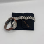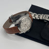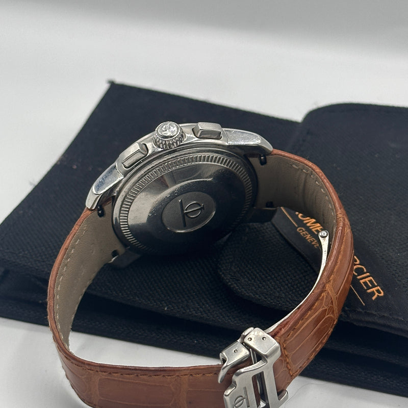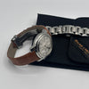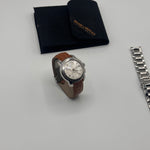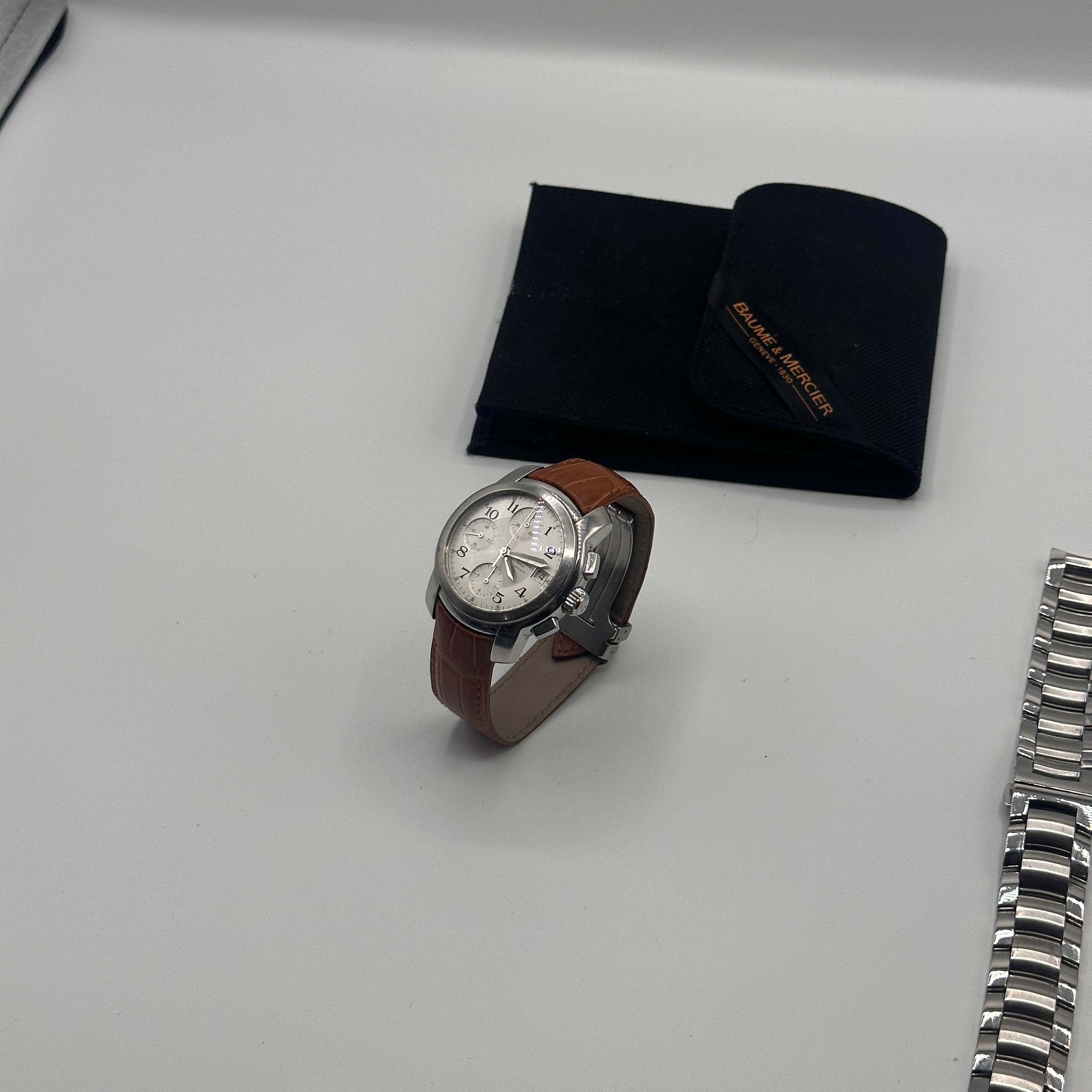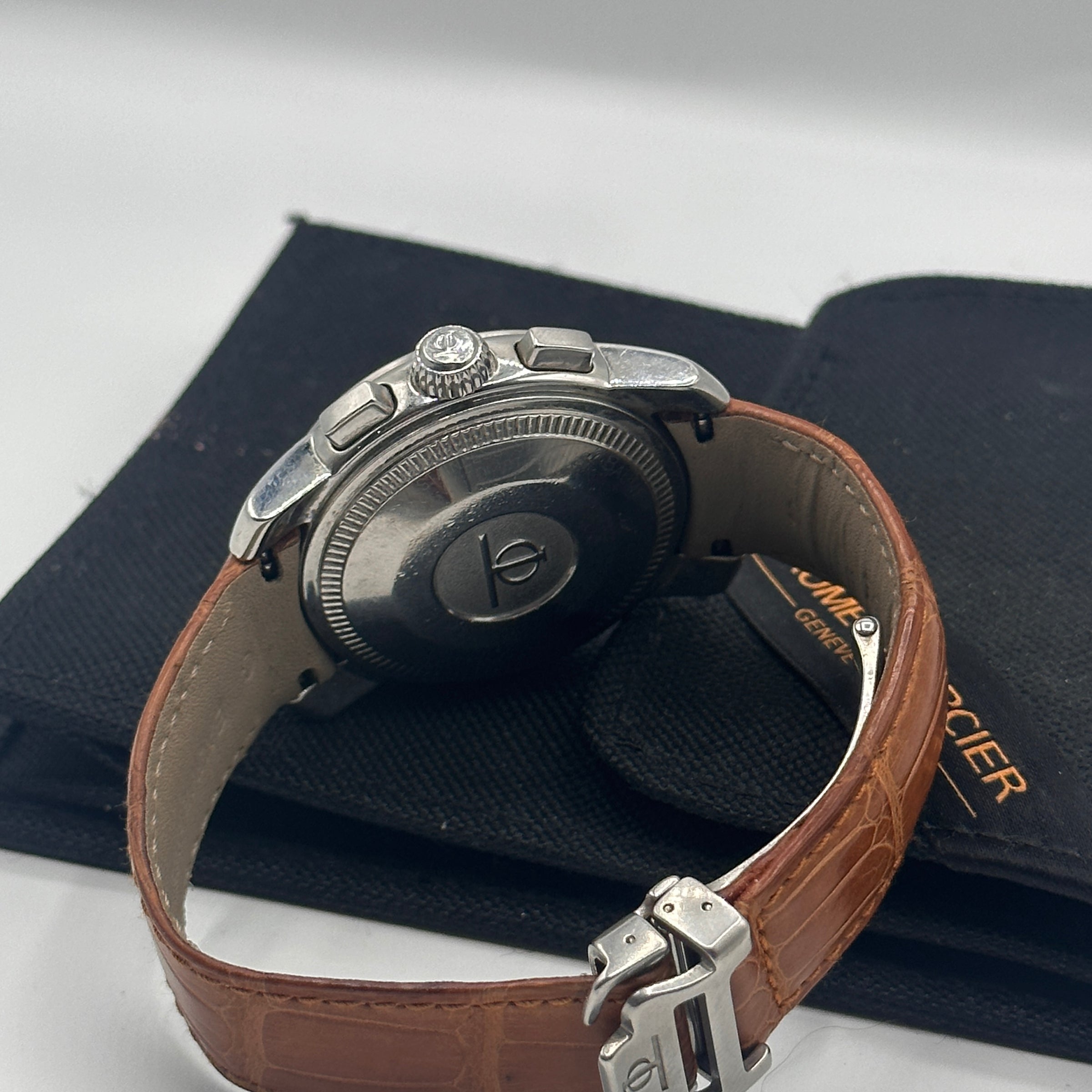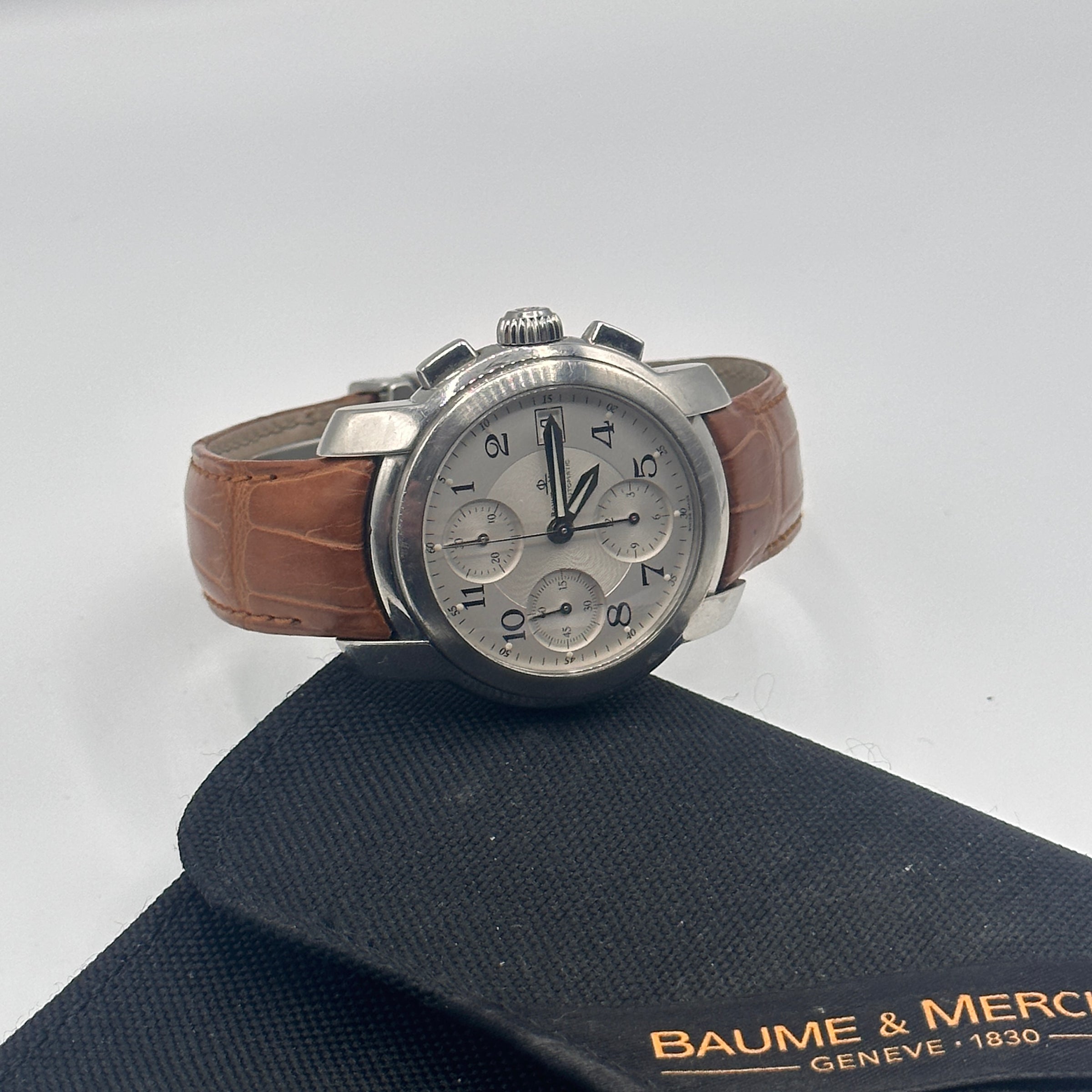 • Materials & Design: The Baume & Mercier Capeland Chronograph Ref. MV045216 features a 38.5mm stainless steel case with a thickness of approximately 15mm. The silver dial showcases a guilloché center, complemented by black Arabic numerals and chronograph sub-dials. The watch is fitted with a brown leather strap with deployant clasp; as well as a stainless steel bracelet, secured by a fold-over clasp with safety features.