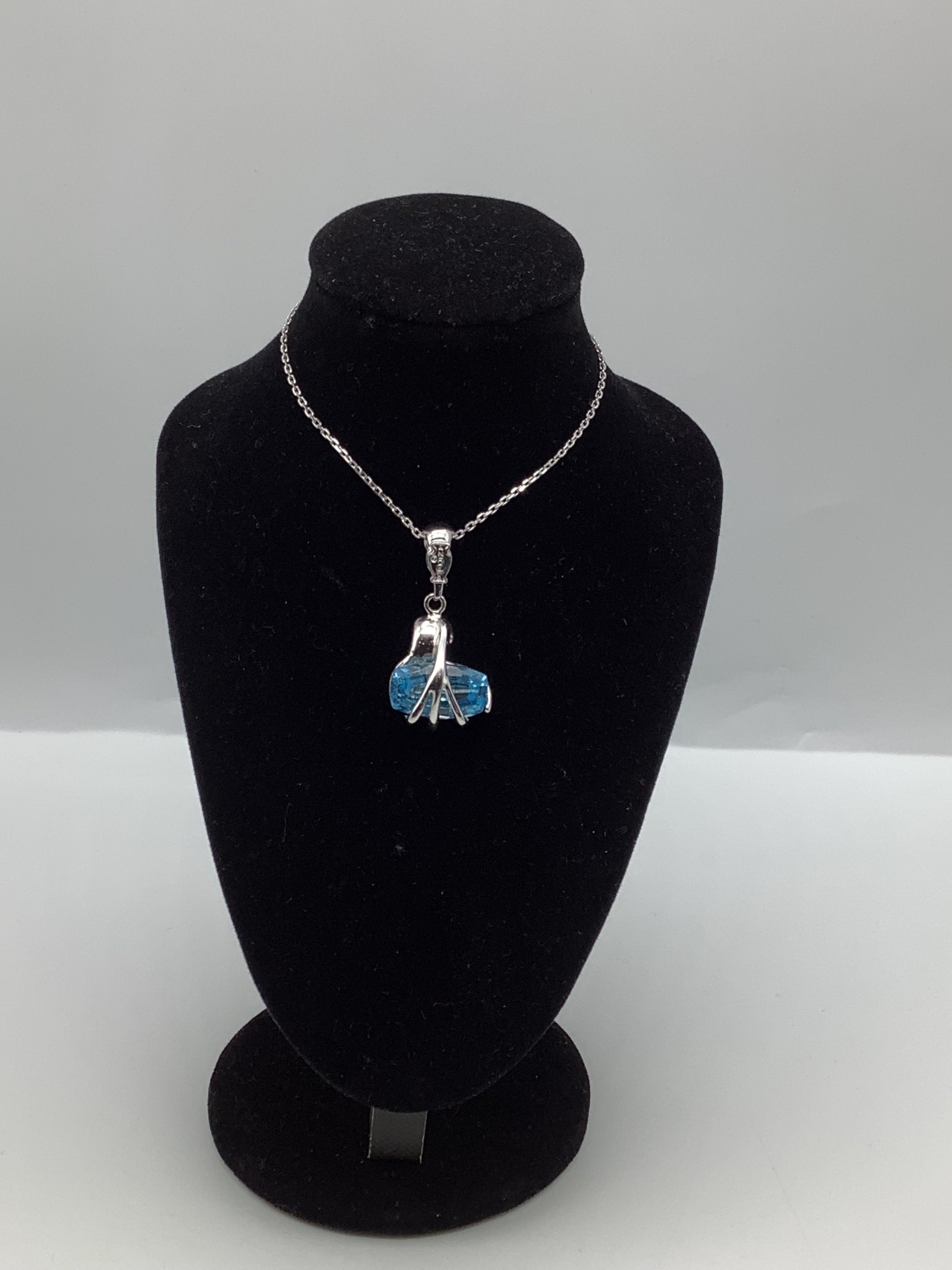 This stunning Blue Topaz Pendant is set in a claw setting that uniquely resembles a hand or claw, adding an artistic and modern touch to the design. Crafted from luxurious 18ct white gold, the pendant showcases the captivating blue hue of the topaz, which contrasts beautifully with the cool tone of the white gold. The claw setting ensures that the stone is securely held while allowing light to pass through, enhancing its brilliance. The design is both striking and sophisticated, making it an ideal statement piece for any jewellery collection. -
