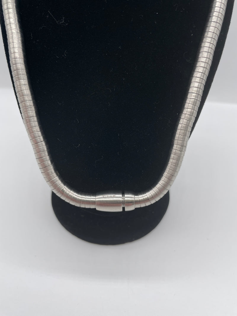 Crafted from high-polish silver-toned metal, this Breil necklace features a segmented chain design—each link precisely engineered for a sleek, contemporary aesthetic. The smooth, architectural finish of the segments reflects light with every movement, adding understated sophistication to any look. The necklace is secured with a robust twist lock clasp, offering both a modern visual accent and practical, reliable fastening.
