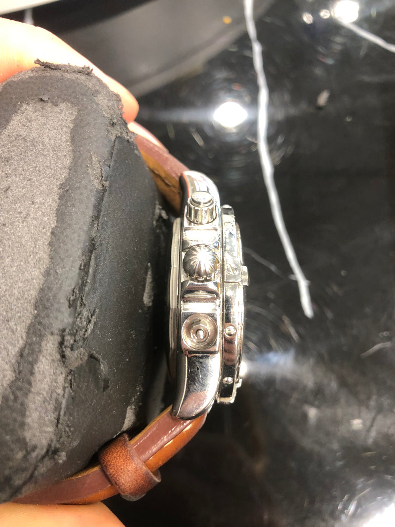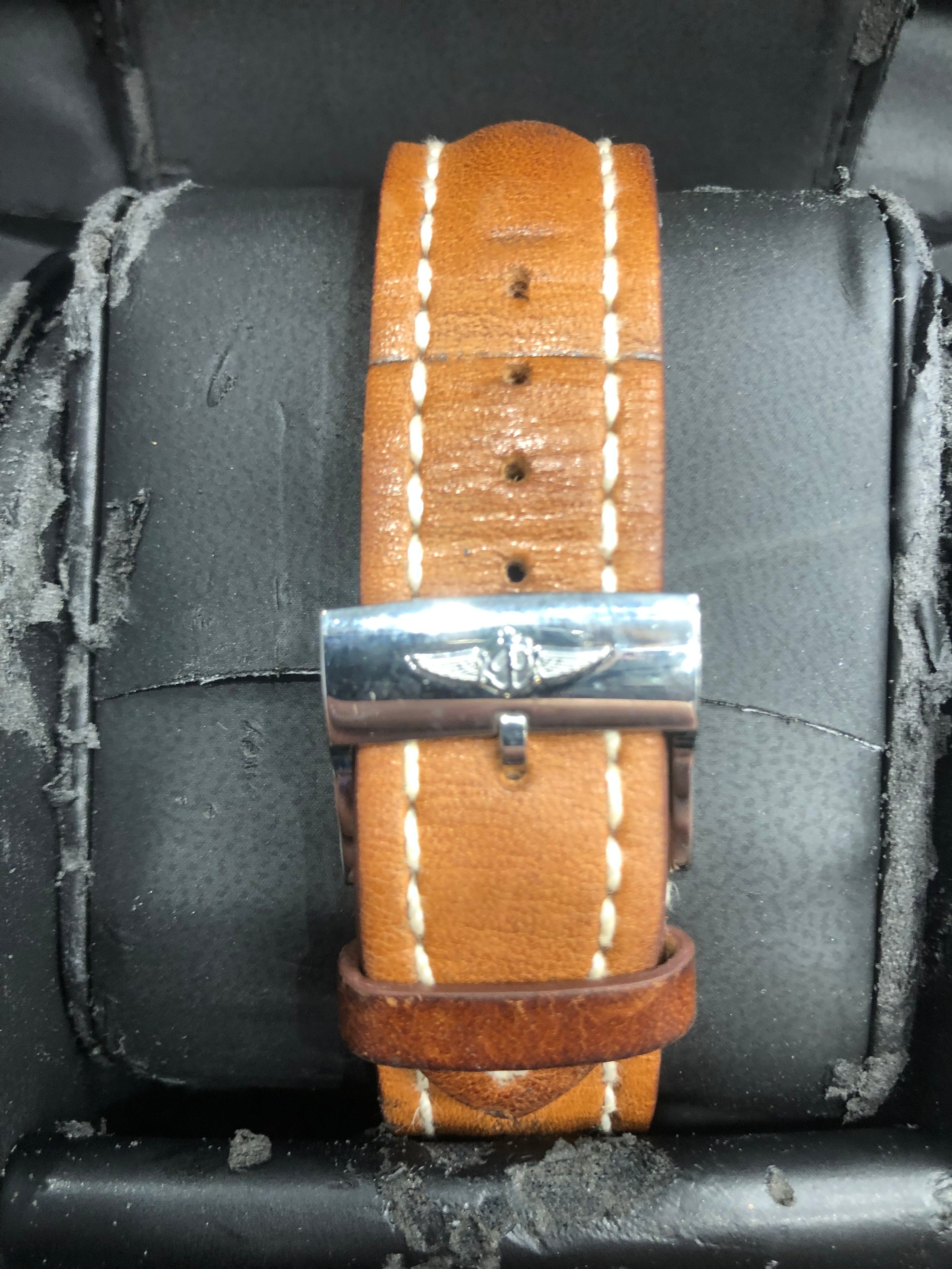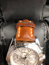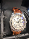Automatic movement, chronograph style, with baton dial type. The watch has a white face and is on a brown leather strap.