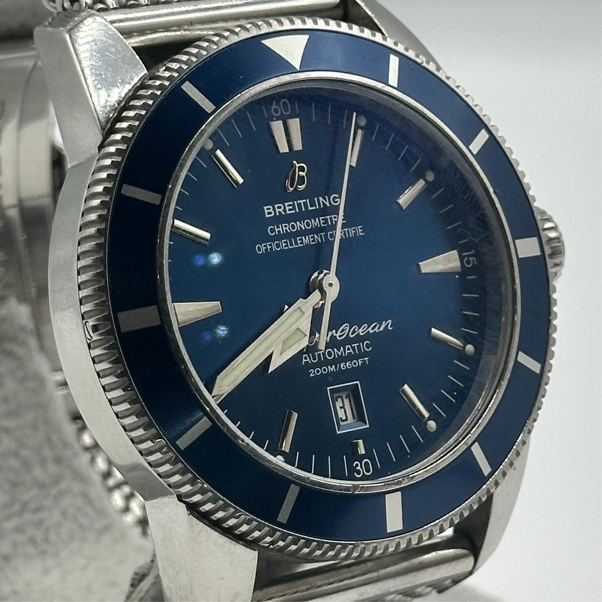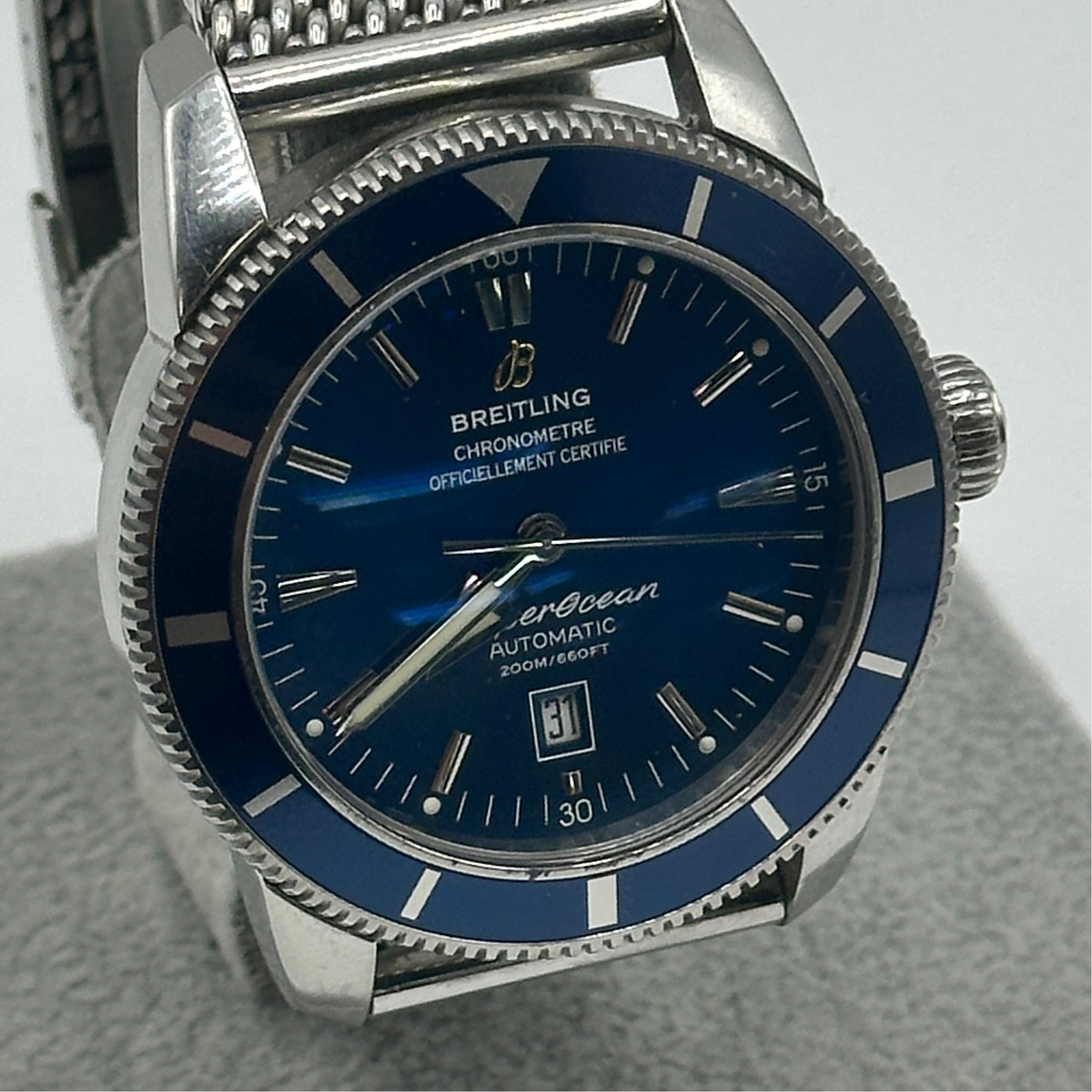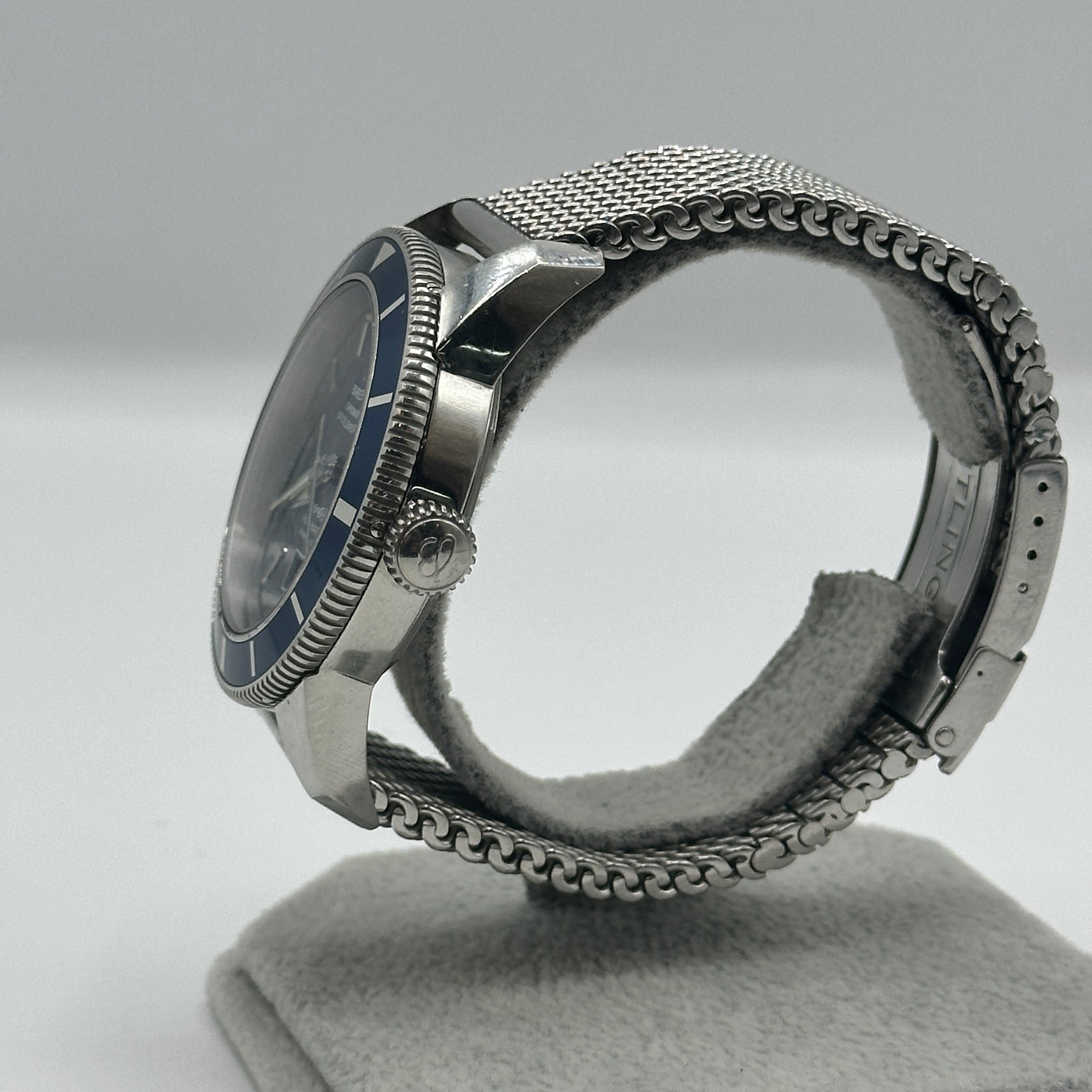 The Breitling Superocean Heritage 45, reference A17320, features a 45mm stainless steel case with a unidirectional rotating bezel, embodying a classic dive watch aesthetic. The blue dial is complemented by luminous hands and hour markers, ensuring optimal readability in various lighting conditions. The watch is paired with a stainless steel mesh bracelet, enhancing its robust and sporty appeal. Equipped with the Breitling Calibre 17 automatic movement, the watch offers a power reserve of approximately 42 hours.