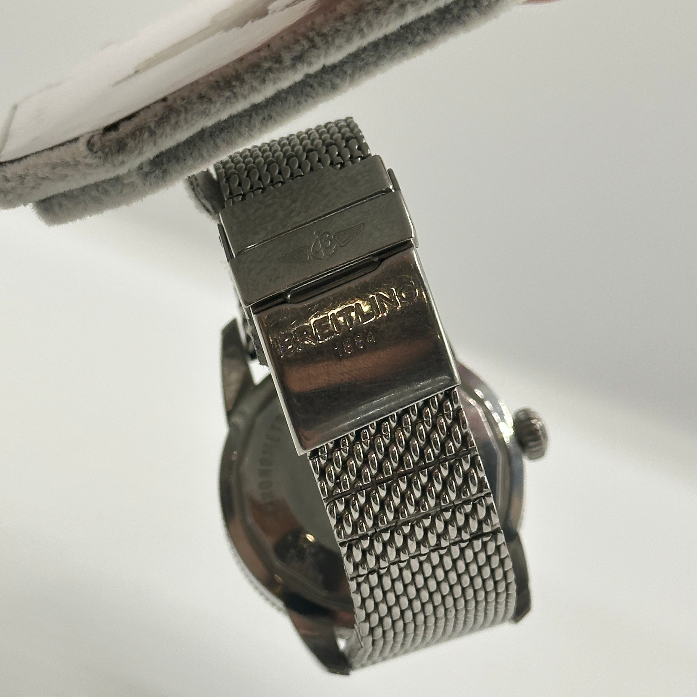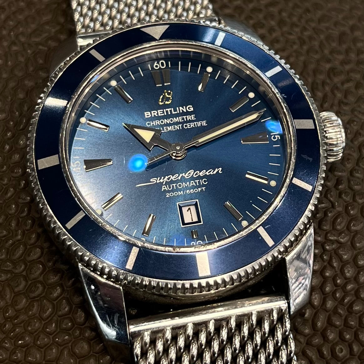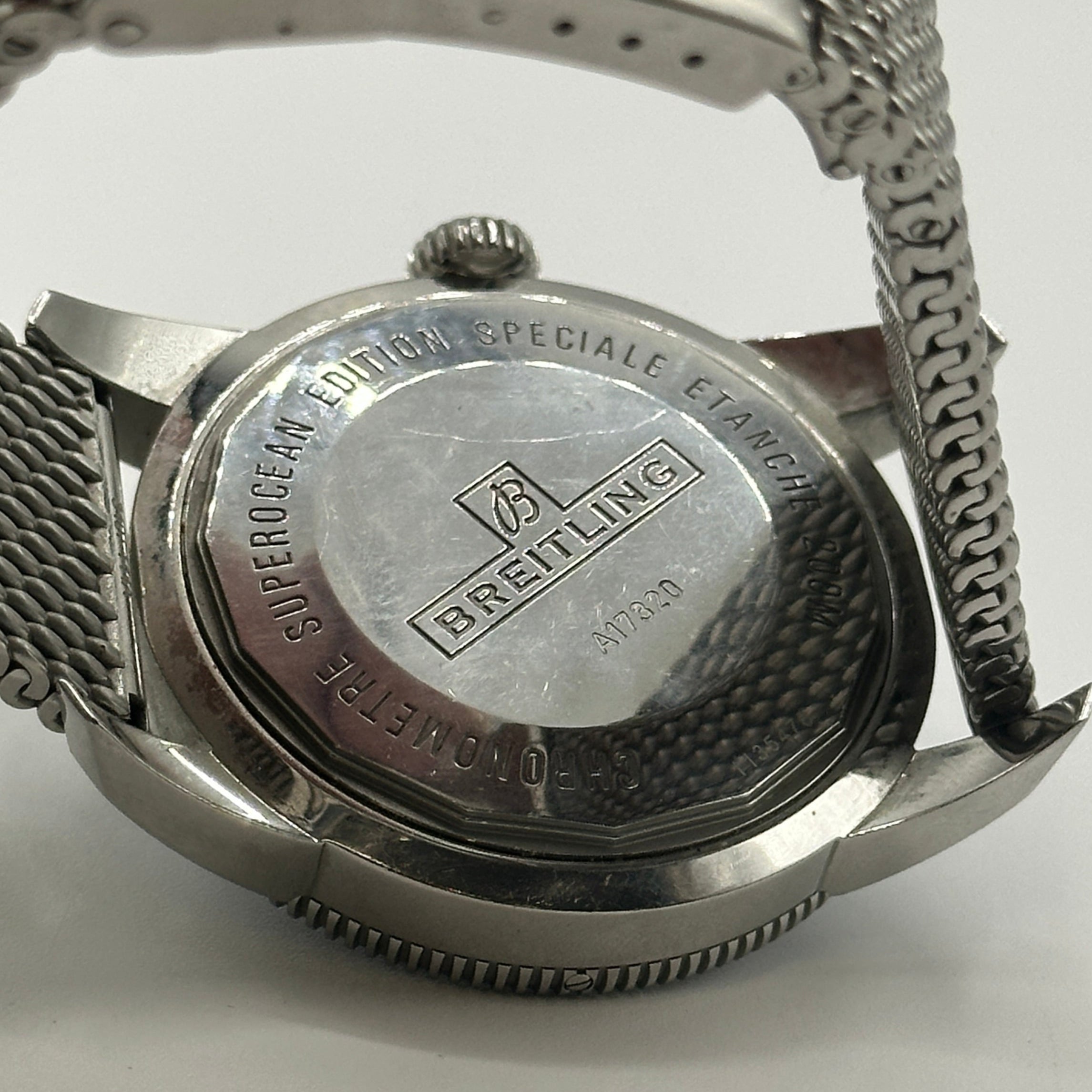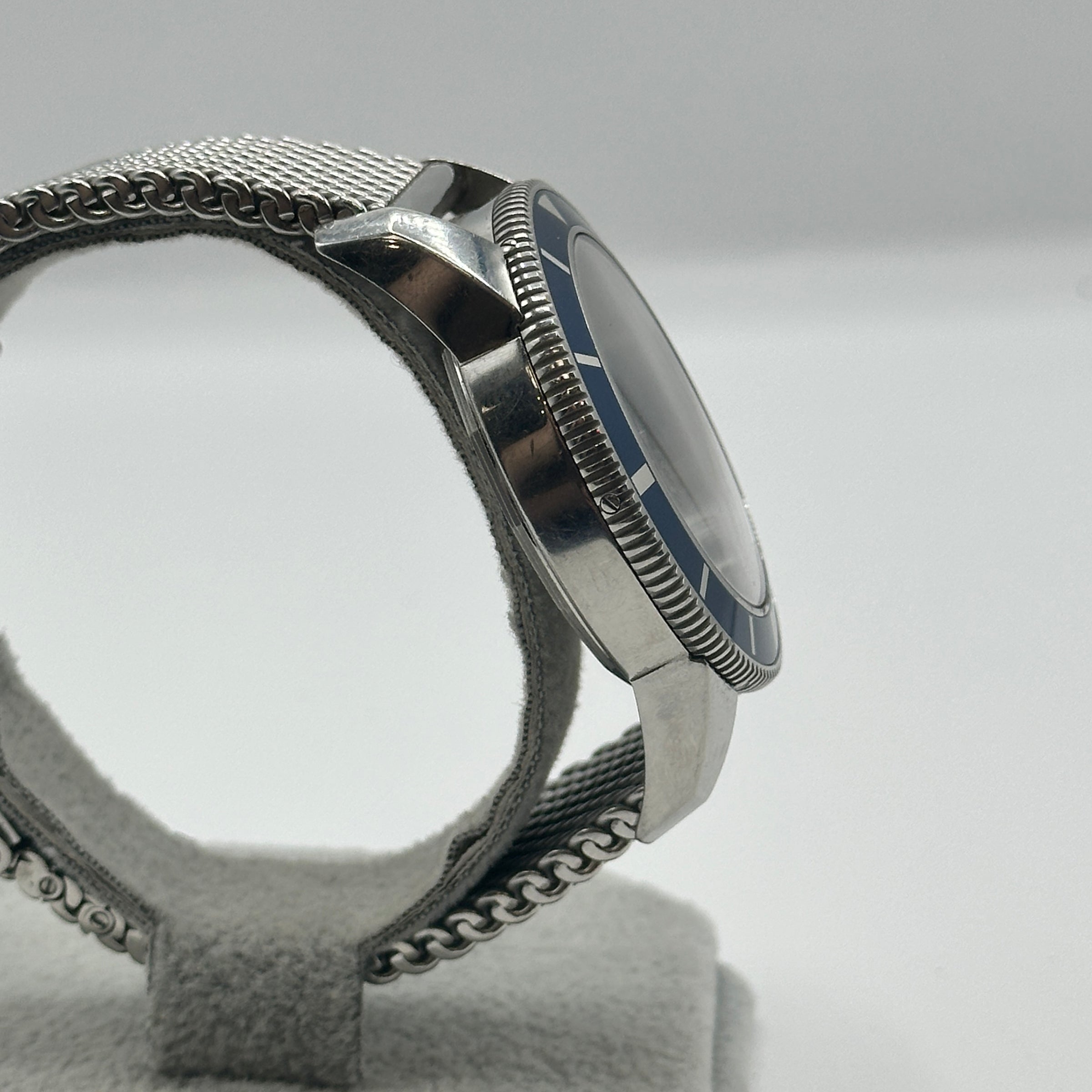 The Breitling Superocean Heritage 45, reference A17320, features a 45mm stainless steel case with a unidirectional rotating bezel, embodying a classic dive watch aesthetic. The blue dial is complemented by luminous hands and hour markers, ensuring optimal readability in various lighting conditions. The watch is paired with a stainless steel mesh bracelet, enhancing its robust and sporty appeal. Equipped with the Breitling Calibre 17 automatic movement, the watch offers a power reserve of approximately 42 hours.