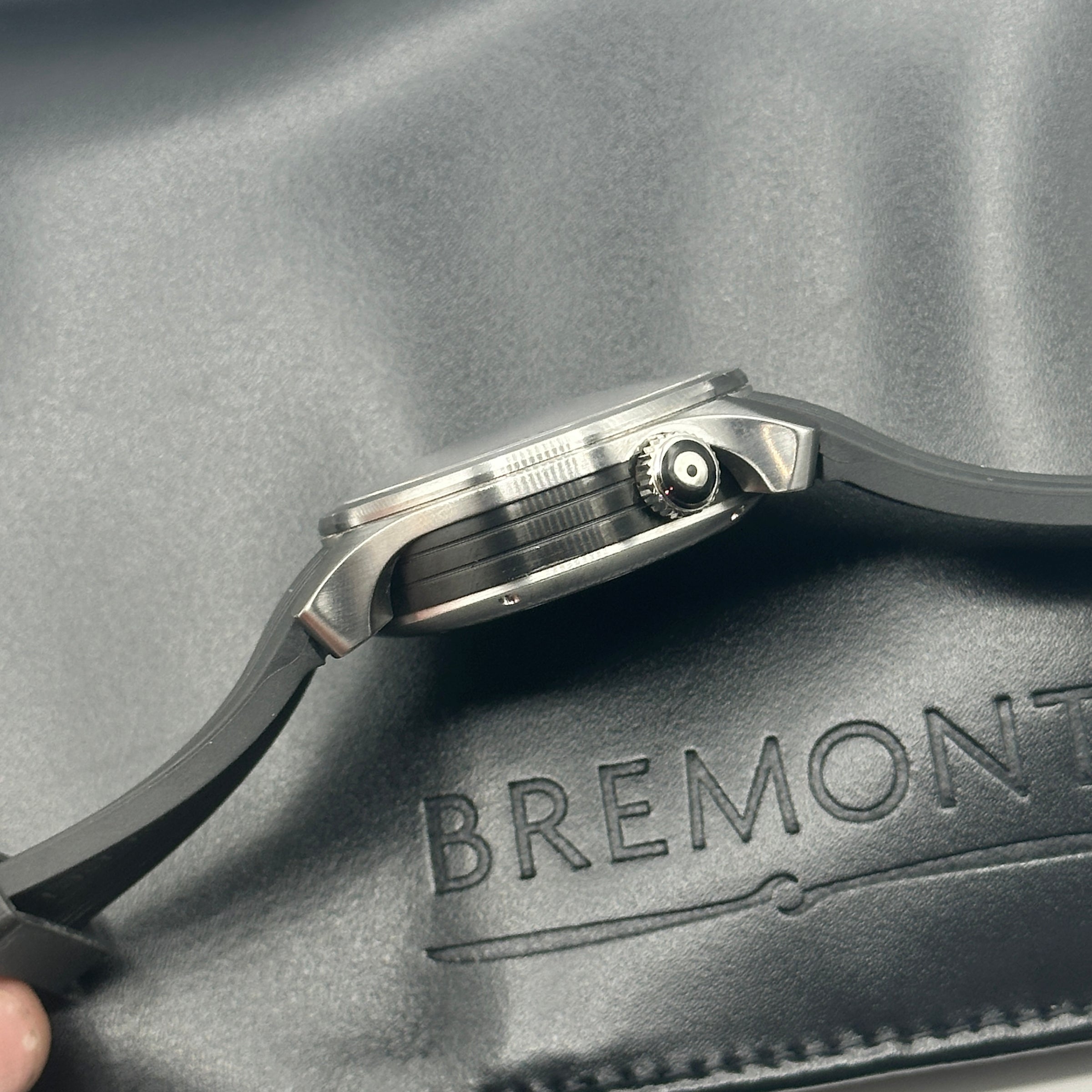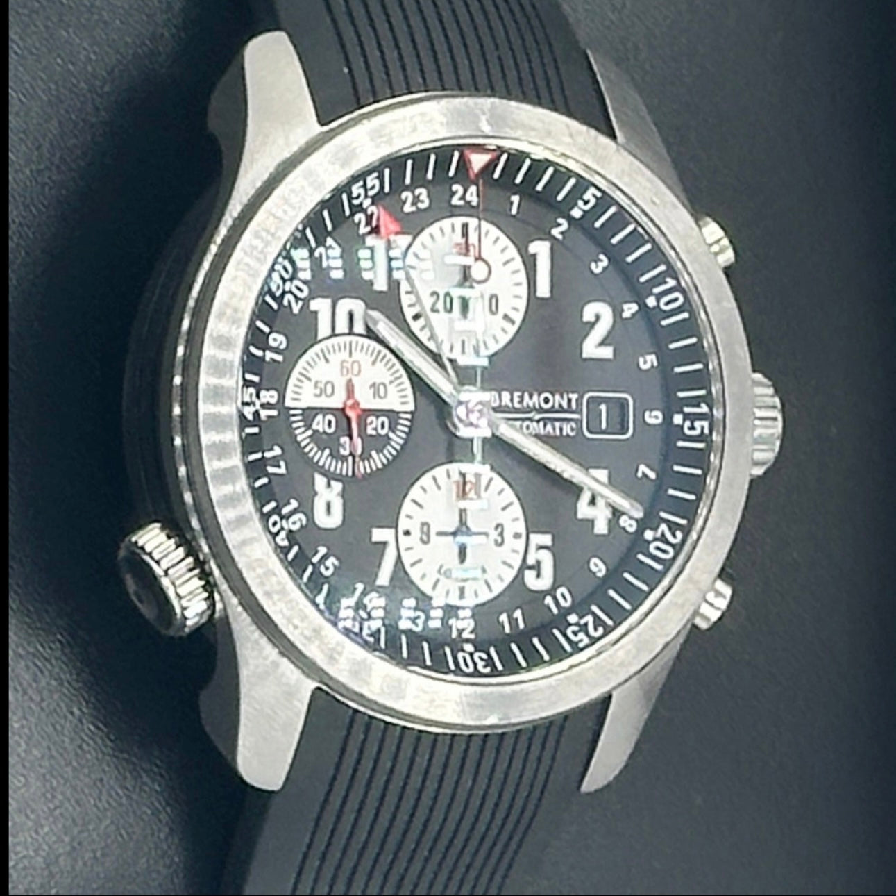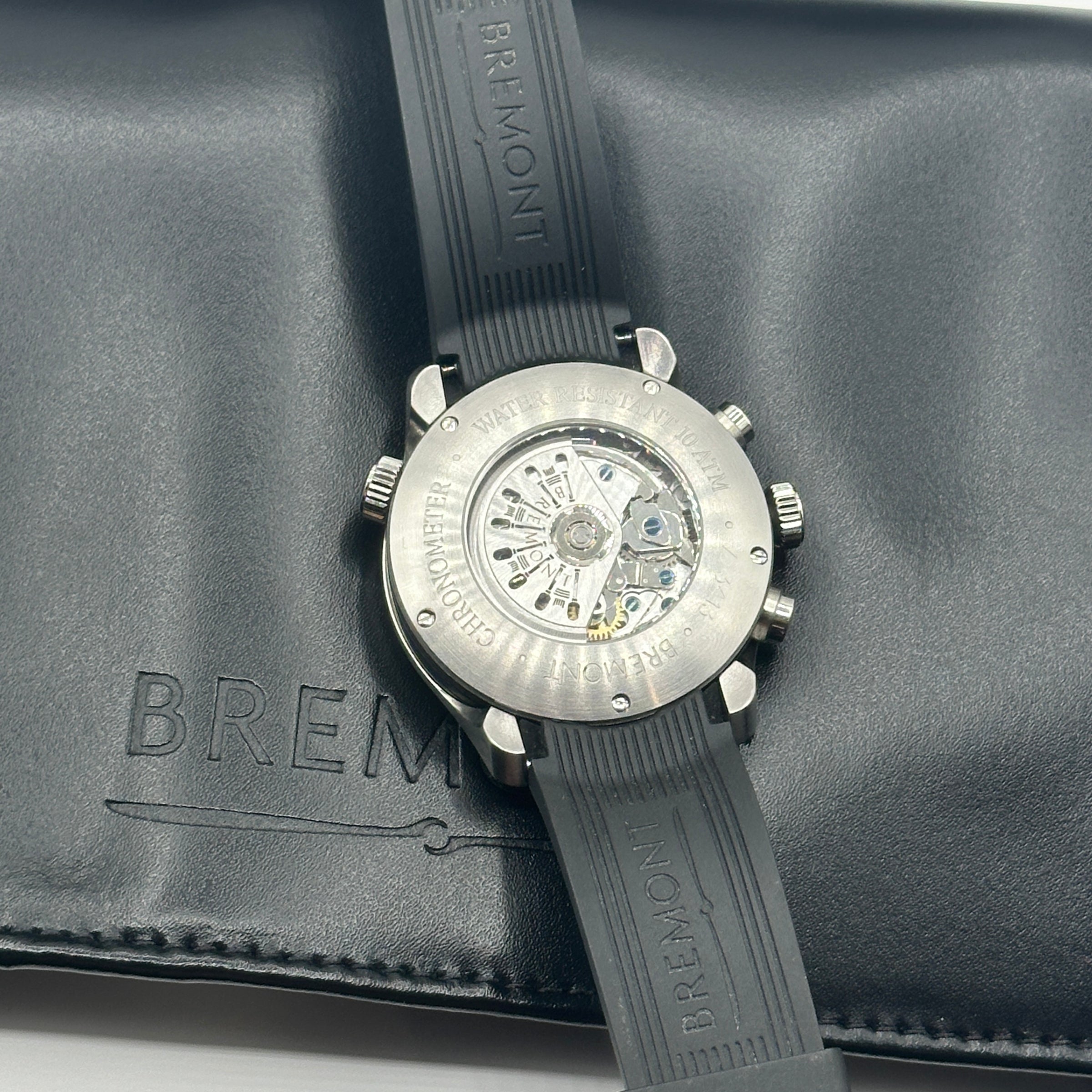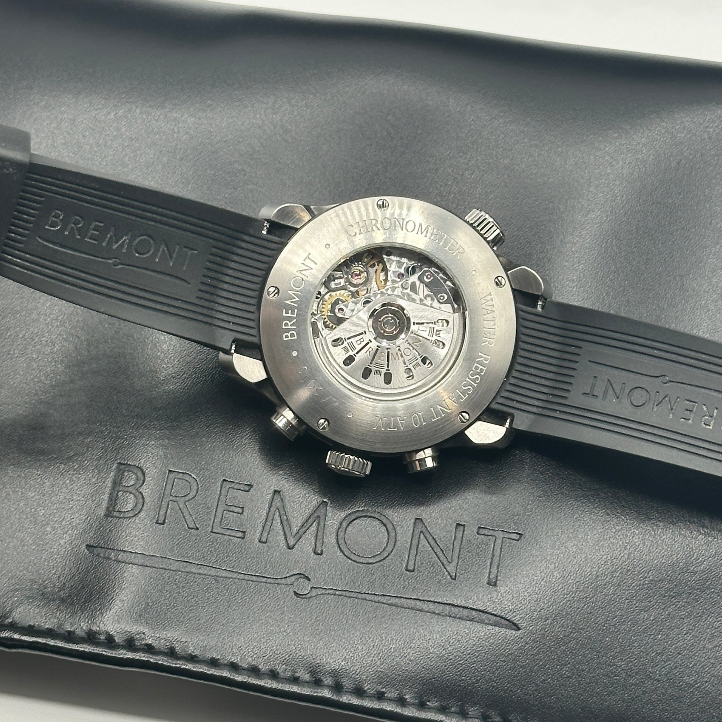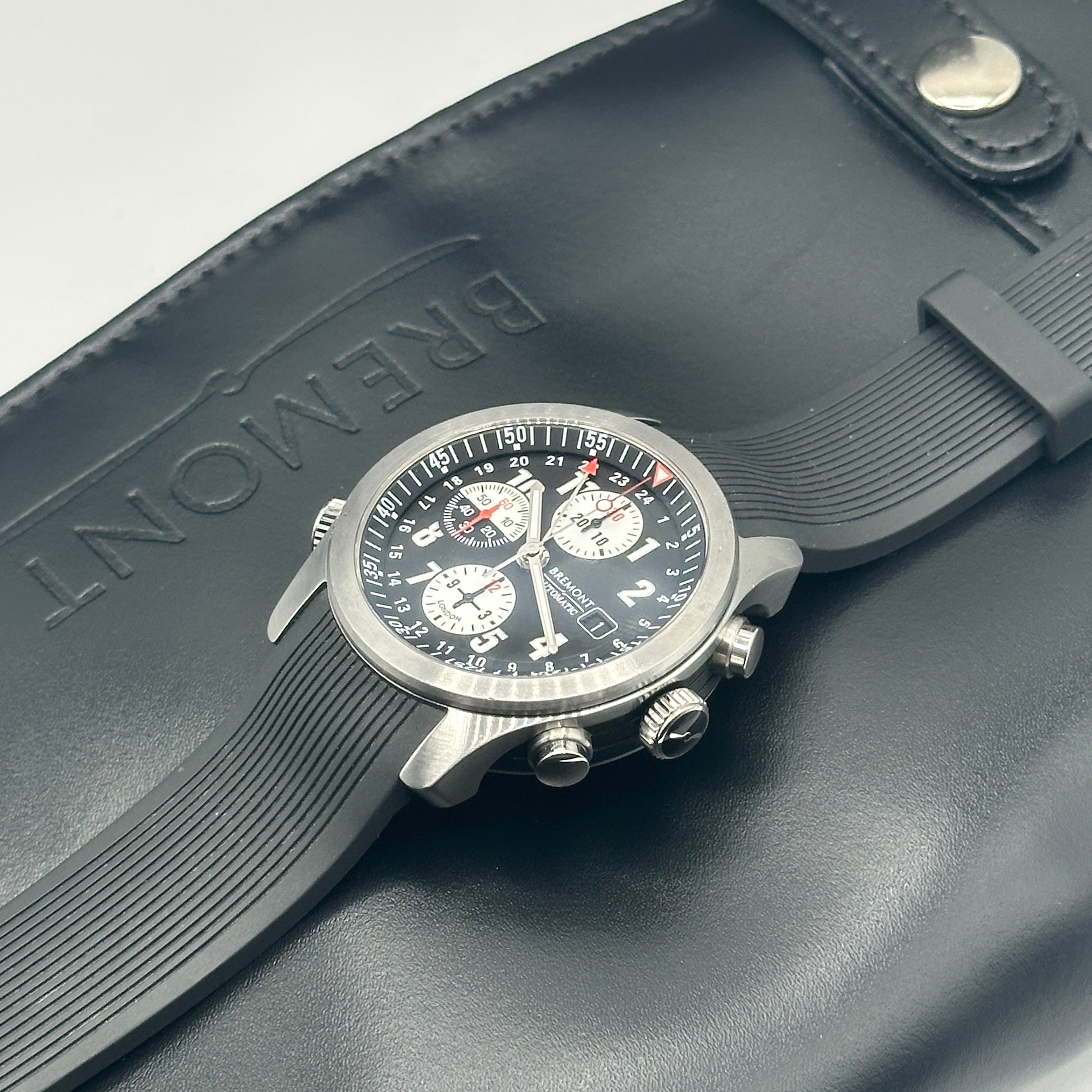 This Bremont's ALT1 has a hardened and distinctive 43mm stainless steel Trip-Tick® case with a DLC-treated middle barrel and scratch‑resistant finish. There are several useful features on this pilot's watch; a 12-hour chronograph, 24-hour adjustable 'GMT' time-zone, and internal 60 minute Roto‑Click® bezel that is rotated by the crown at 8 o'clock. The domed, double anti‑reflective sapphire crystal gives a clear view of the movement, and on the rear there is a sapphire crystal displaying the automatic movement. Said movement is the BE-54AE certified chronometer (a modified ETA 7754 ensuring ease of service), with 42 hours of power reserve. This watch comes on a Bremont rubber strap with buckle, and also a black Bremont leather with white stitching.