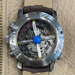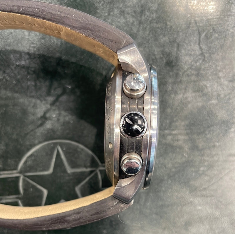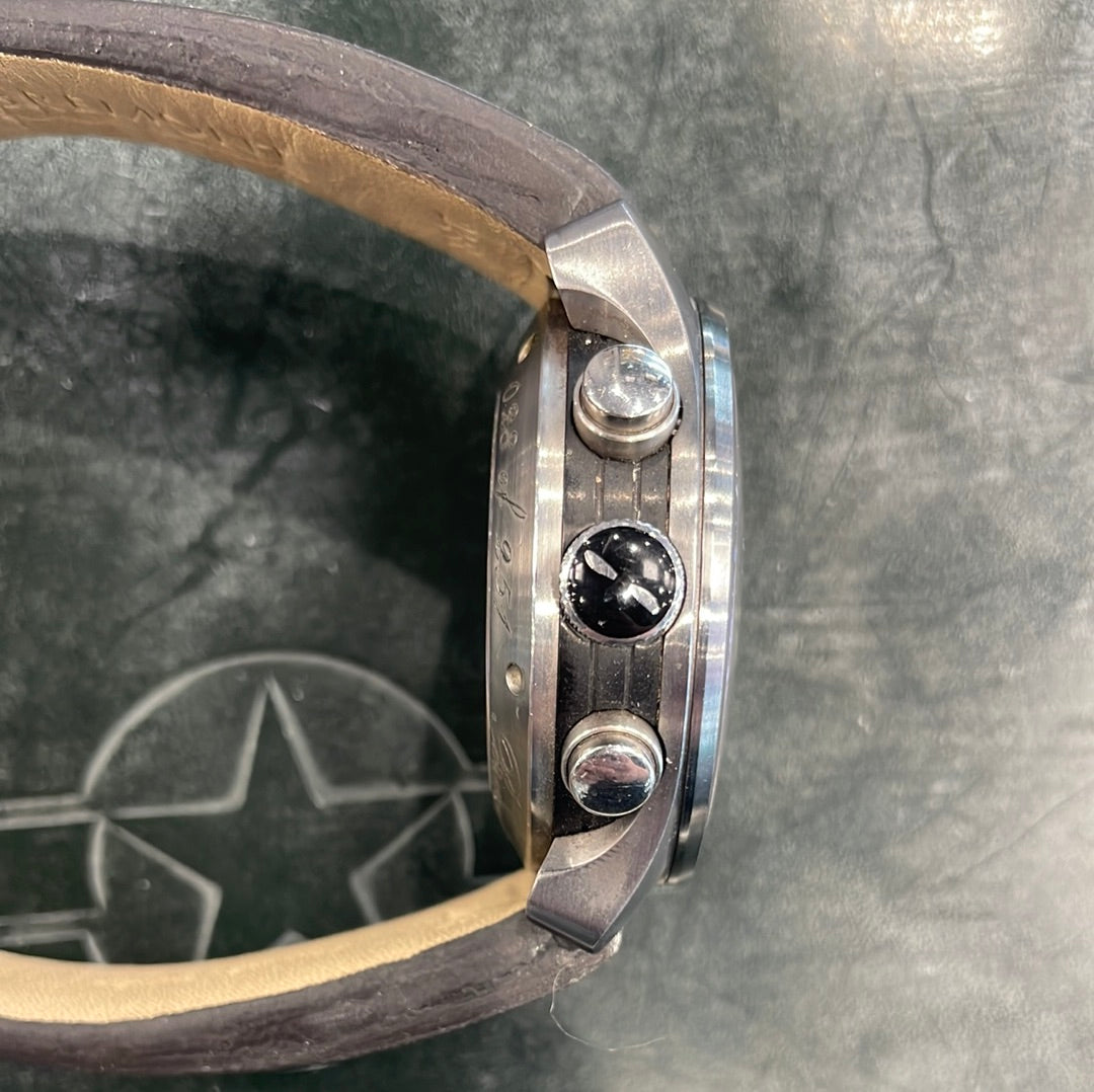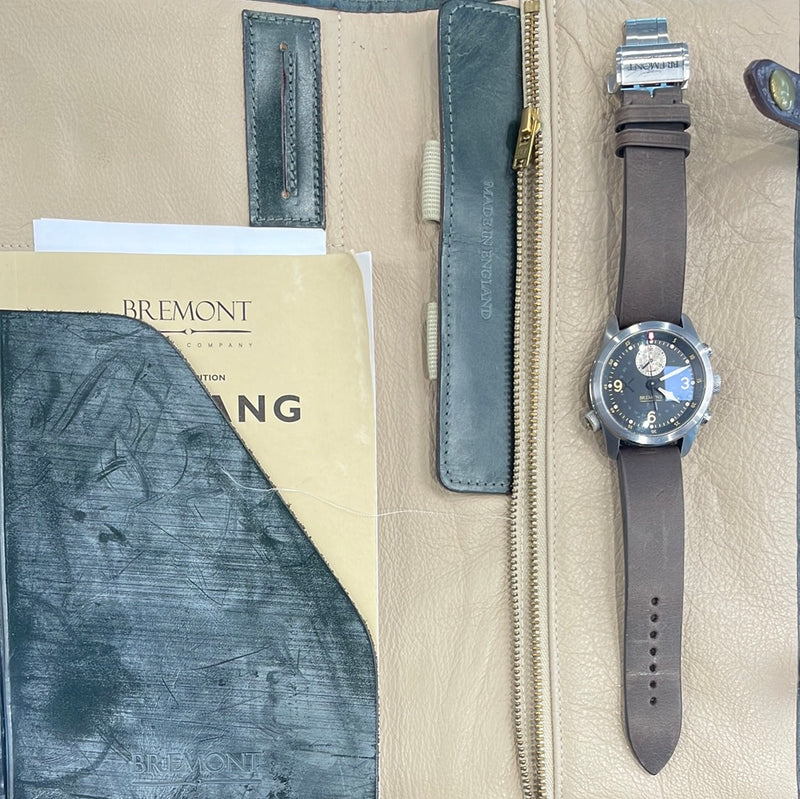This stunning limited edition Bremont features a 43mm hardened steel case, black dial, brushed gold sub dial and a brown leather bracelet. This watch is limited to 251 pieces, this being number 28.