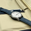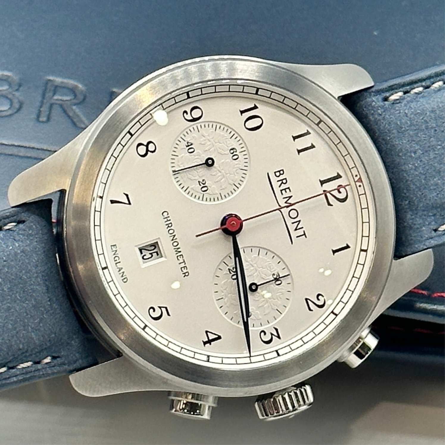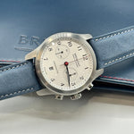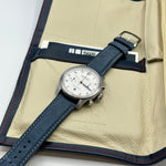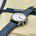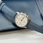 The Bremont ALT-1C Rose - a tribute to England's rugby team - boasts a 43mm satin and polished stainless steel case, following the brand's signature Trip-Tick design. The crisp white dial features the iconic England Rose subtly embossed on the sub-dials, and 'England' rather than 'London' at the 6 o'clock position. Blued hands and a red chronograph hand ensure legibility, and complement the mid-blue nuebuck leather strap. Powered by an automatic chronometer-rated movement, functions include a date at 6 o'clock, and a 30-minute sub-dial at 3 o'clock. Water-resistant to 100 metres, it is suitable for everyday wear.