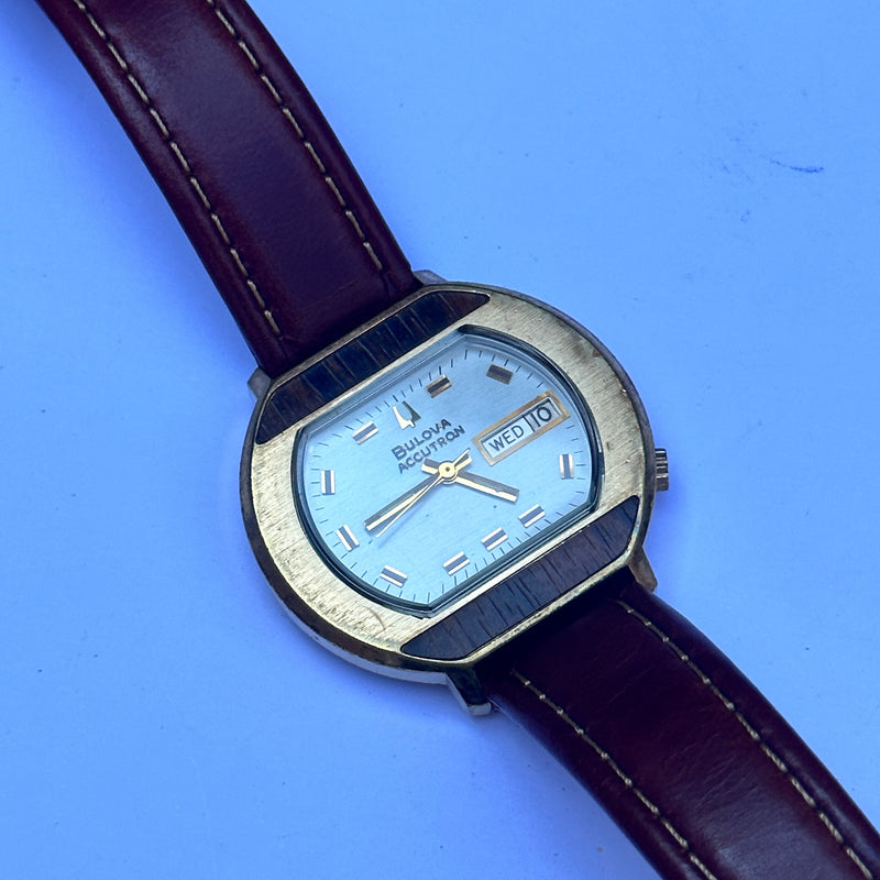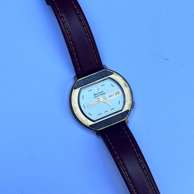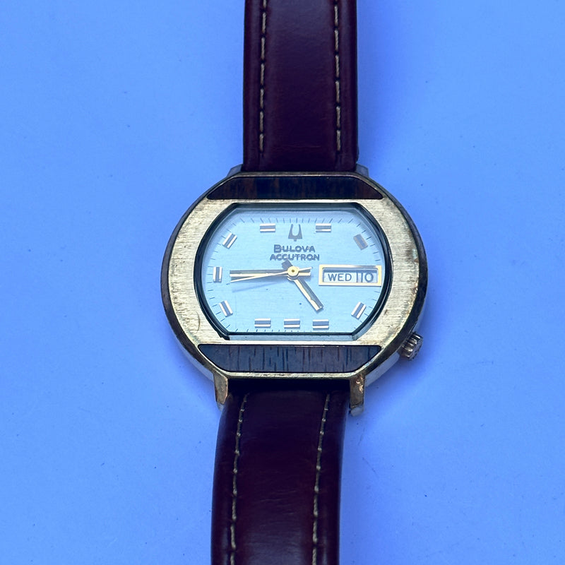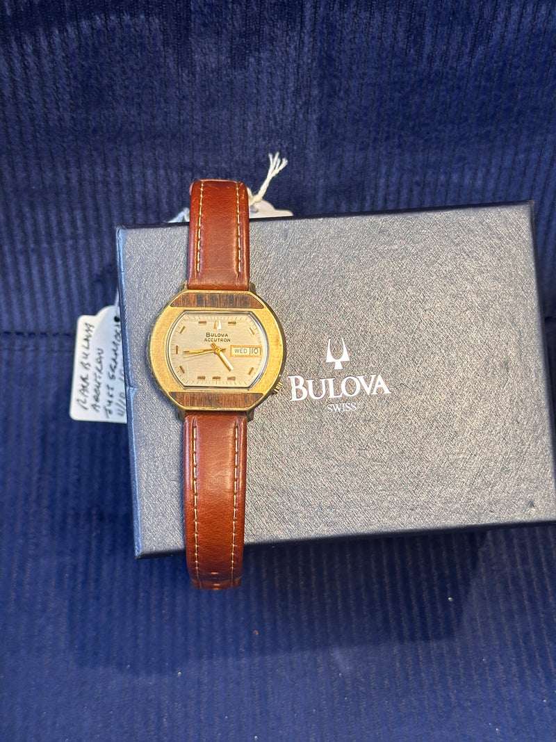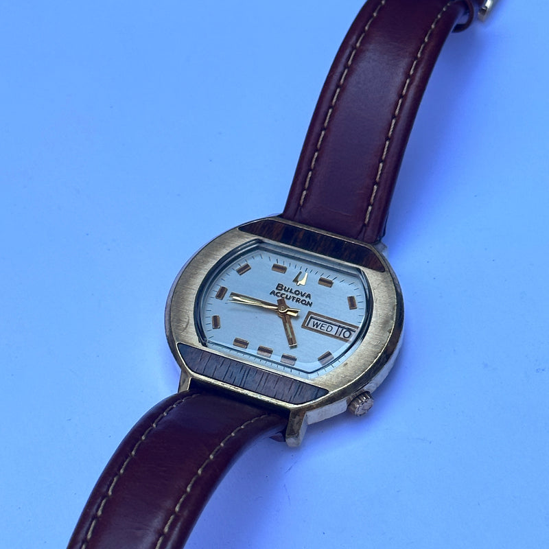 Due to the incredible accuracy of the Accutron Movements the 214 was the first to be certified for Railroad use and later in US government and military satellite clocks. A Bulova Accutron model also accompanied the Apollo 15 astronauts to the moon and was worn on the 3rd excursion on the surface. These models have incredible accuracy and are incredibly quiet to wear, unlike most battery operated movements which have a rather resounding tick, this Bulova hums.