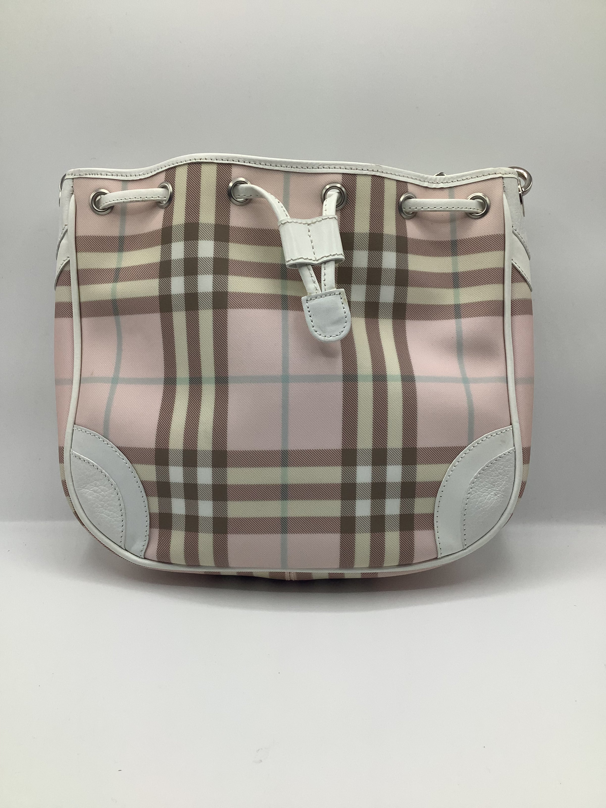Key Product Information: This Burberry shoulder bag showcases the brand's iconic tartan pattern in a charming pink hue, crafted from durable canvas material. The drawstring closure ensures secure storage while offering easy access to your belongings. Complemented by leather trim and a white nylon shoulder strap.