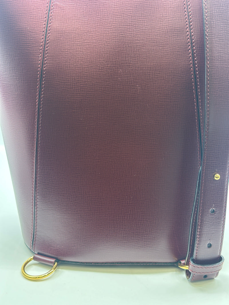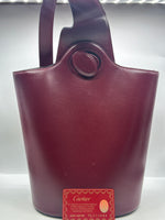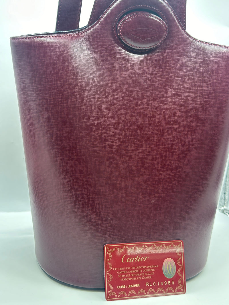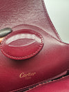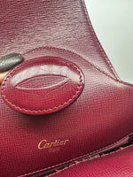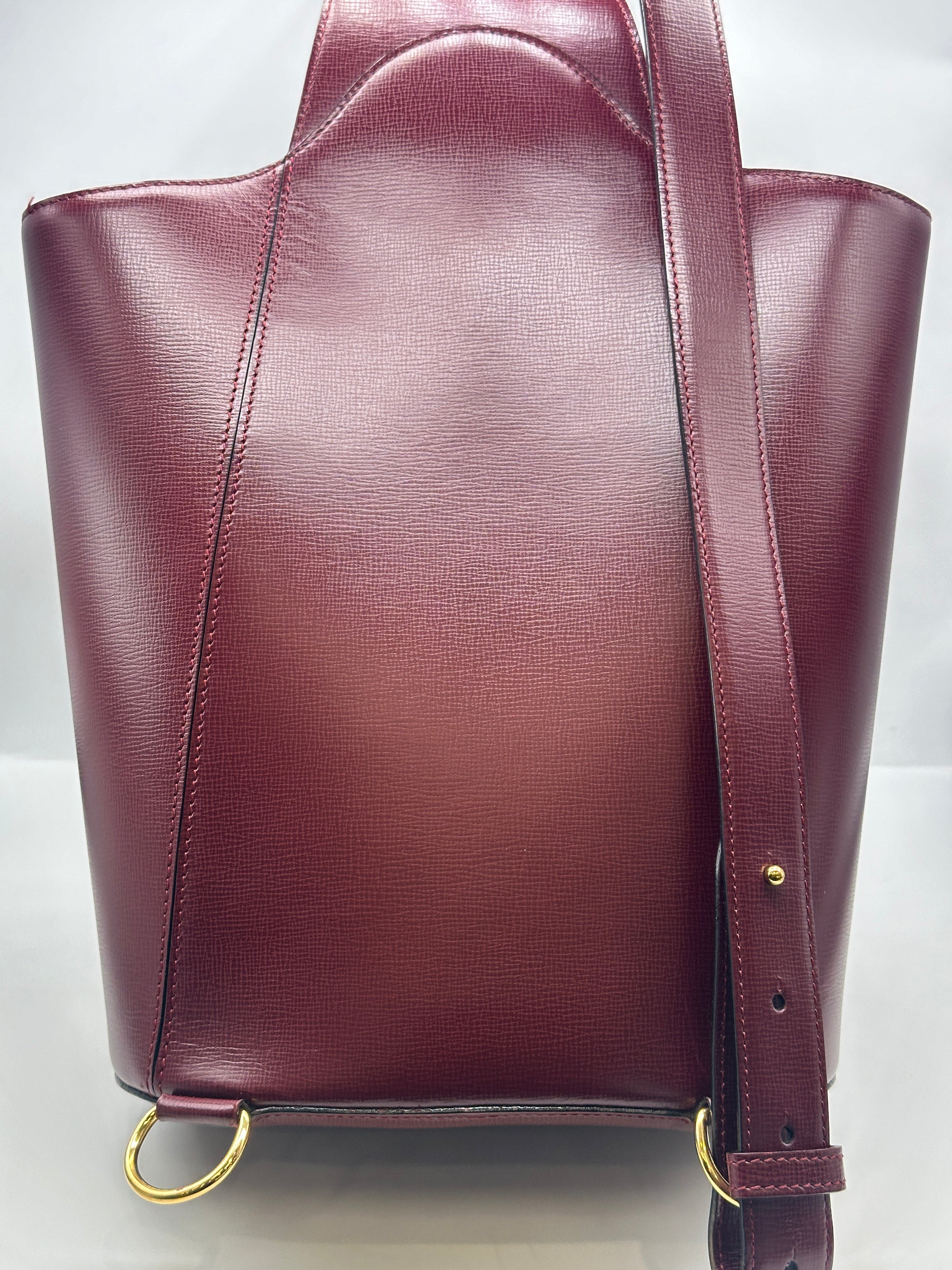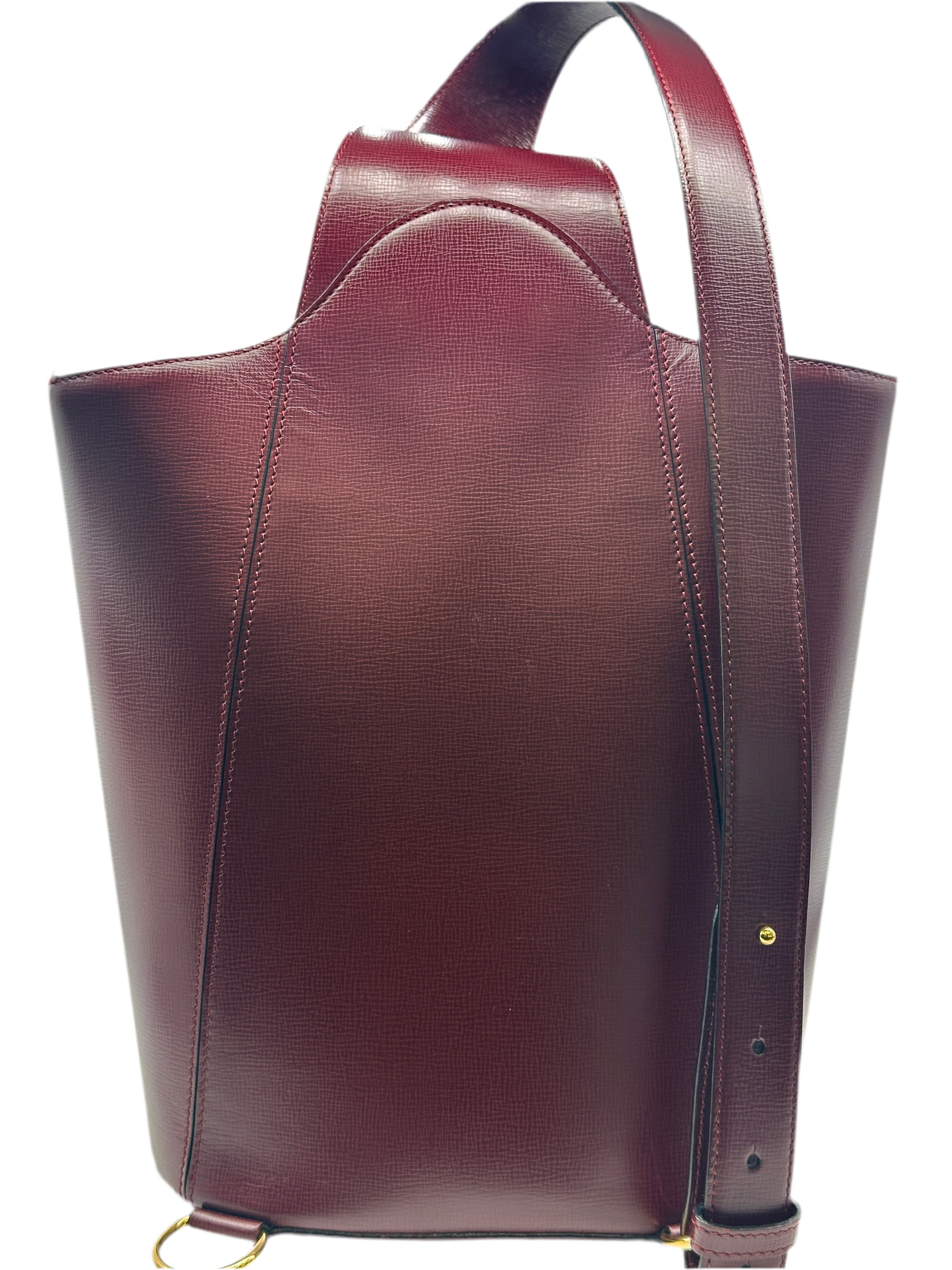 The Must De Cartier One Shoulder Backpack is meticulously crafted from luxurious red calf leather, exuding sophistication and durability. Its sleek design is complemented by dark bronze hardware, adding a touch of elegance.