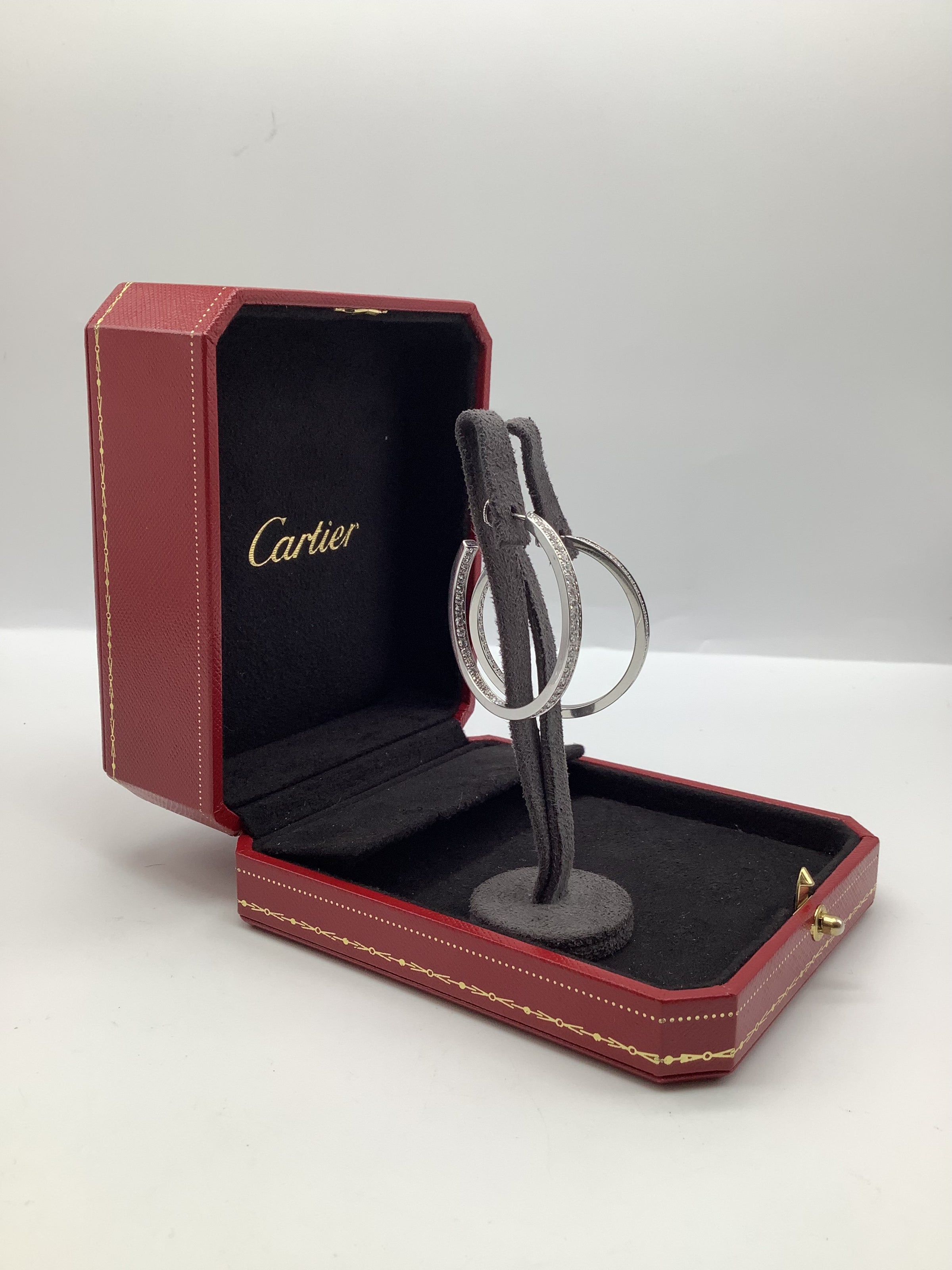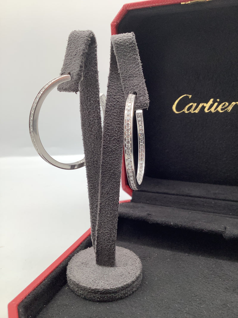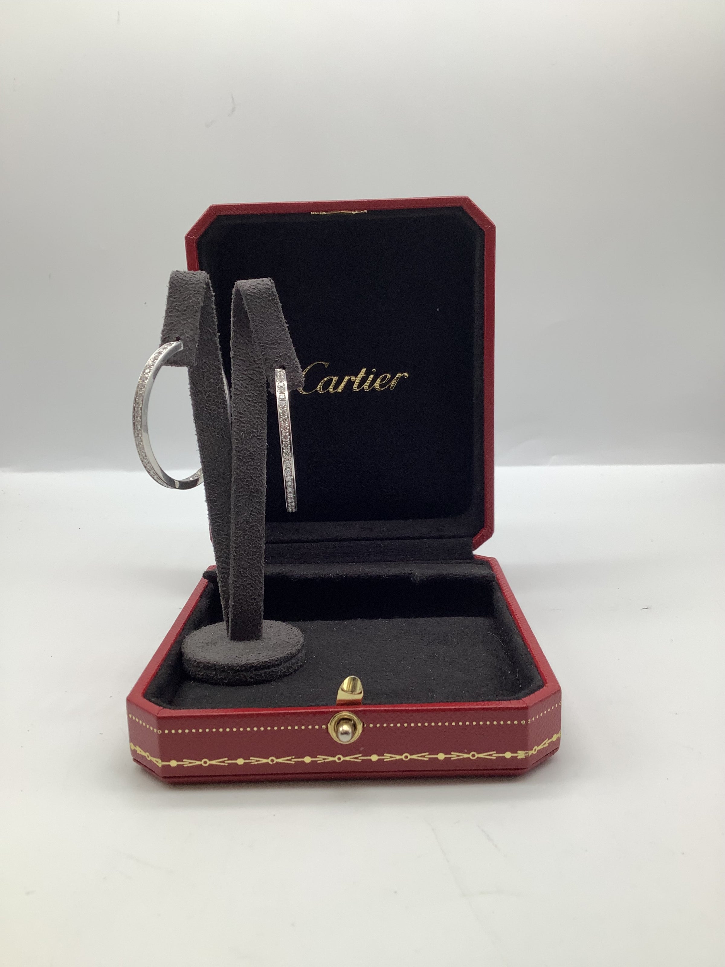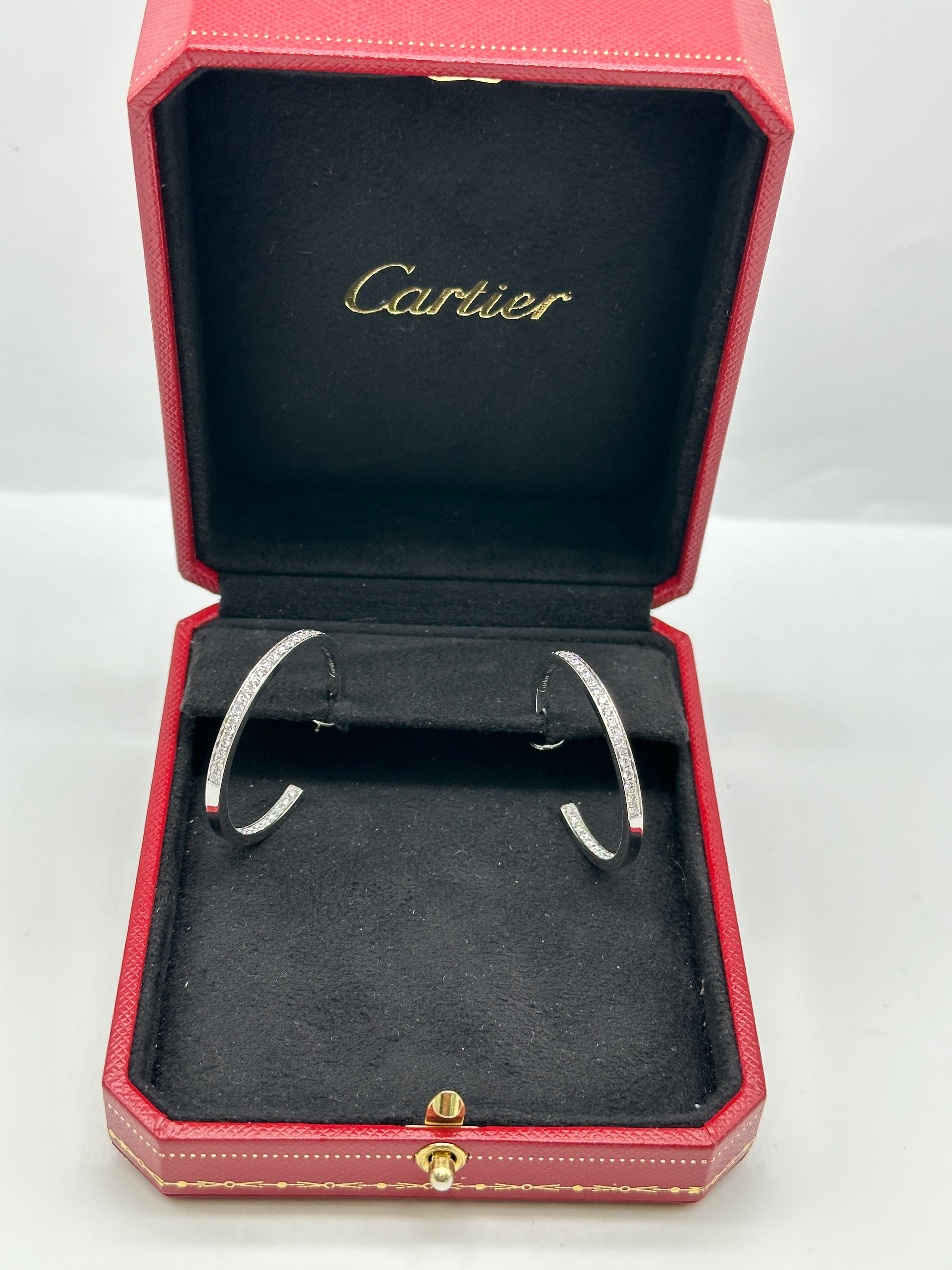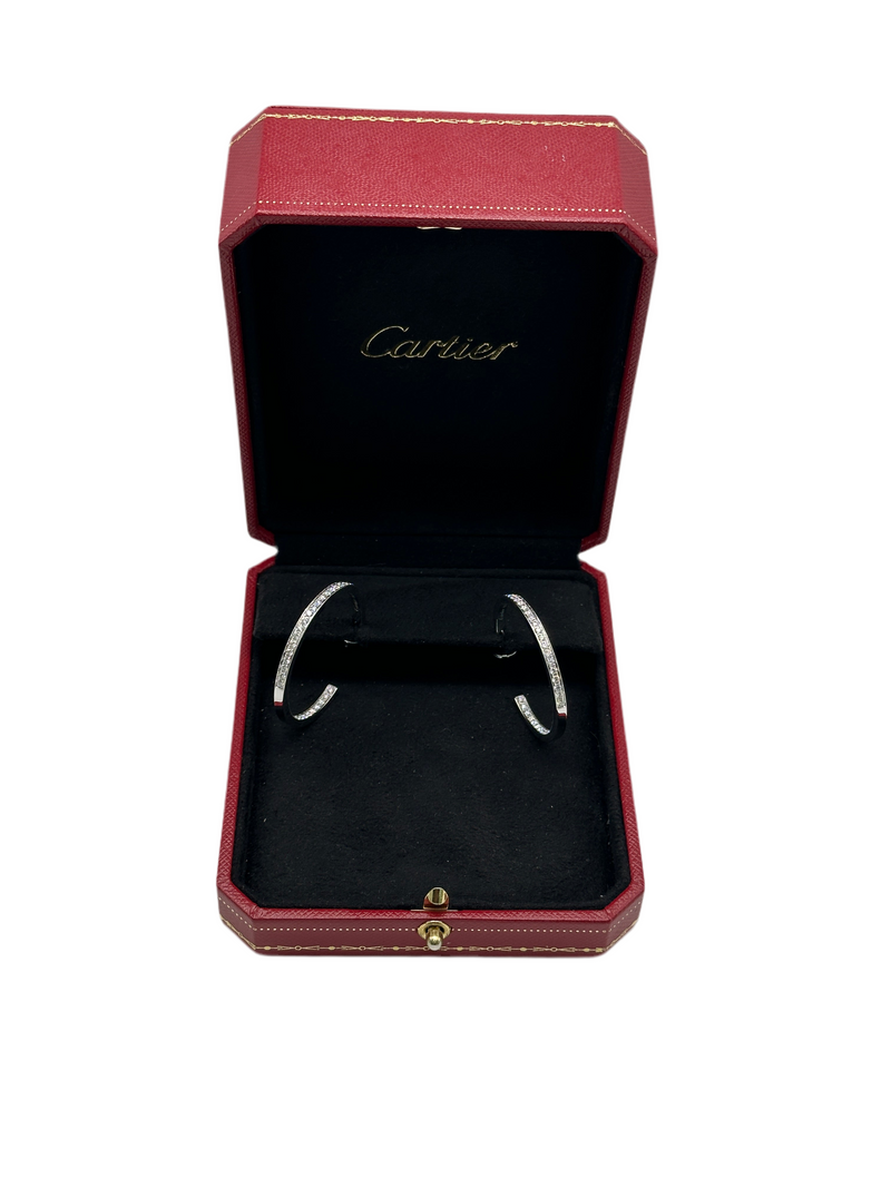 These exquisite Cartier hoop earrings are crafted in luxurious 18ct white gold and set with brilliant-cut diamonds in a sleek channel setting. Designed with diamonds on both the outer and inner curves, they maximise sparkle from every angle. The craftsmanship is flawless, with clean lines and a secure hinged fastening that ensures comfort and elegance. Their timeless silhouette makes them a versatile addition to any fine jewellery collection.