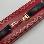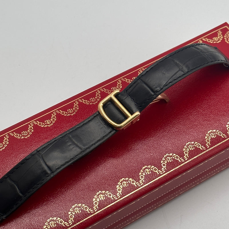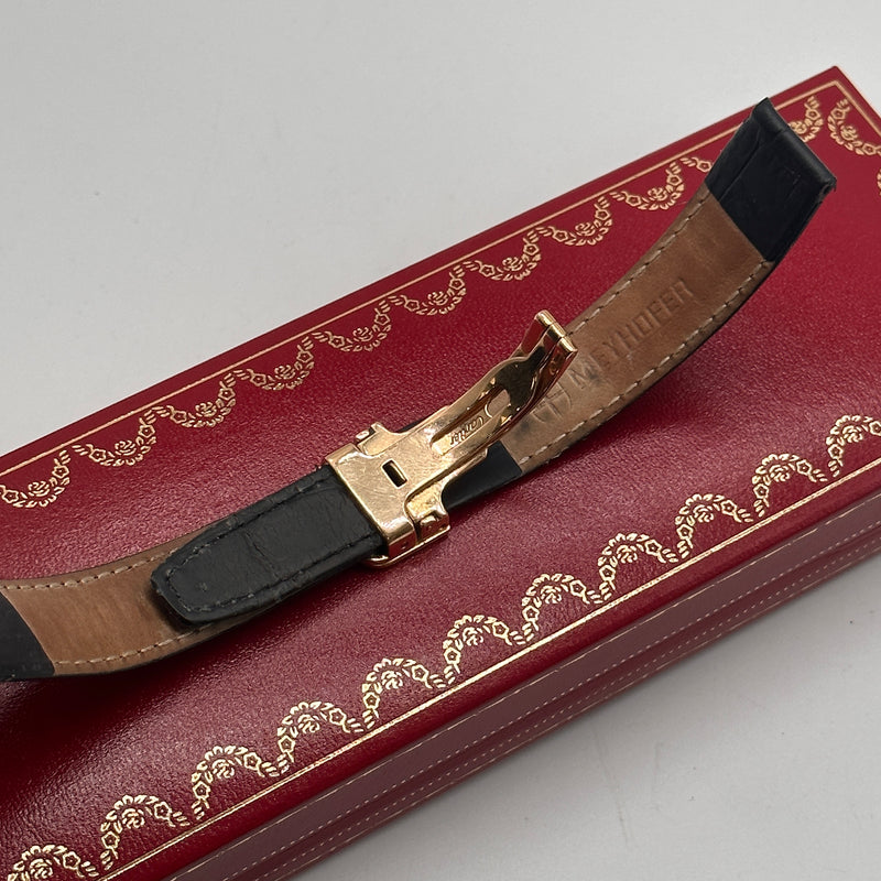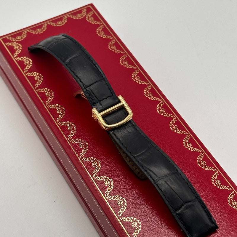 An original Cartier Strap, Black leather in great condition with minor signs of wear and still very sturdy, complemented by a solid 18ct yellow gold folding clasp.