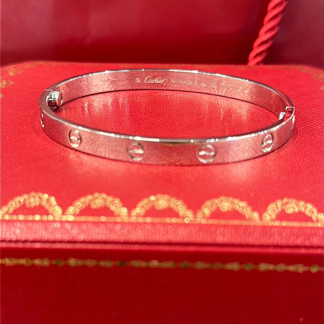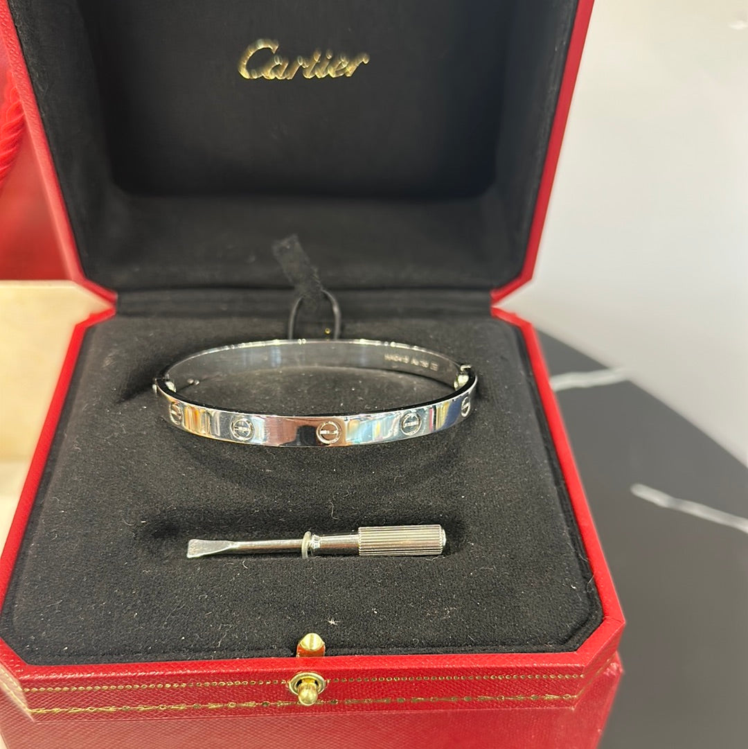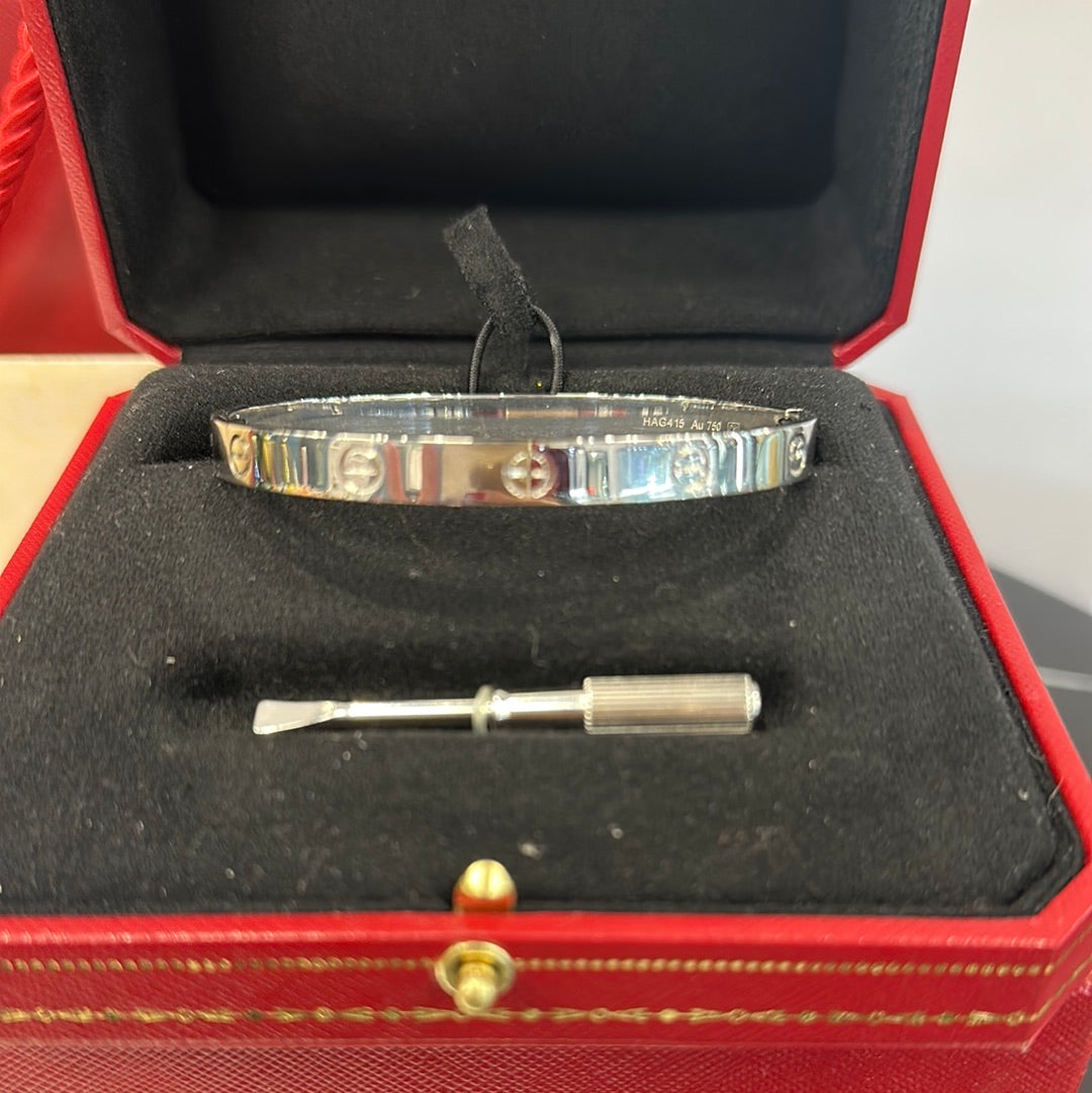 Cartier Love bracelet, white gold 750/1000. Comes with a screwdriver. Width: 6.1 mm. Created in New York in 1969, the LOVE bracelet is an icon of jewellery design: a close fitting, oval bracelet composed of two rigid arcs which is worn on the wrist and removed using a specific screwdriver. The closure is designed with two functional screws placed on either side of the bracelet: you will need help to open or close it. To determine the size of your LOVE bracelet, measure your wrist, adding one centimetre to your size for a tighter fit, or two centimetres for a looser fit.