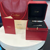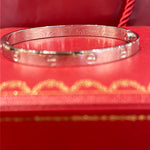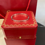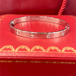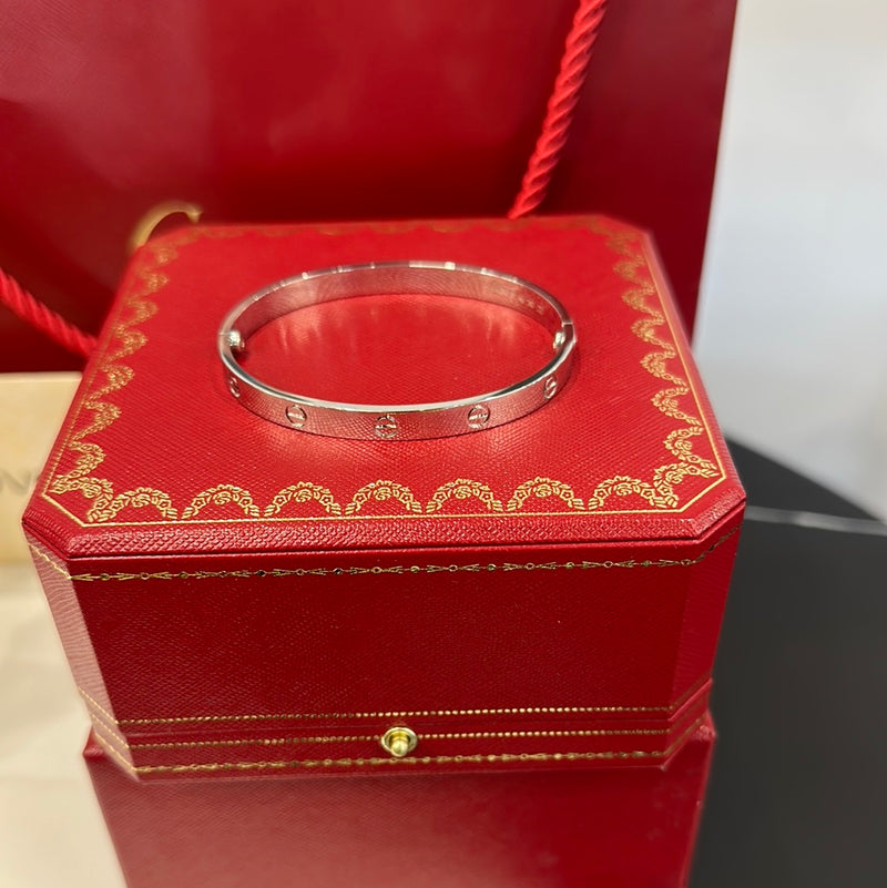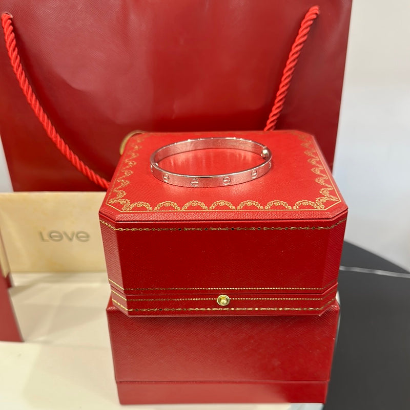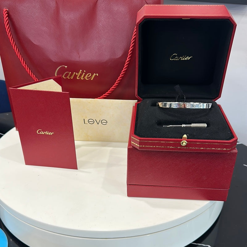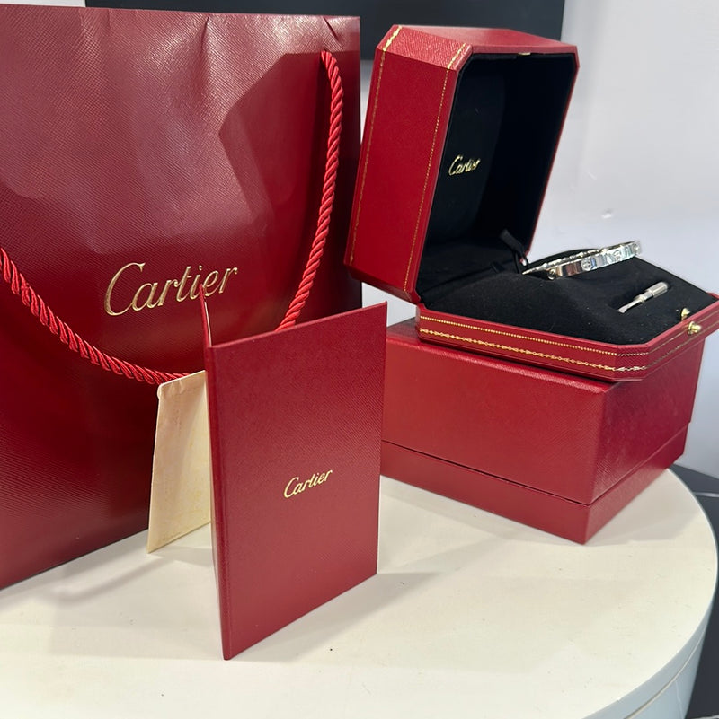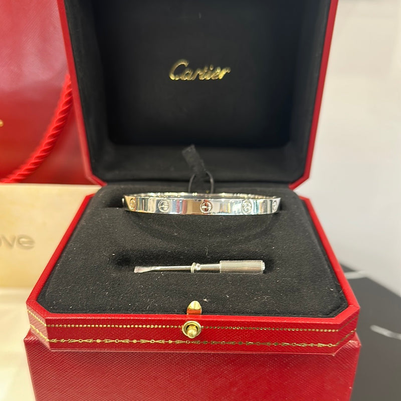 Cartier Love bracelet, white gold 750/1000. Comes with a screwdriver. Width: 6.1 mm. Created in New York in 1969, the LOVE bracelet is an icon of jewellery design: a close fitting, oval bracelet composed of two rigid arcs which is worn on the wrist and removed using a specific screwdriver. The closure is designed with two functional screws placed on either side of the bracelet: you will need help to open or close it. To determine the size of your LOVE bracelet, measure your wrist, adding one centimetre to your size for a tighter fit, or two centimetres for a looser fit.