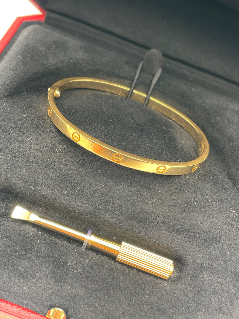 LOVE bracelet, small model, yellow gold 750/1000. Supplied with a screwdriver. Width: 3.65 mm. Now available in a slimmer version, Cartier continues to write the story of the LOVE bracelet. Same design, same oval shape, same story: a timeless – yet slightly slimmer – creation which is fastened using a screwdriver. The closure is designed with a functional screw on one side of the bracelet and a hinge on the other.