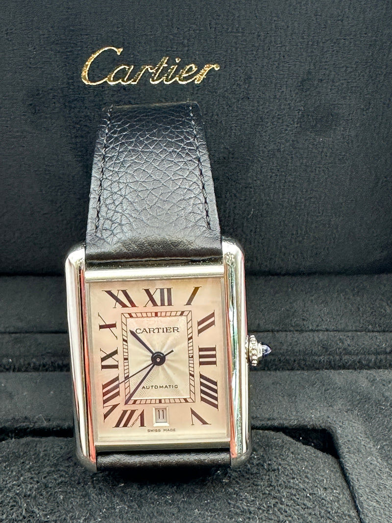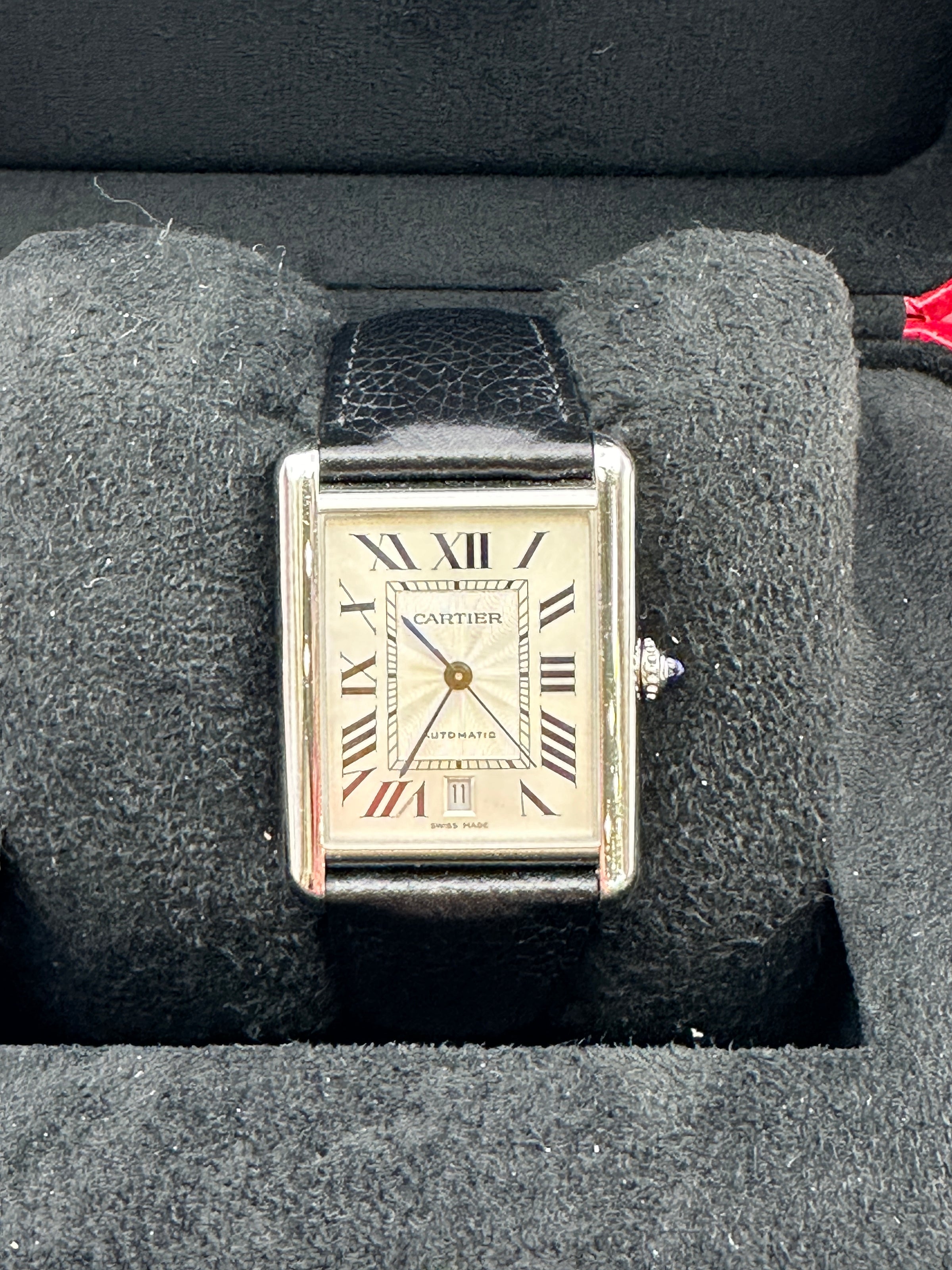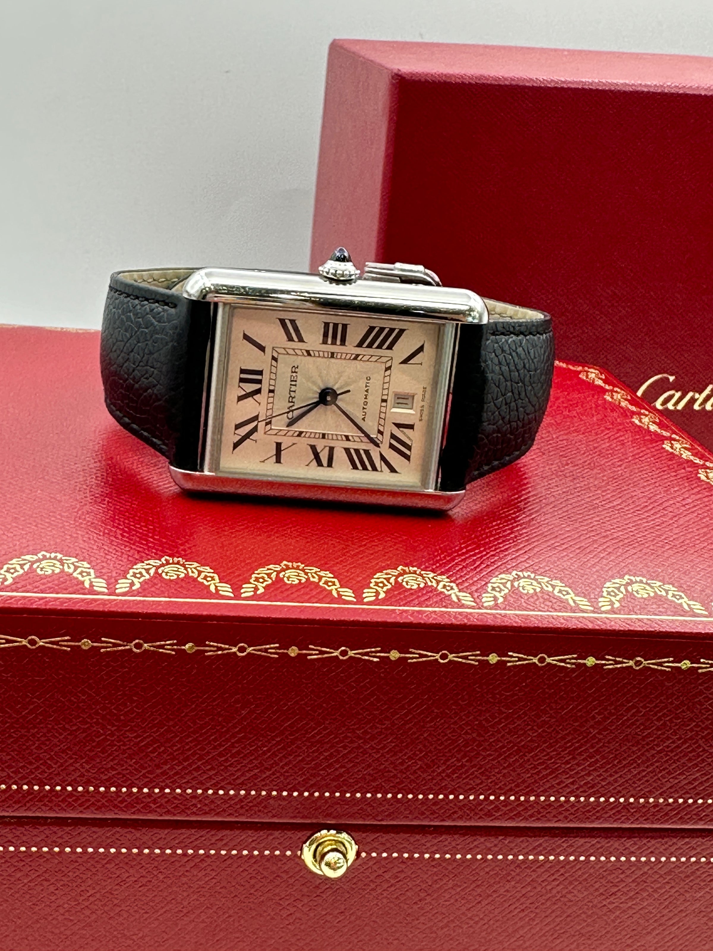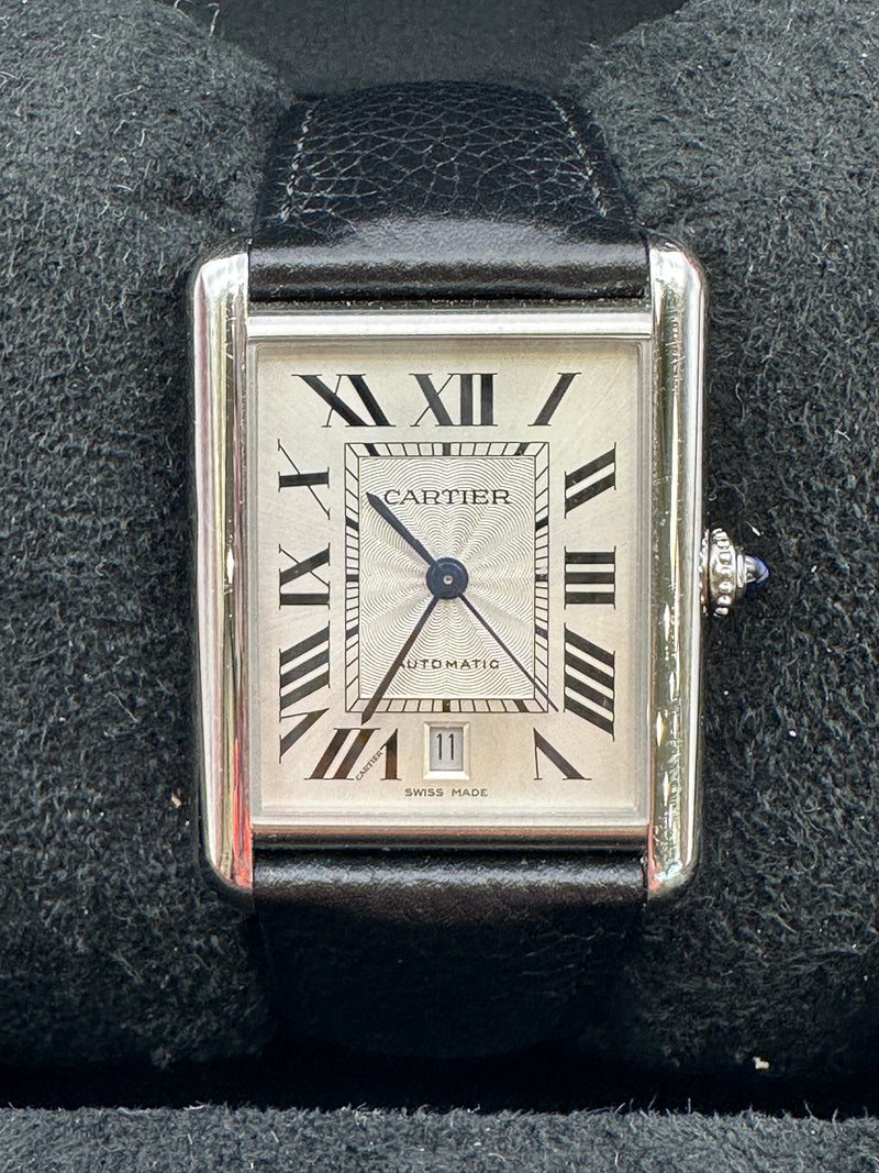 Tank Must watch, extra-large model, mechanical movement with automatic winding, calibre. Steel case, beaded crown set with a synthetic cabochon-shaped spinel, silvered flinqué dial, blued-steel sword-shaped hands, black grained calfskin strap, interchangeable steel folding buckle, calendar aperture at 6 o'clock. Case dimensions: 41 mm x 31 mm, thickness: 8.4 mm. Water-resistant to 3 bar (approx. 30 metres).