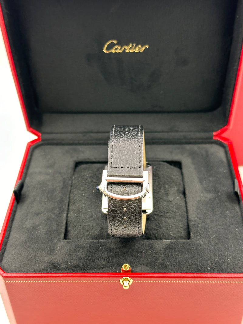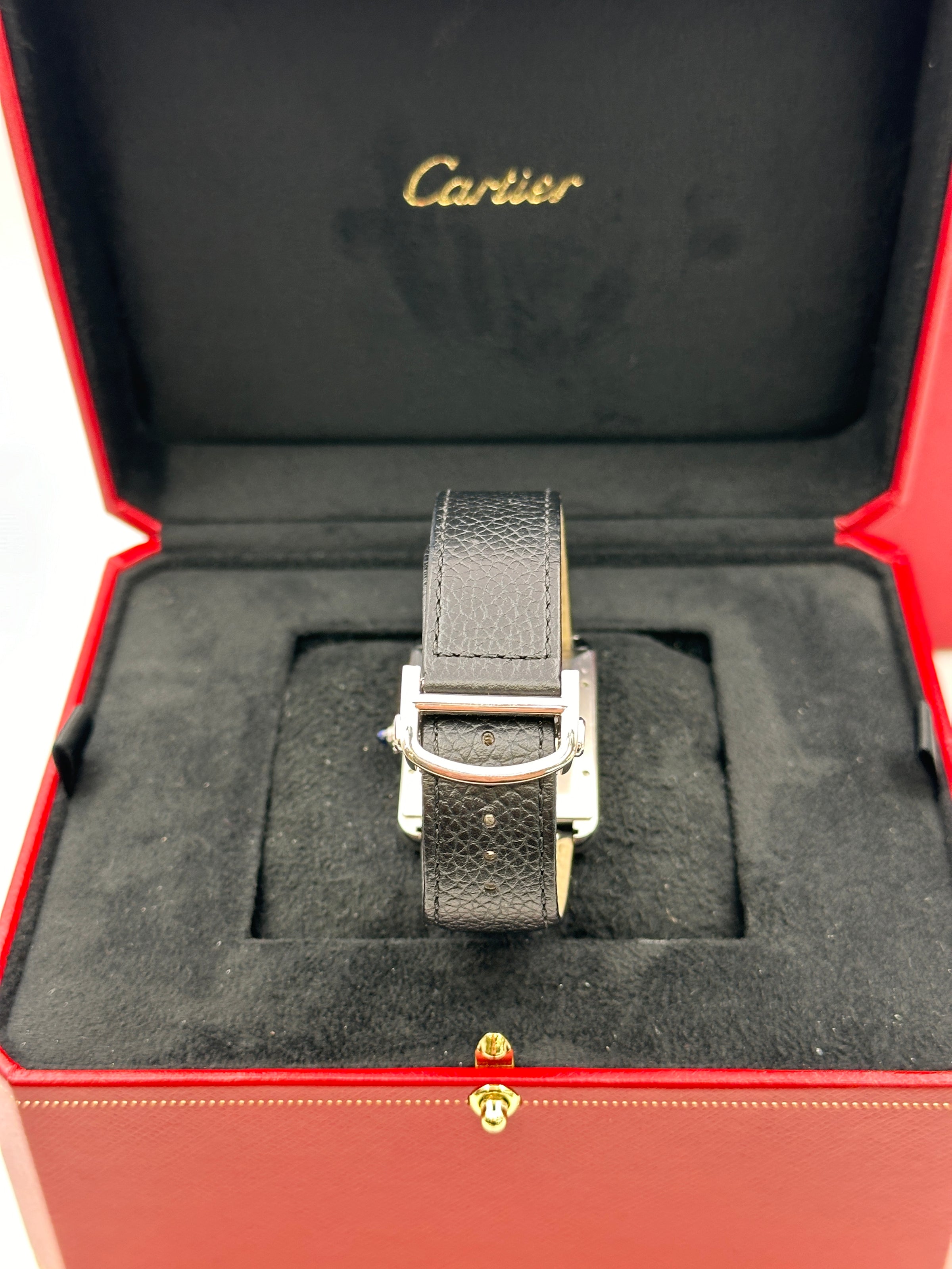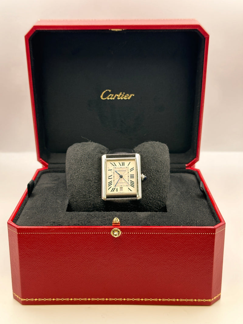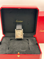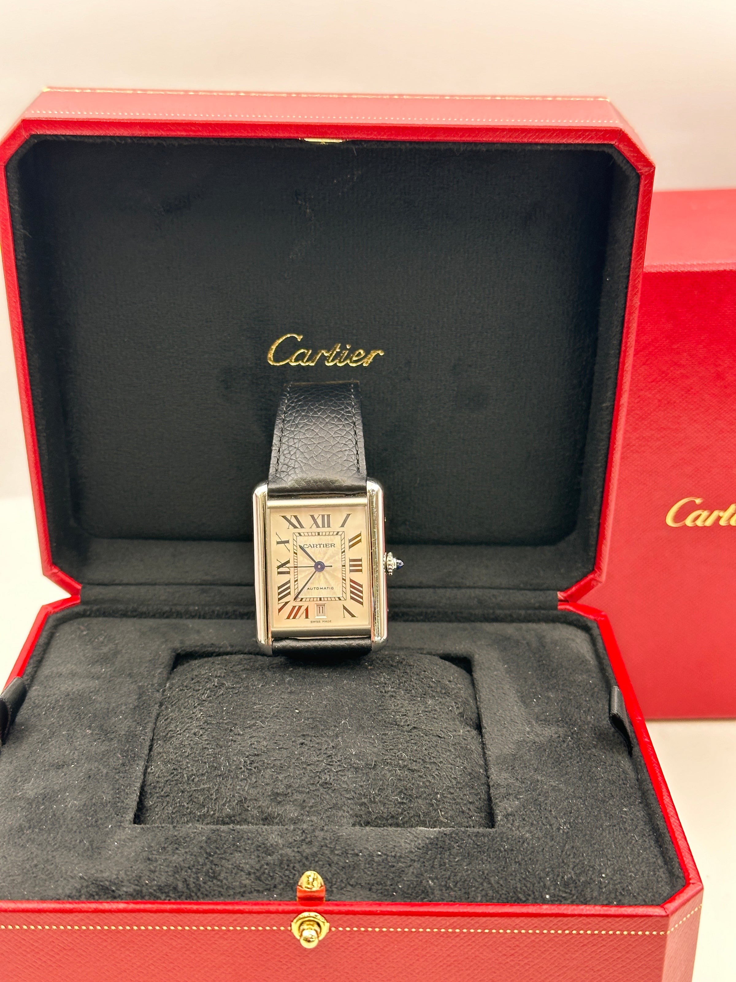 Tank Must watch, extra-large model, mechanical movement with automatic winding, calibre. Steel case, beaded crown set with a synthetic cabochon-shaped spinel, silvered flinqué dial, blued-steel sword-shaped hands, black grained calfskin strap, interchangeable steel folding buckle, calendar aperture at 6 o'clock. Case dimensions: 41 mm x 31 mm, thickness: 8.4 mm. Water-resistant to 3 bar (approx. 30 metres).