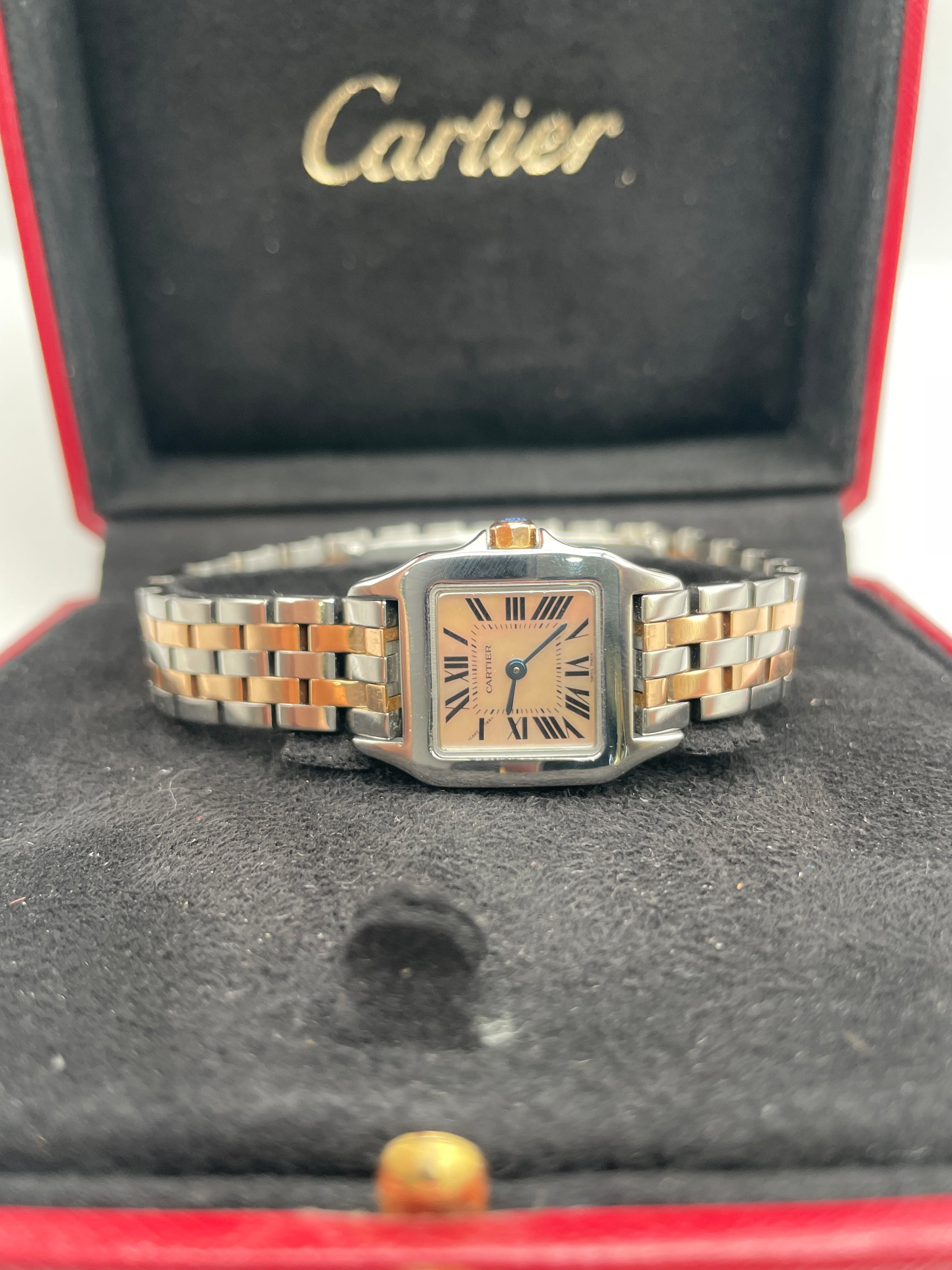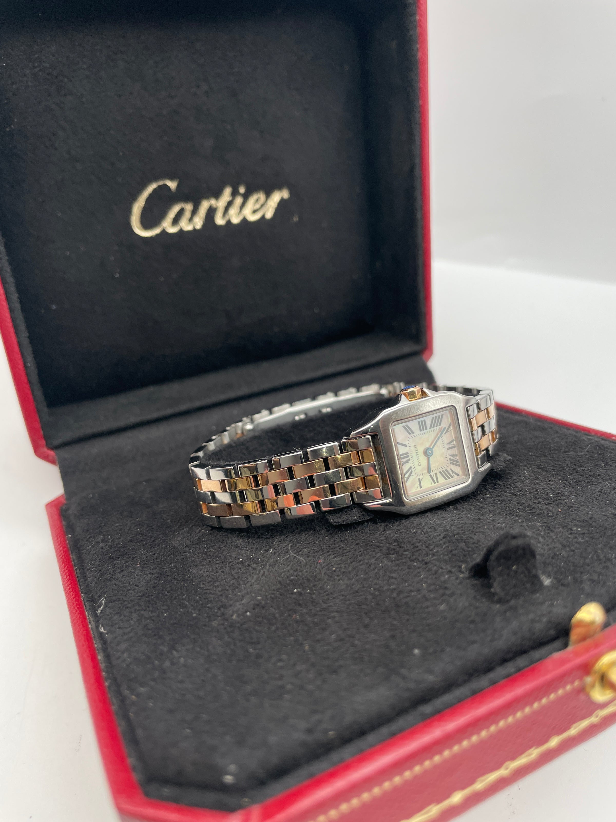 This Cartier Santos Demoiselle watch is known for its exquisite craftsmanship and luxurious design. It bodes a stainless steel and rose gold bracelet showcasing both durability and elegance. The watch's mother-of-pearl face adds a touch of opulence and sophistication.