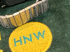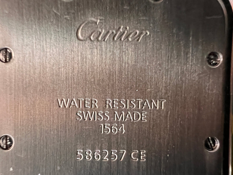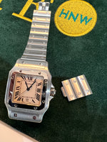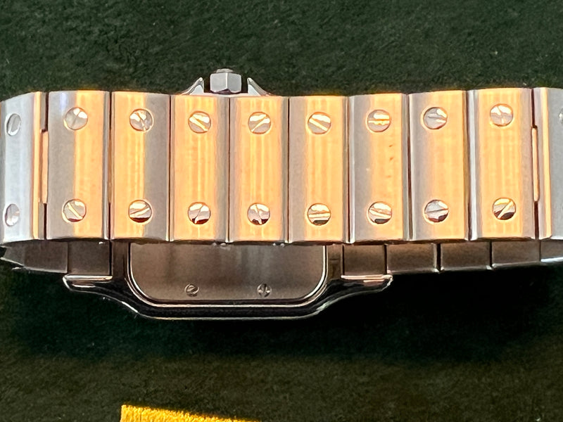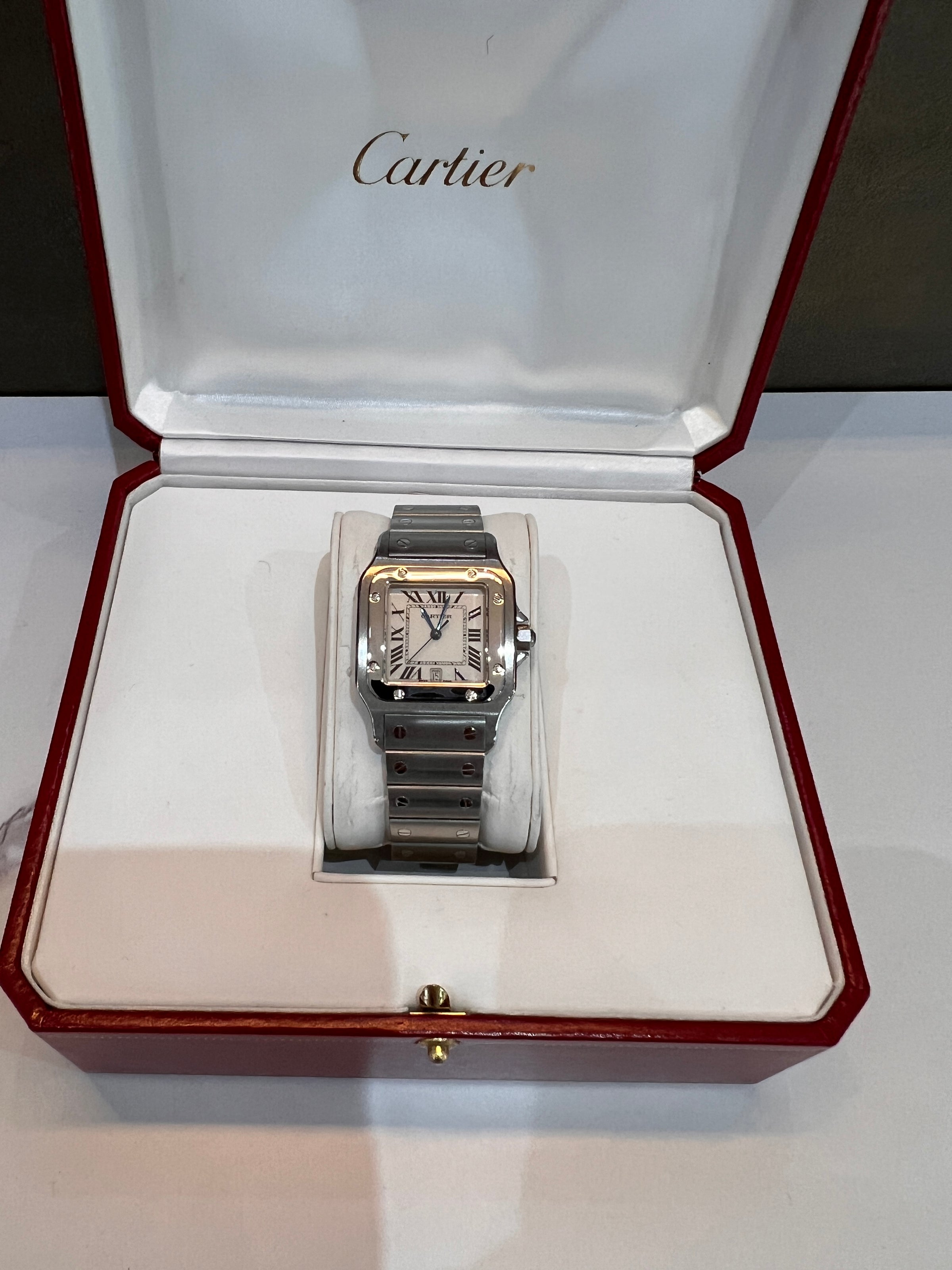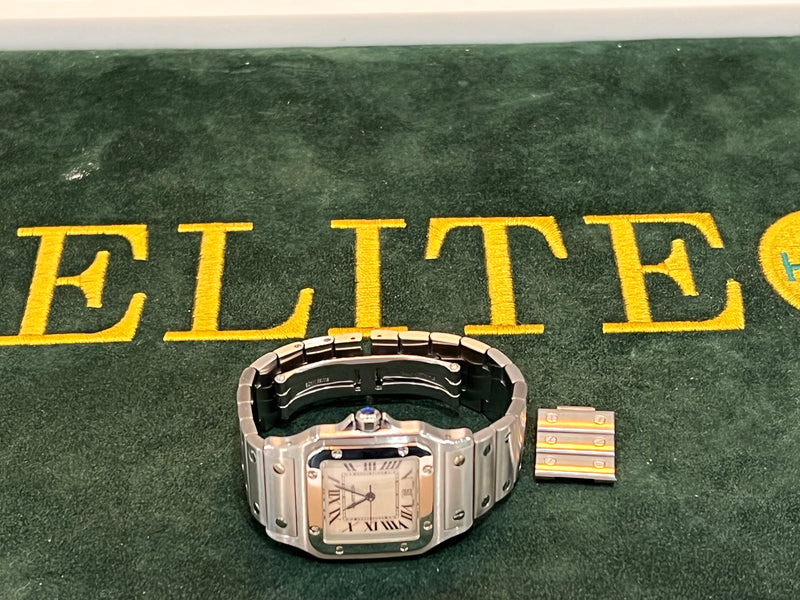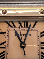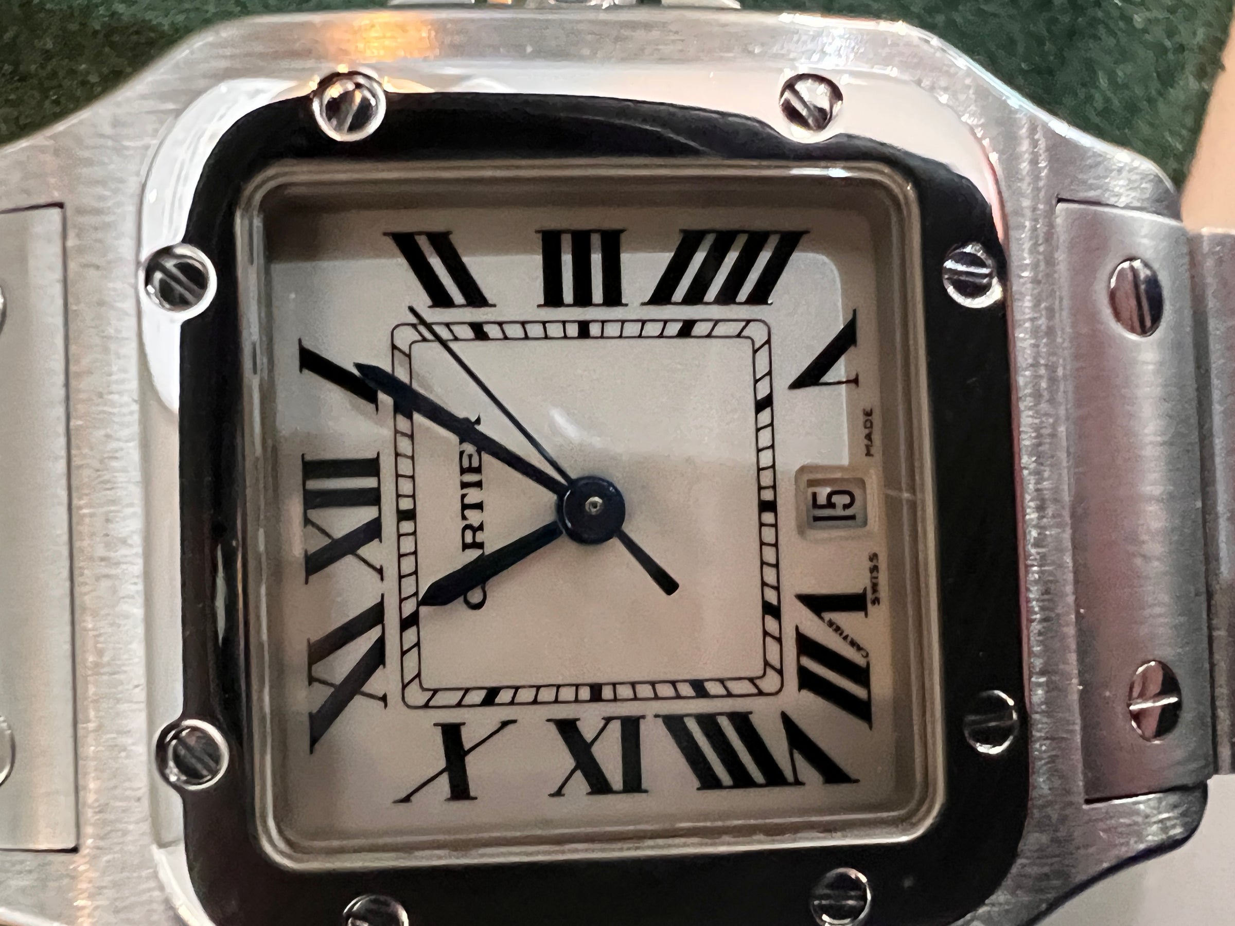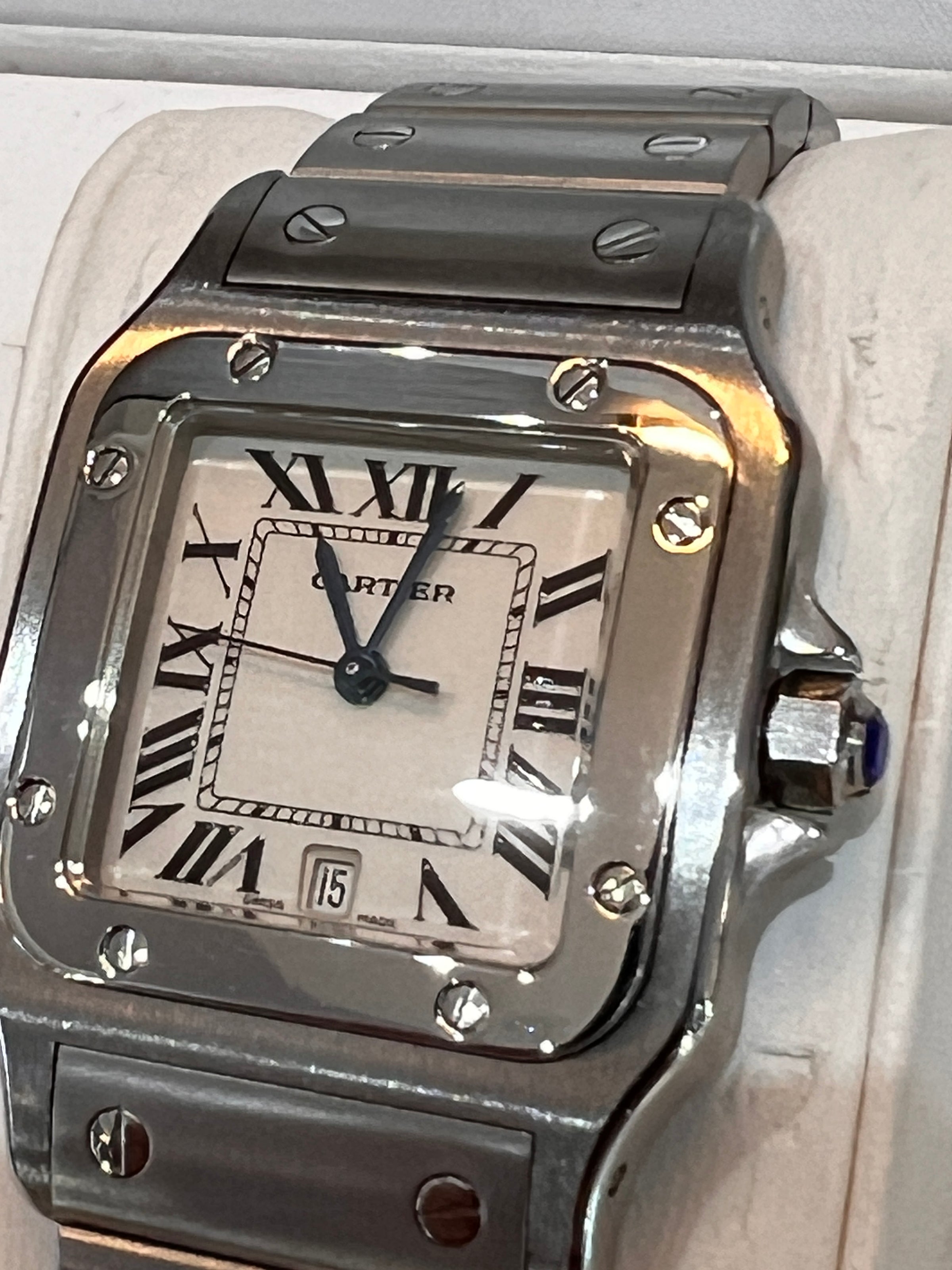 This Cartier Santos features a mid size stainless steel case, stainless steel bezel, white dial with black roman numerals and a stainless steel bracelet with stainless steel screws.