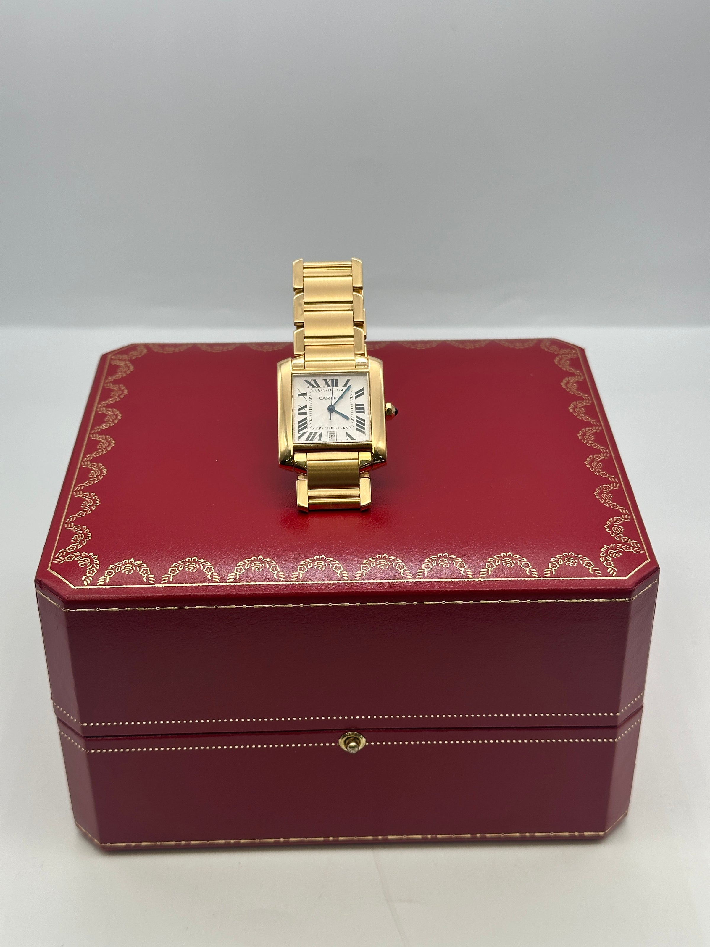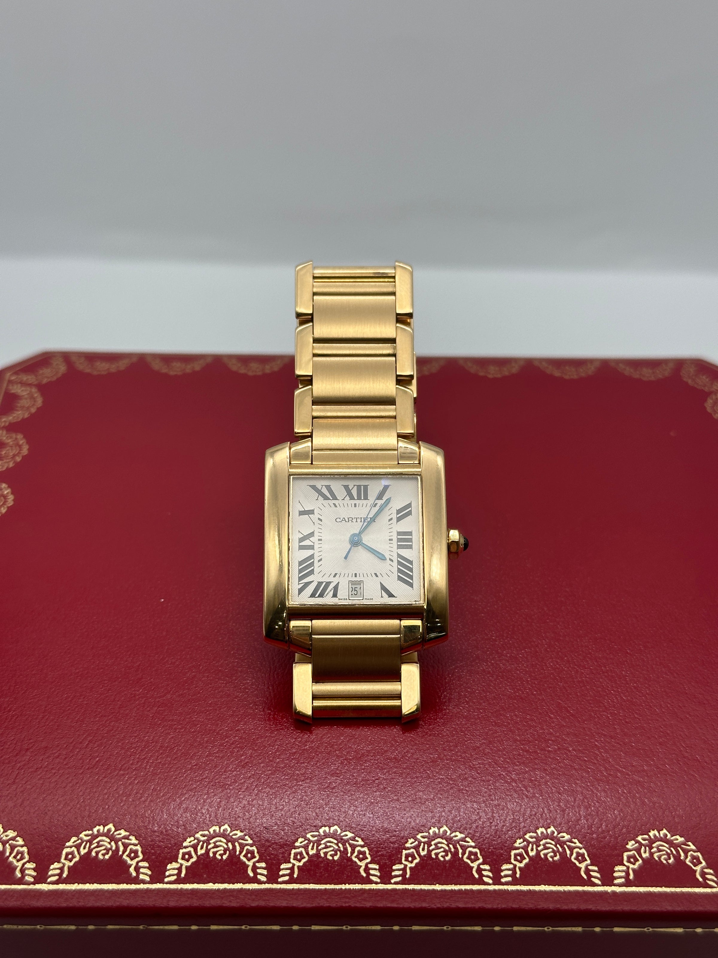 This mid size Cartier Tank Francaise features a 28mm solid 18k yellow gold case, silver dial, black roman numeral hour markers, sapphire crystal, 18k yellow gold crown set with a blue blue cabochon, and a 18k yellow gold bracelet.