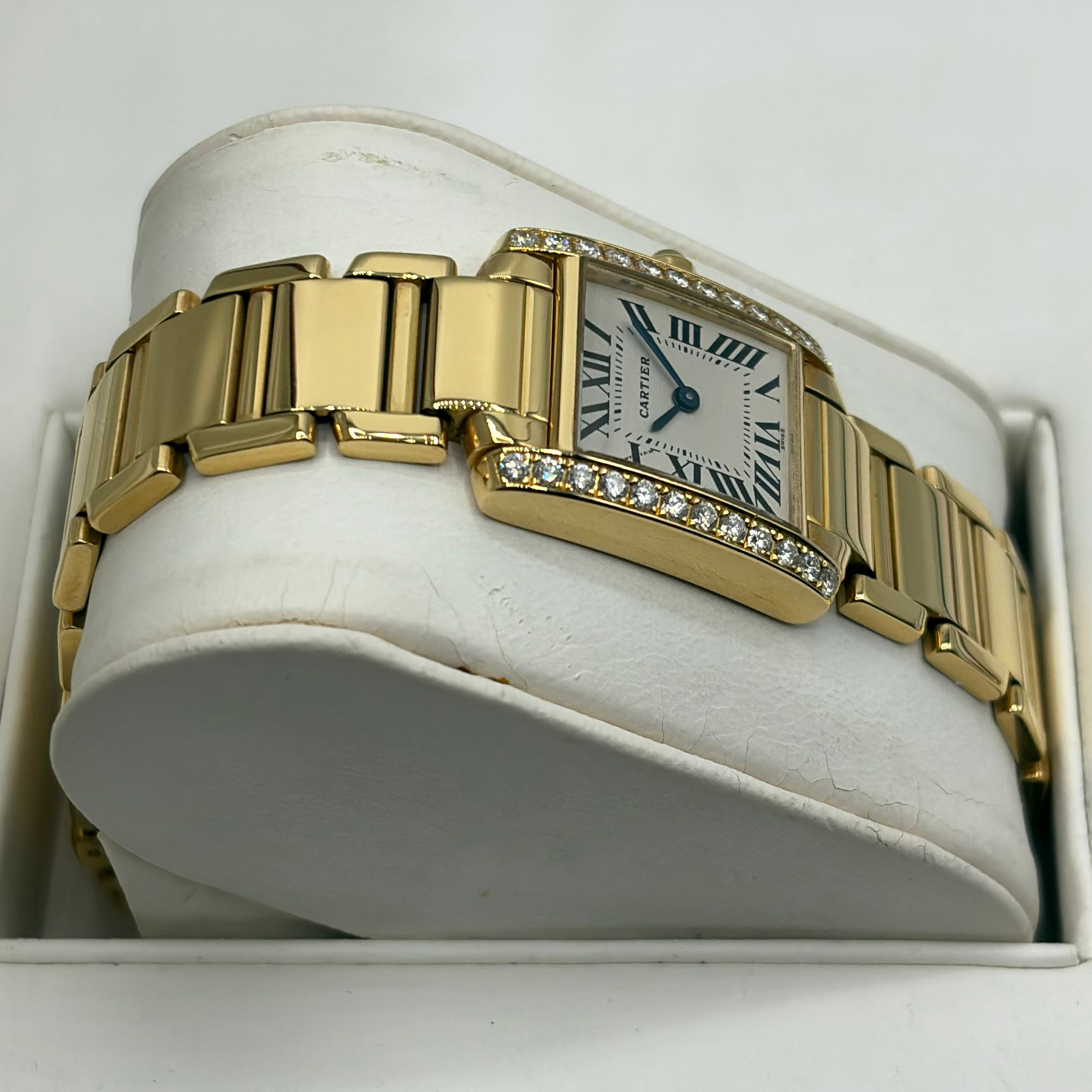 This Cartier Tank Française Ref. 2385 in 18-carat yellow gold with factory-set diamonds is a refined and luxurious watch that embodies the elegance of Cartier design. Crafted from solid 18-carat yellow gold, the 20mm case, factory set with the highest quality diamonds, pairs with the signature integrated gold bracelet that defines the Tank Française silhouette. The watch features an ivory dial with classic Roman numerals, blued steel sword-shaped hands and a cabochon-set crown. Powered by a precise Cartier quartz movement, it offers effortless reliability with minimal maintenance.
